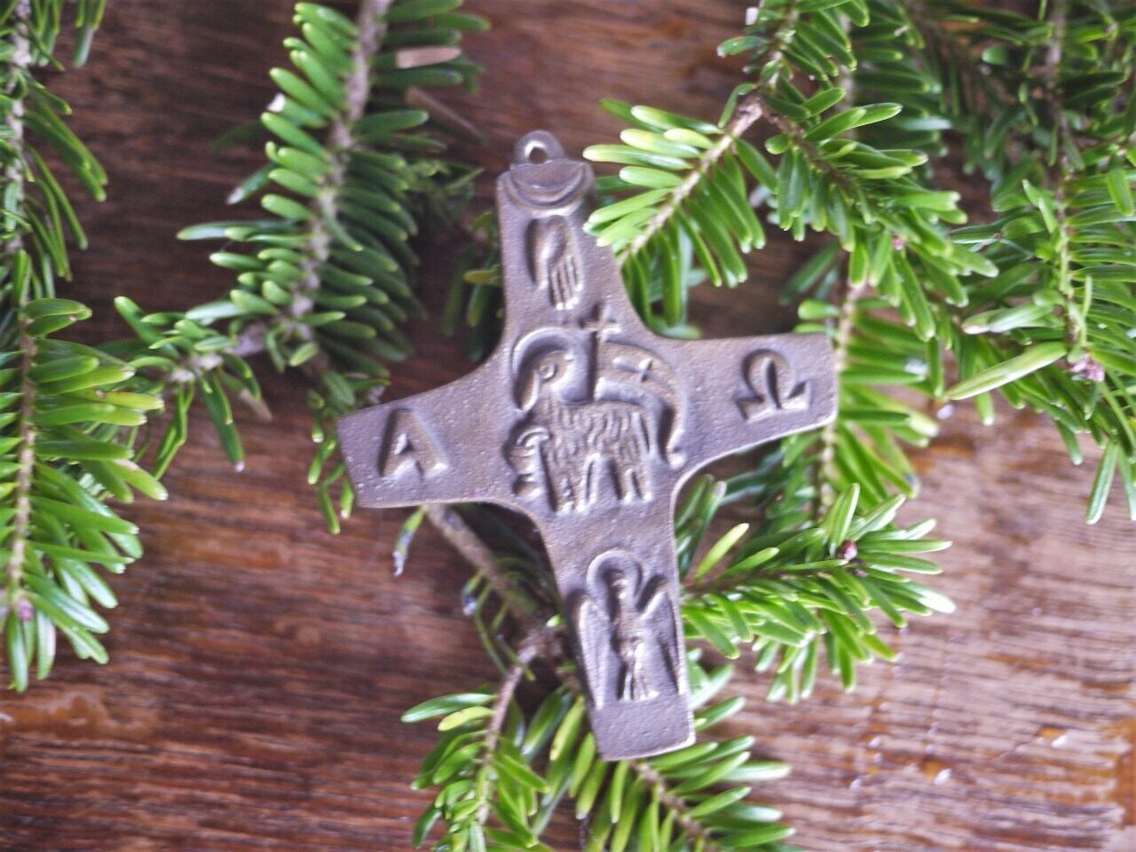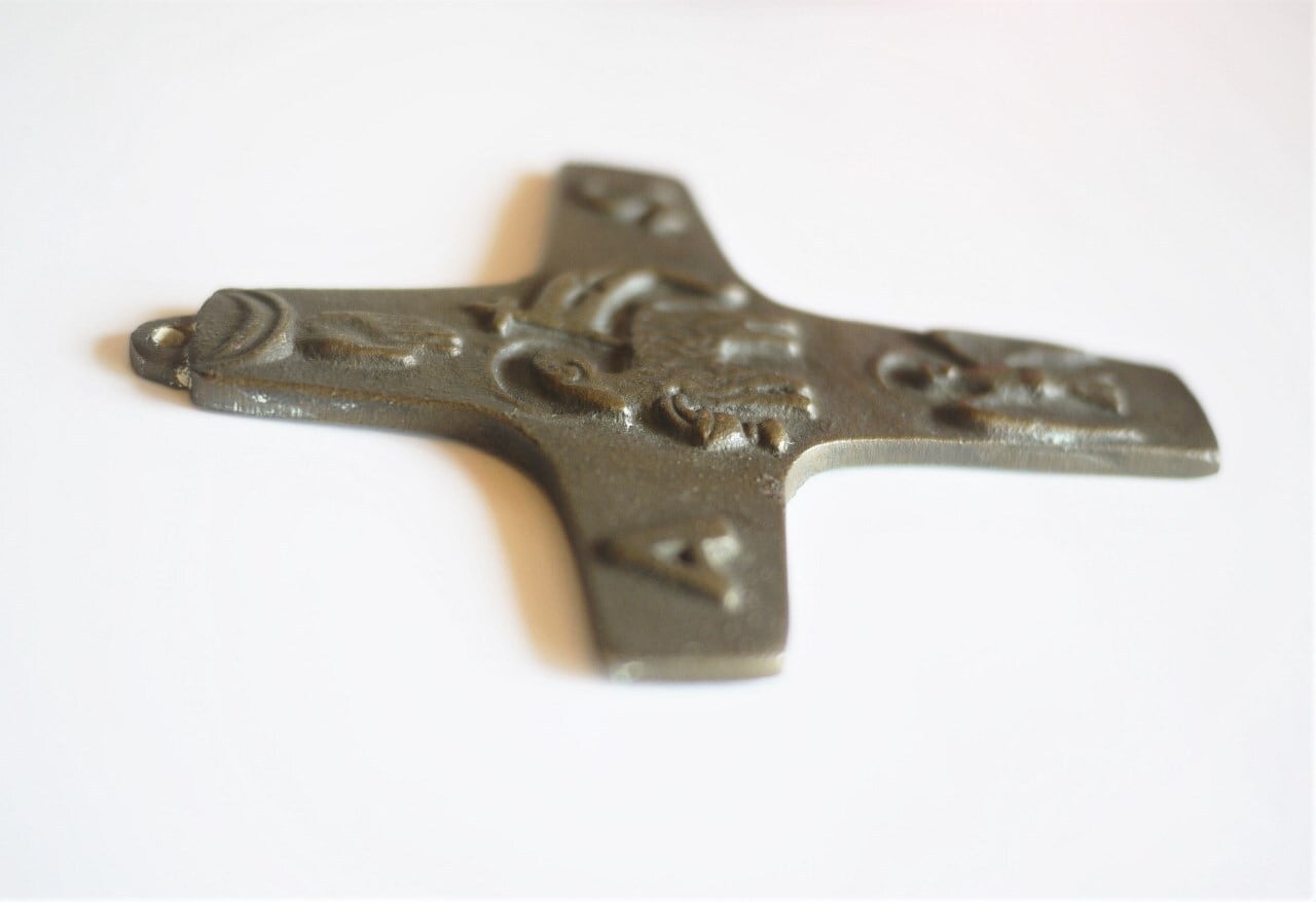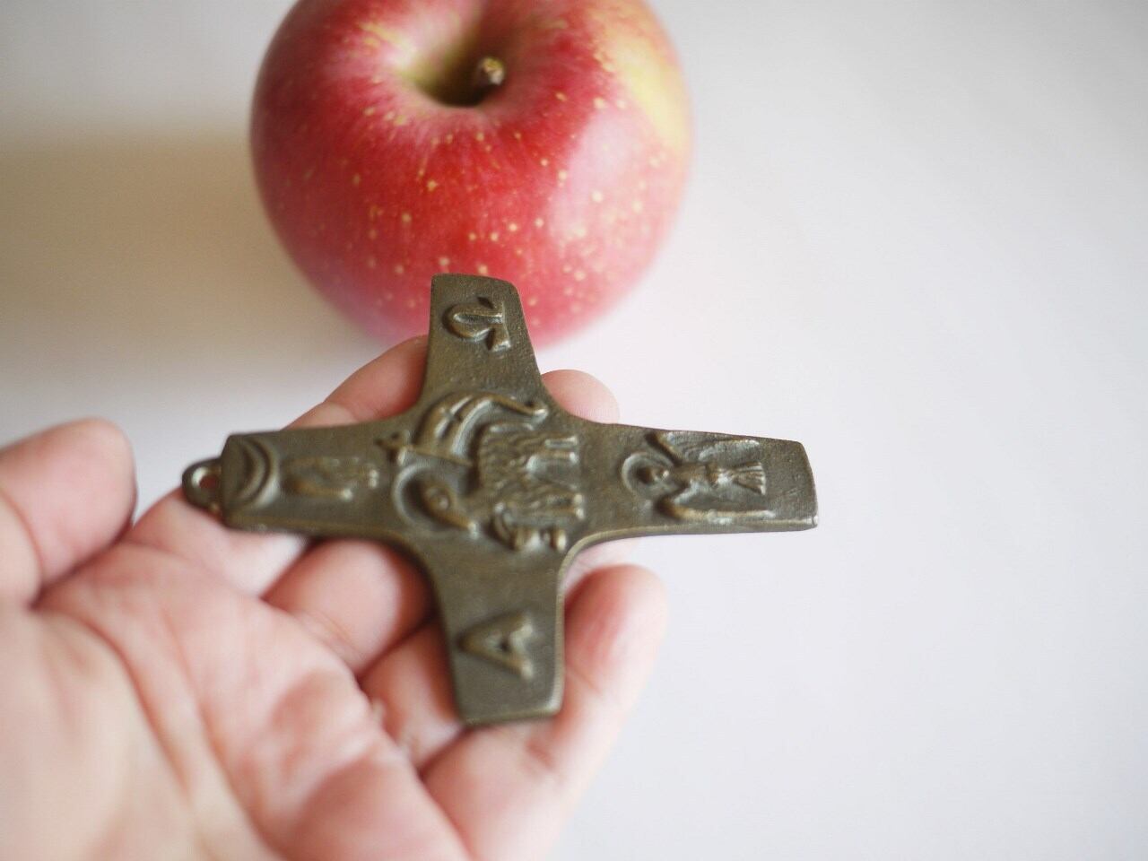 ブロンズまたは真鍮の色合いの金属でできたクロス飾りです。