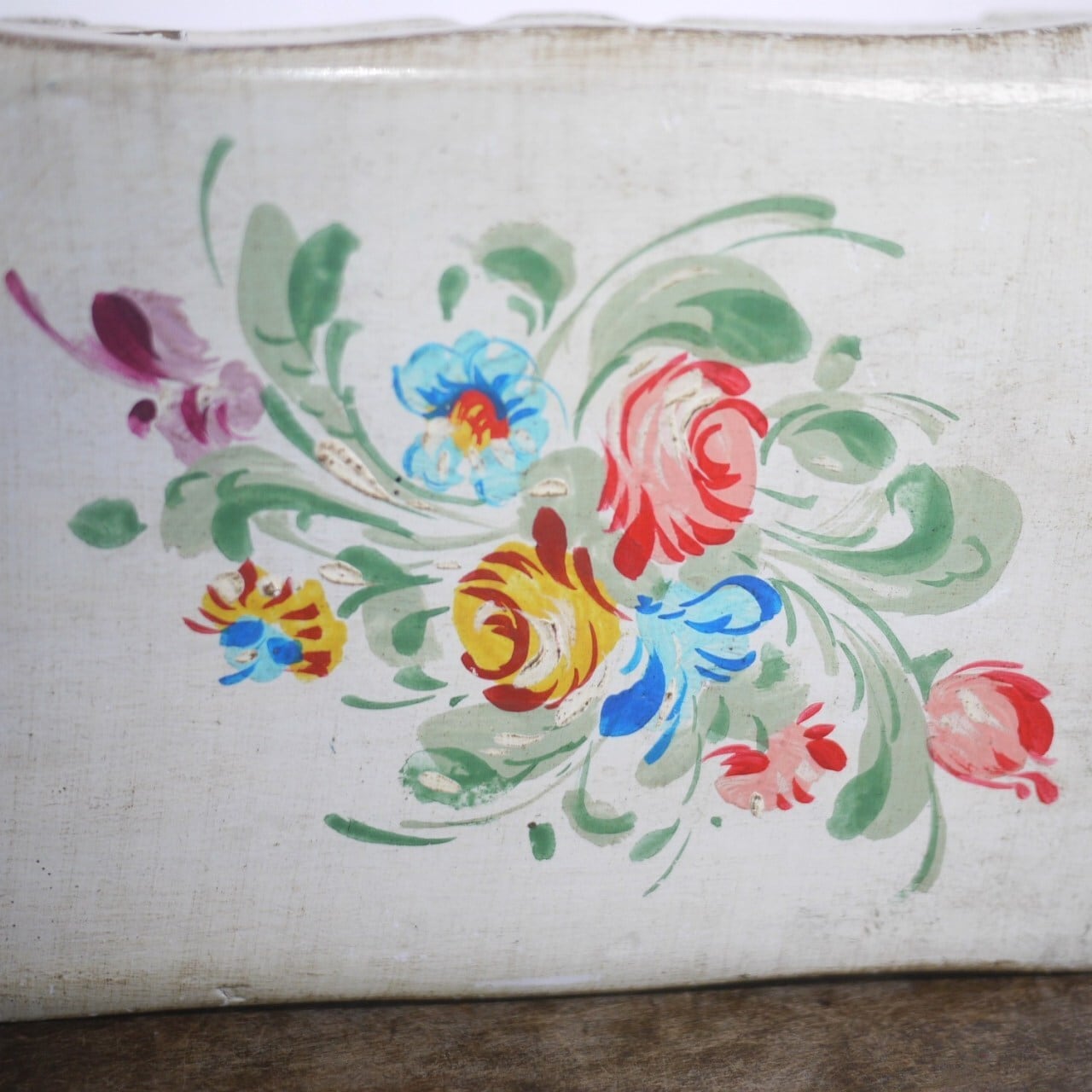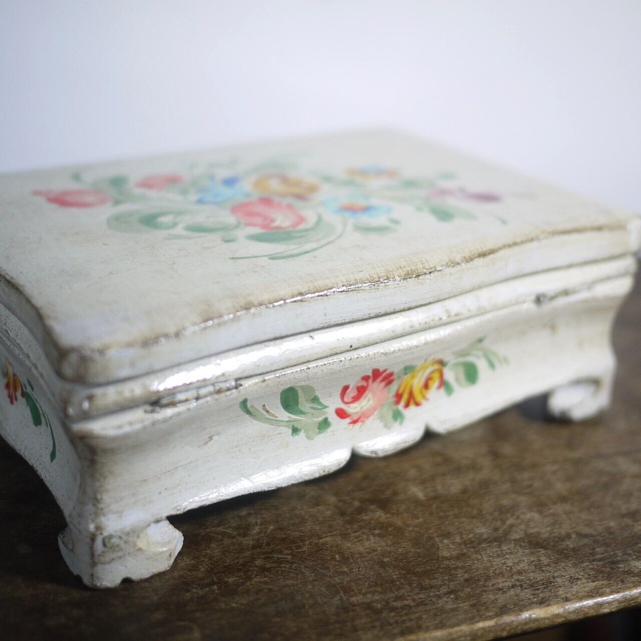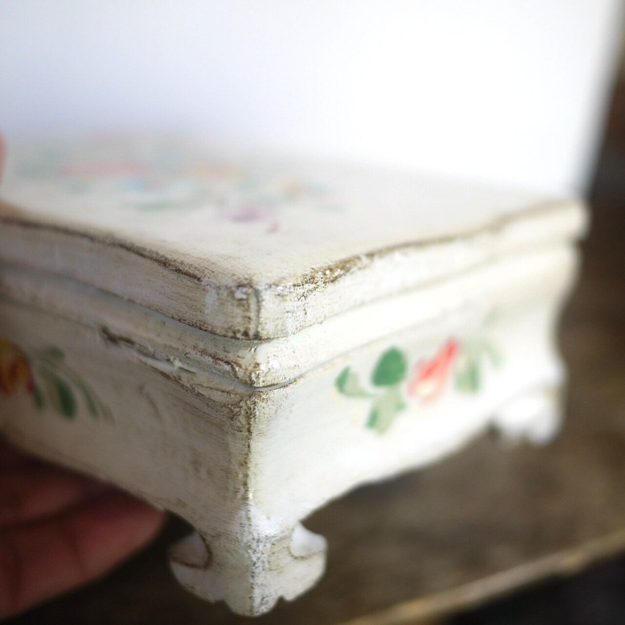 オフホワイトのボックス、ハンドペイントの花が美しい足付木箱