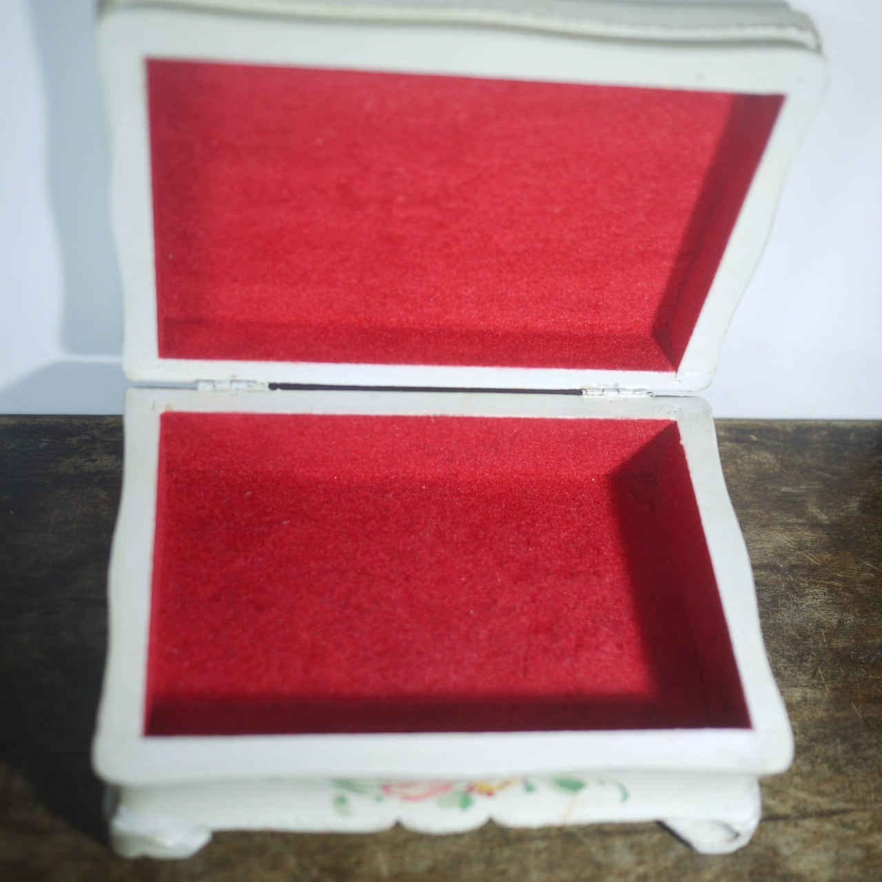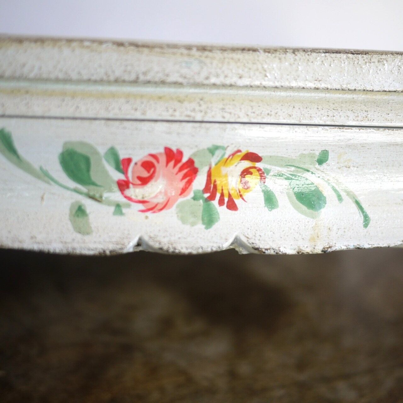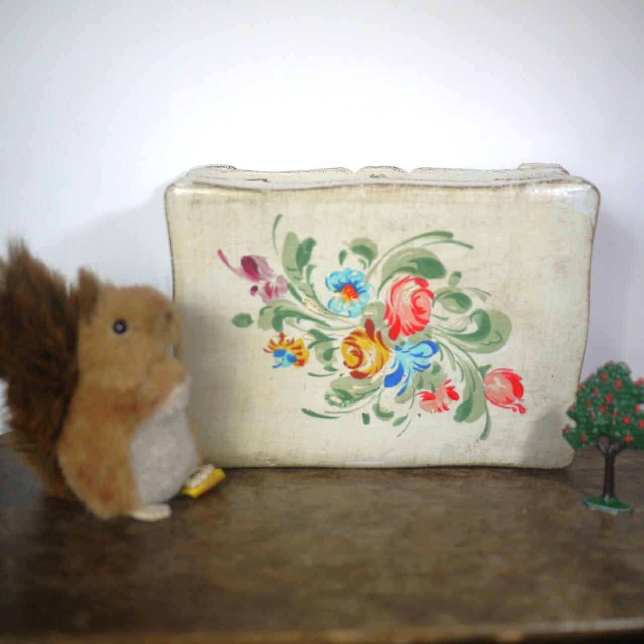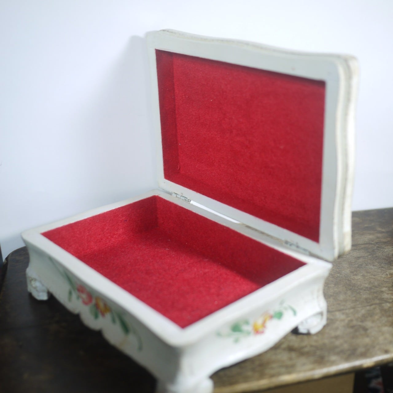 オフホワイトのボックス、ハンドペイントの花が美しい足付木箱