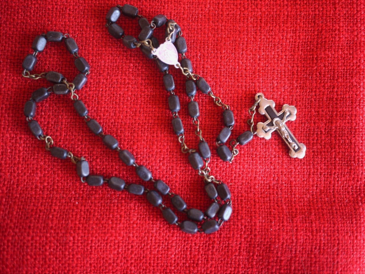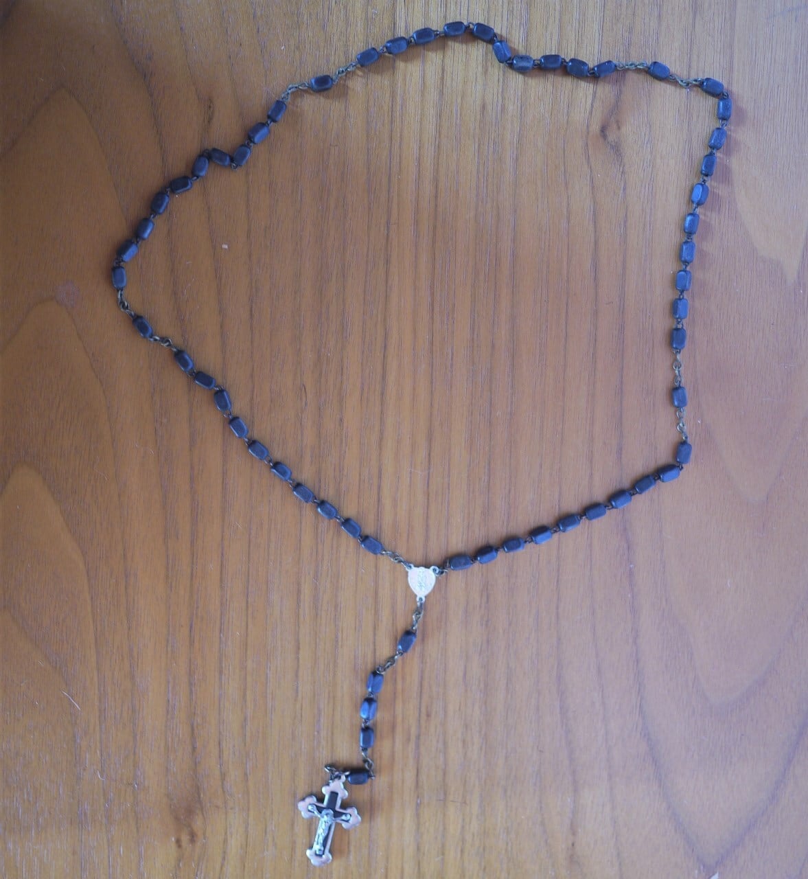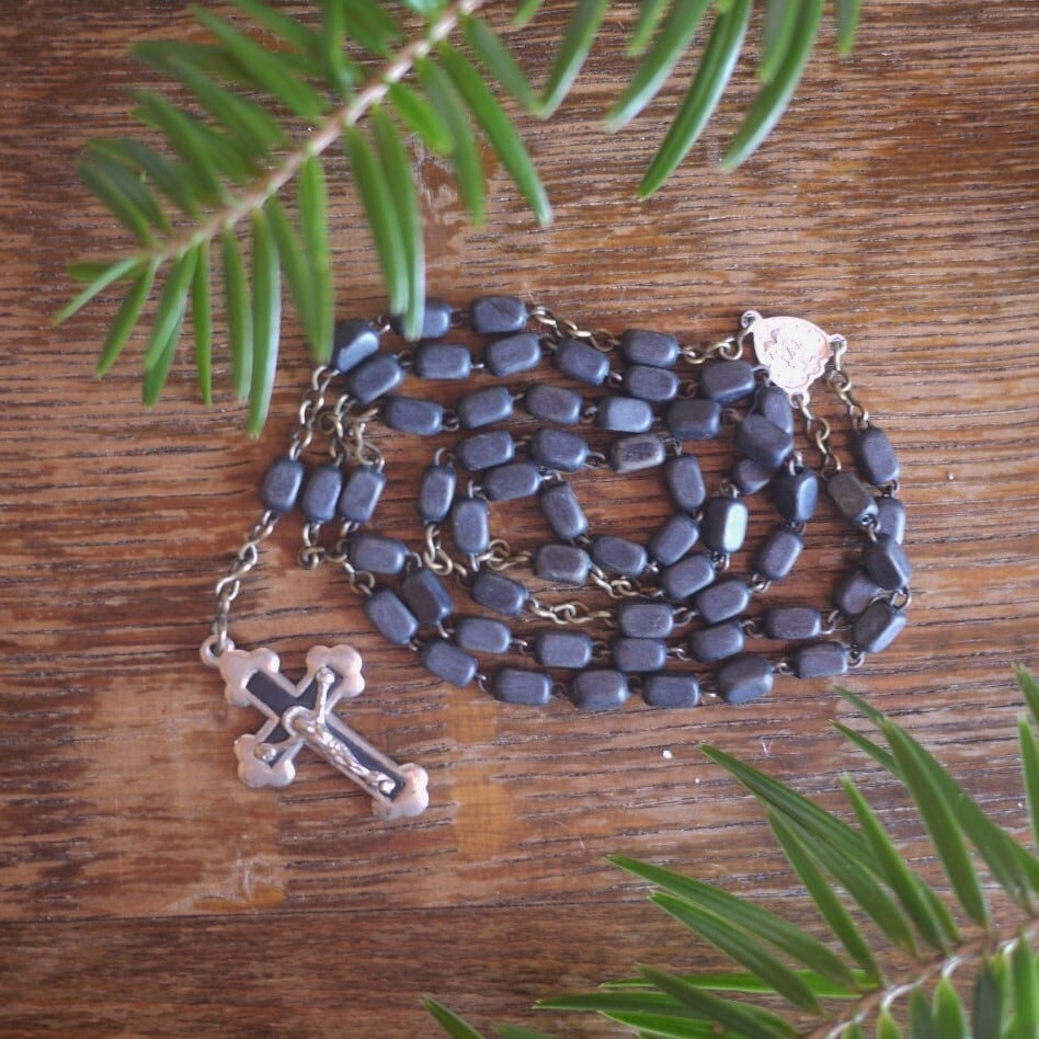細かい角柱型の木のビーズをつないだロザリオ。
