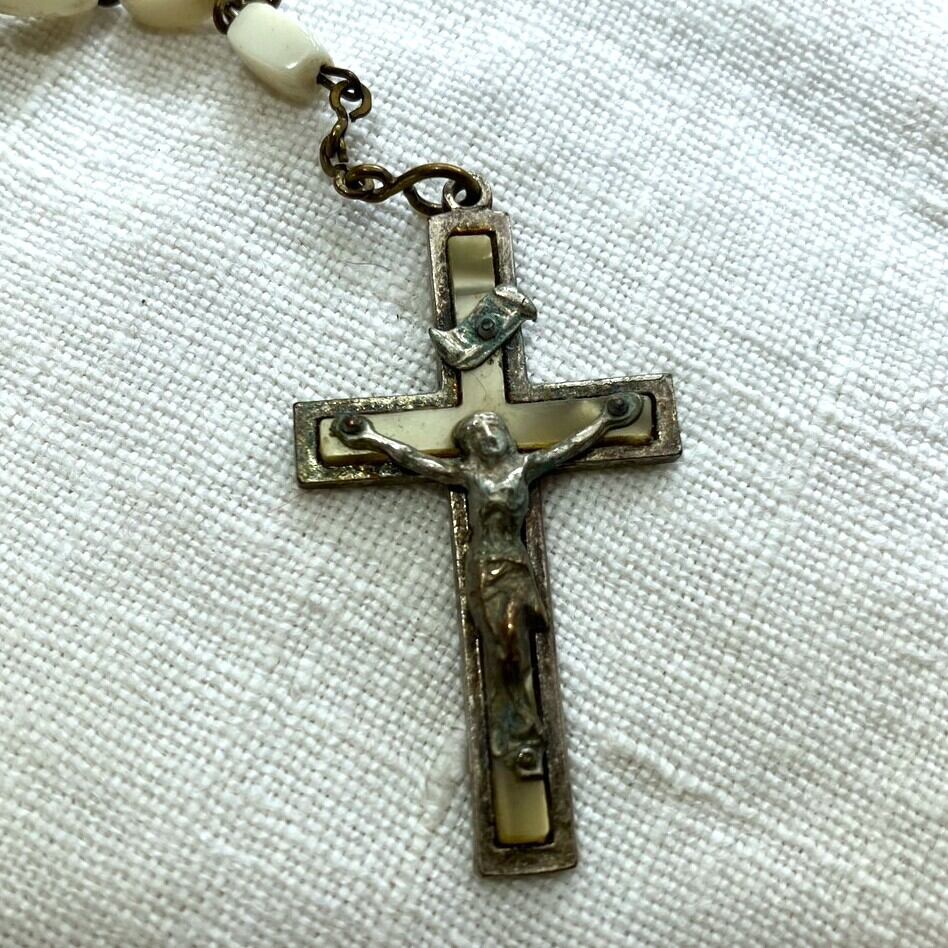 貝細工の上に磔刑のイエス像を乗せたクロスです。