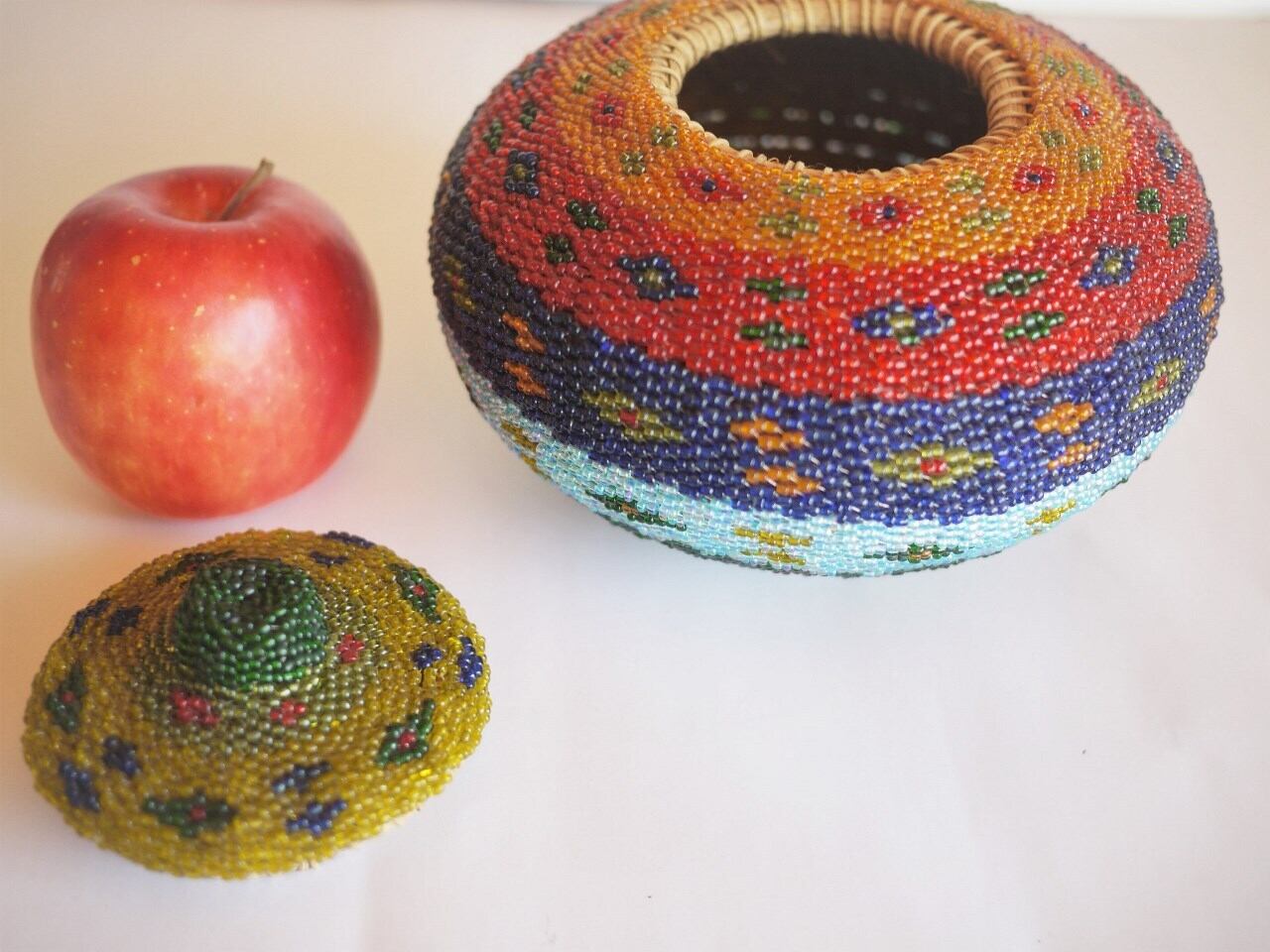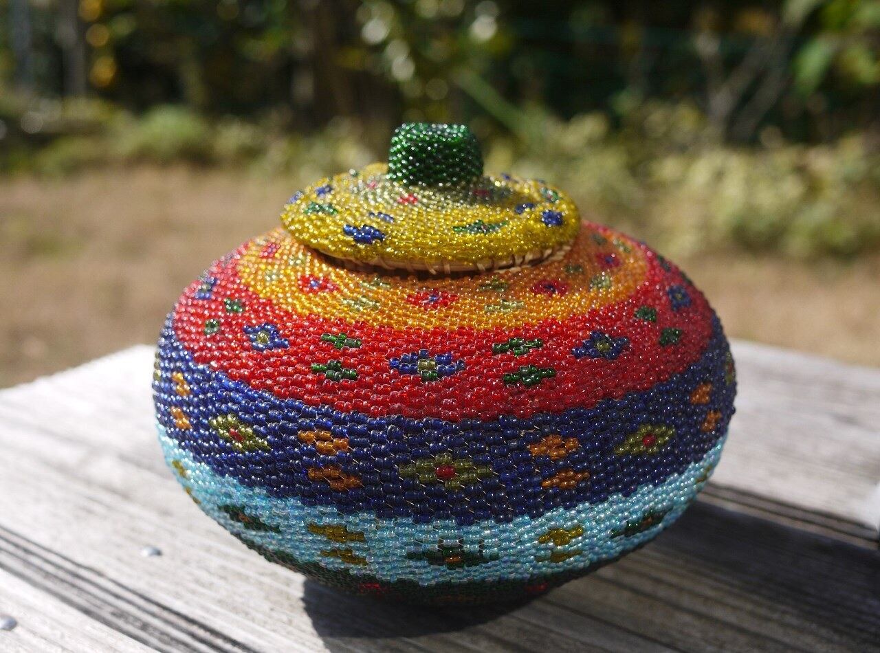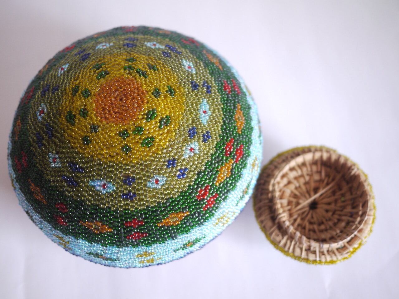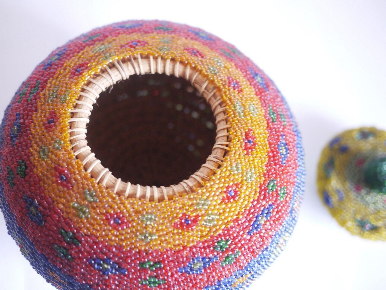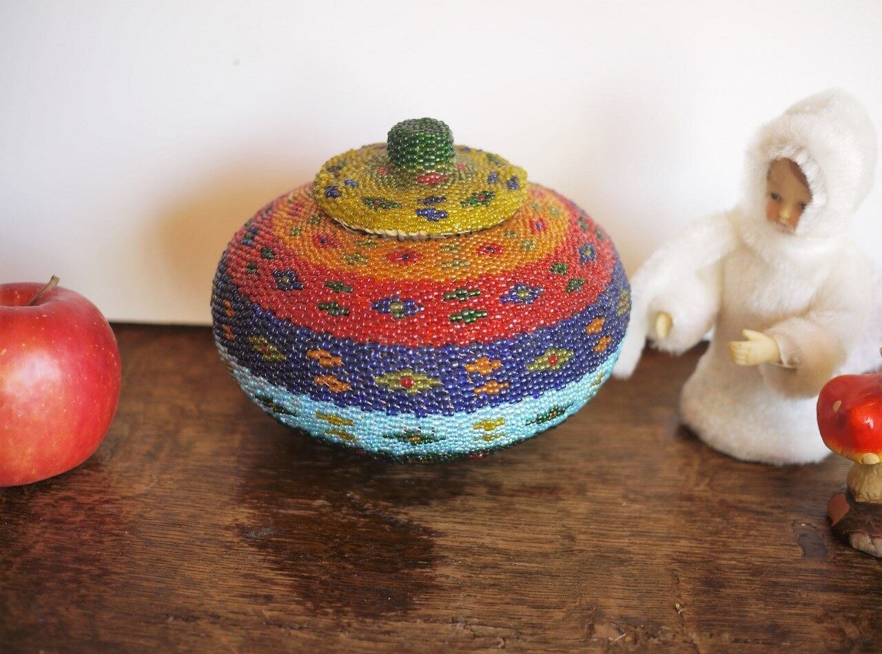 色鮮やかなビーズをびっちり編み込んだ蓋つきのかご