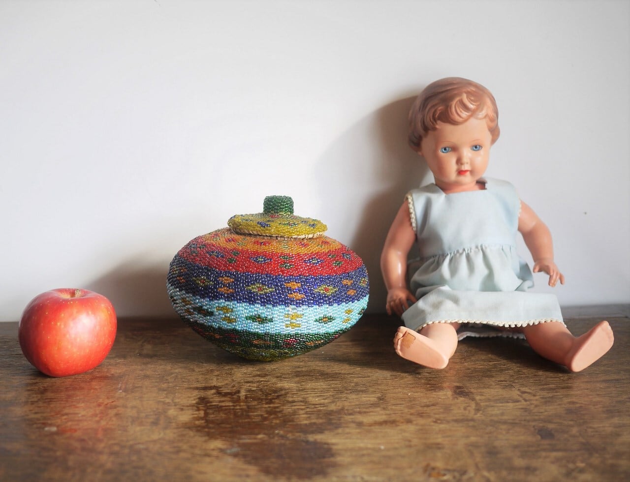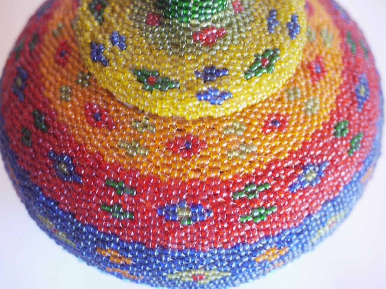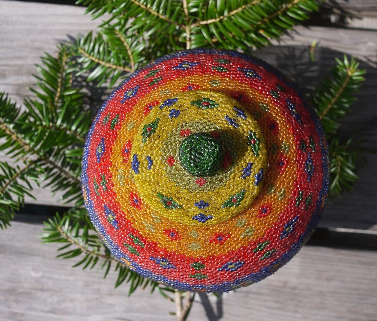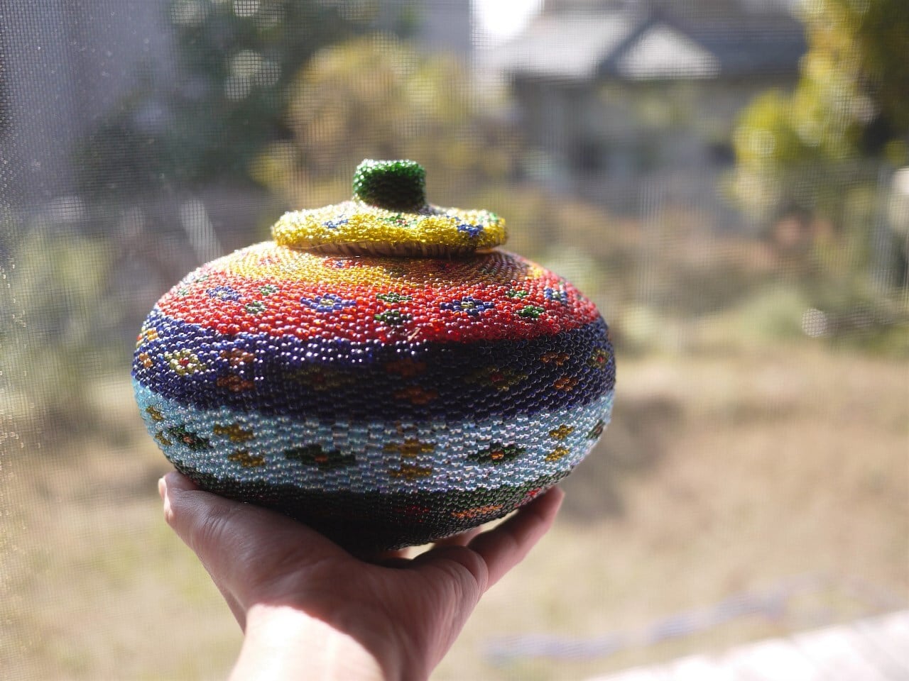 色鮮やかなビーズをびっちり編み込んだ蓋つきのかご