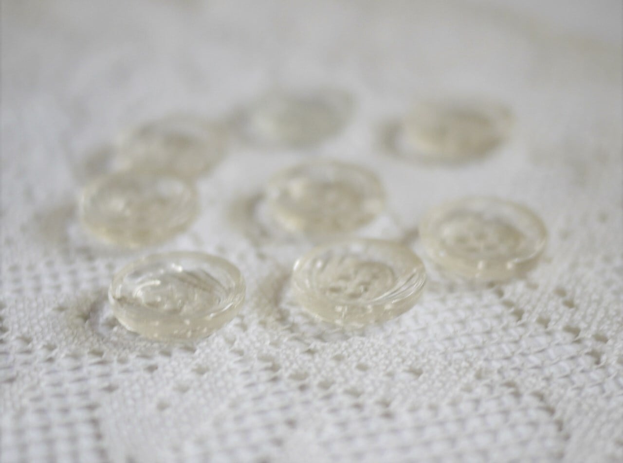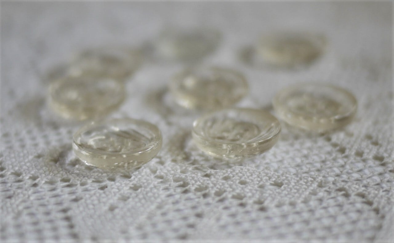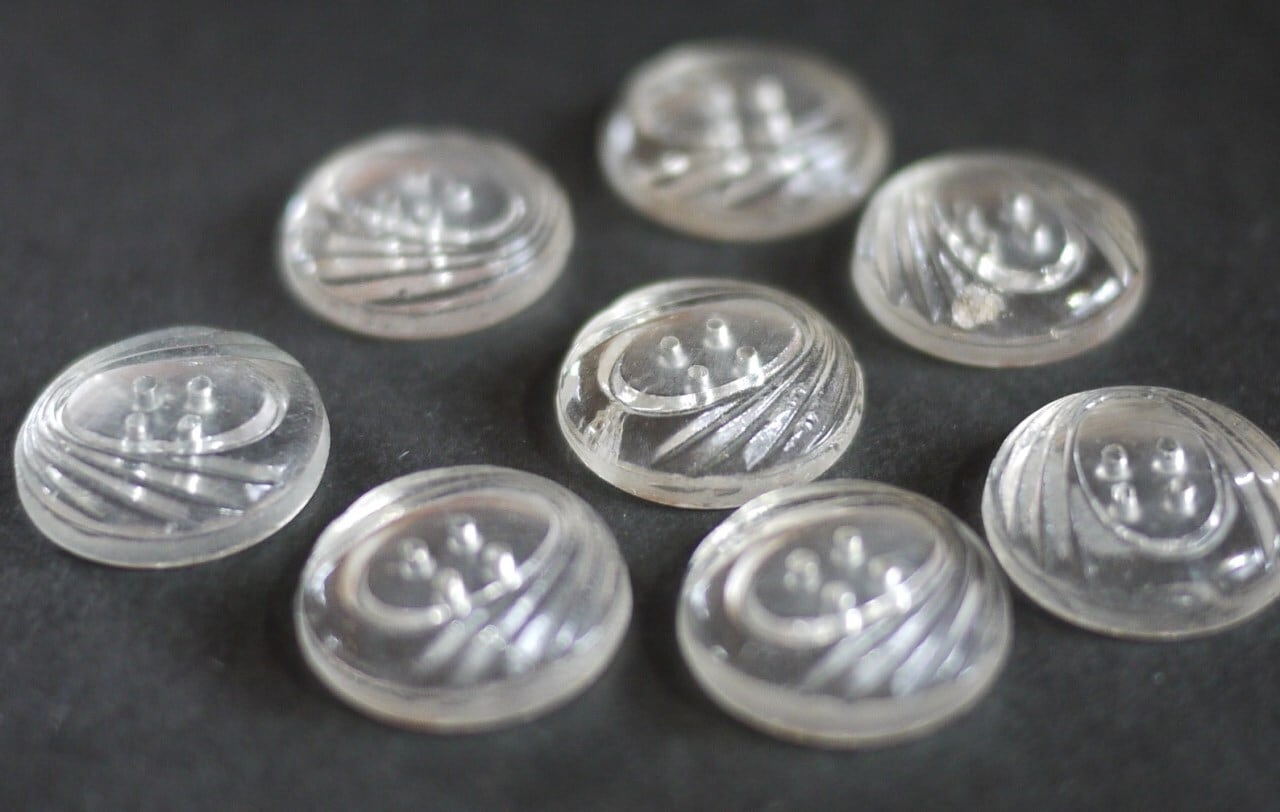 ヴィンテージガラス、四つ穴の透明ガラスボタンです。