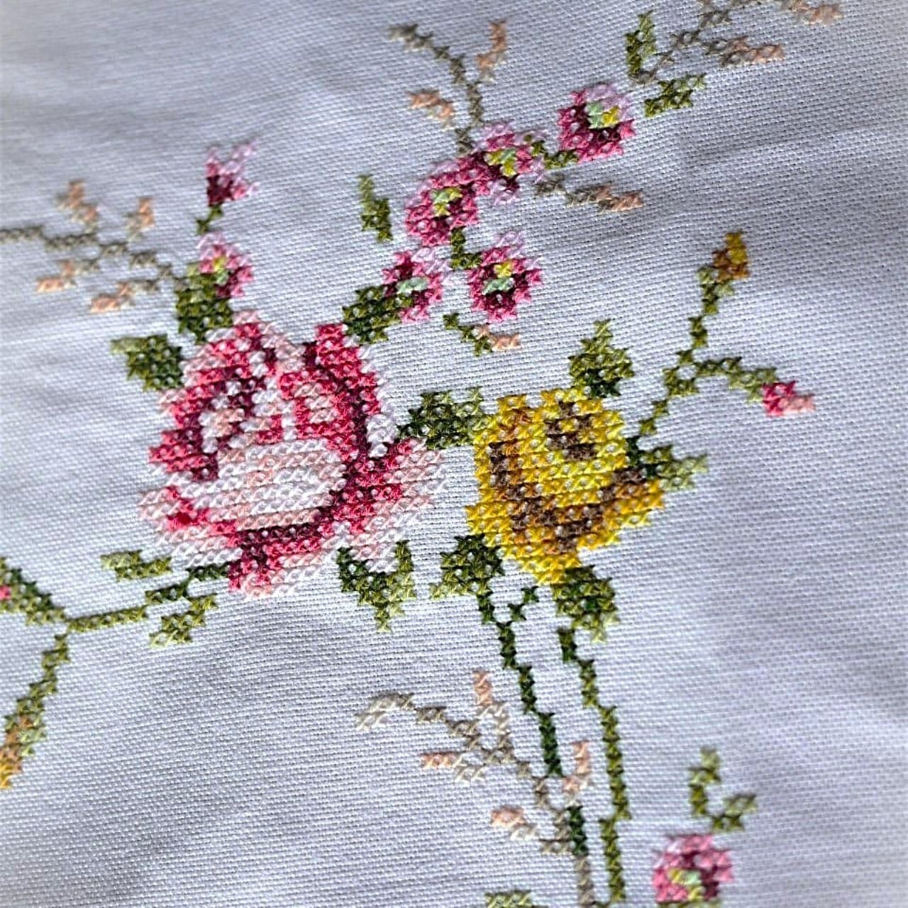 白地コットンクロスにバラのクロスステッチ刺繍。