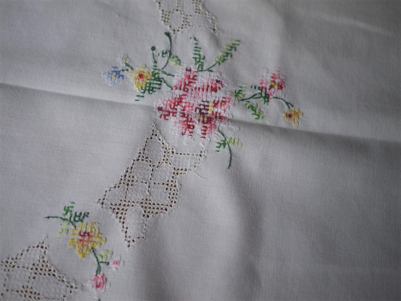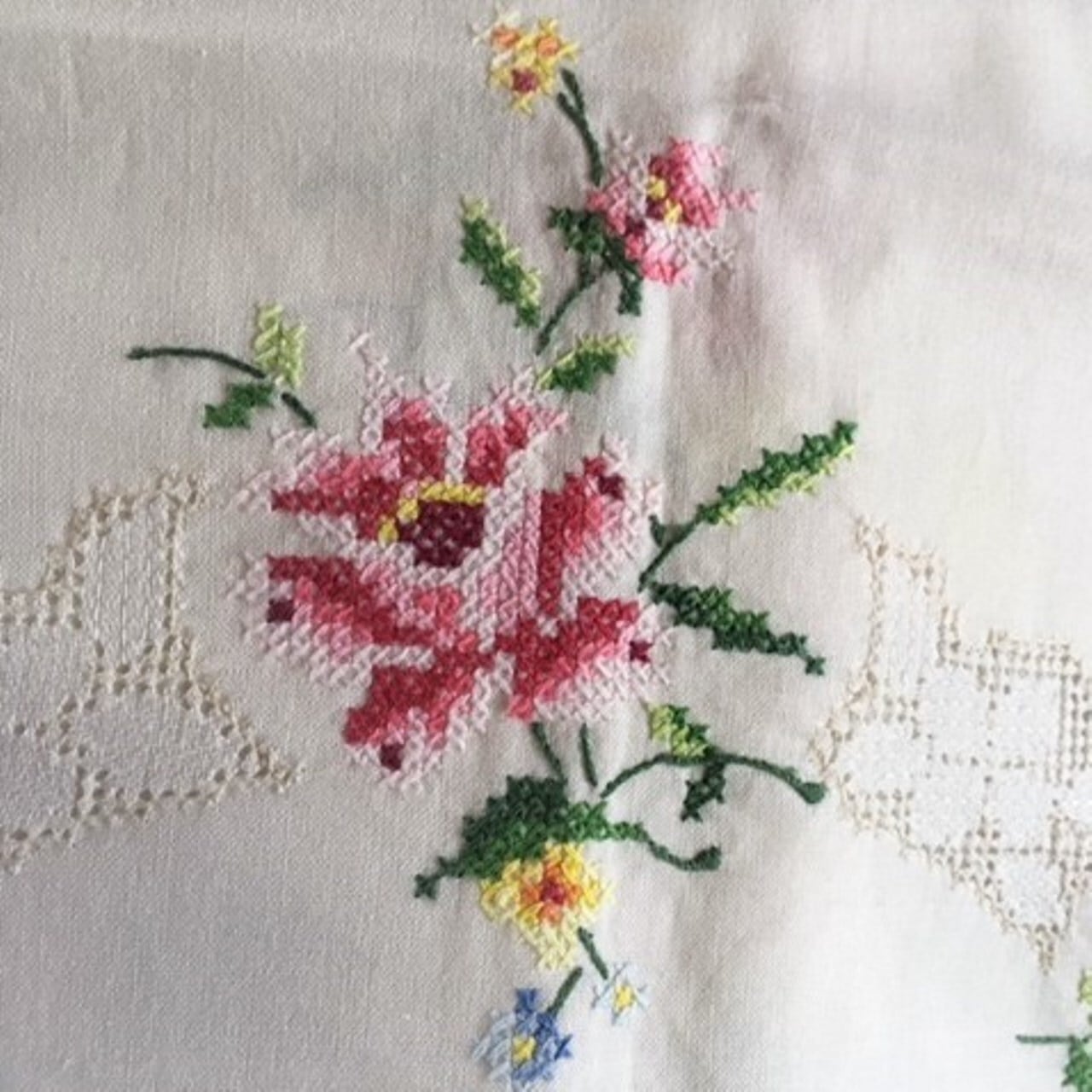 薄手コットンクロスにバラのクロスステッチ刺繍。