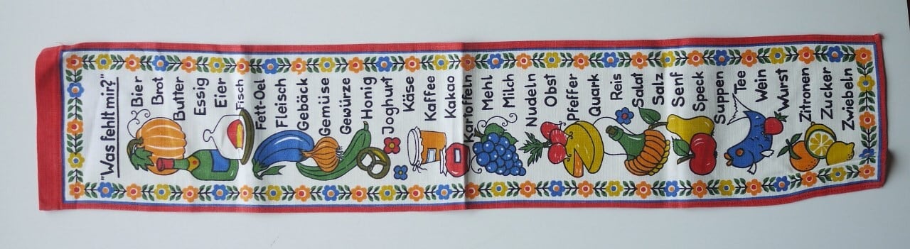 かわいい食材の絵と文字がプリントされたタペストリー。