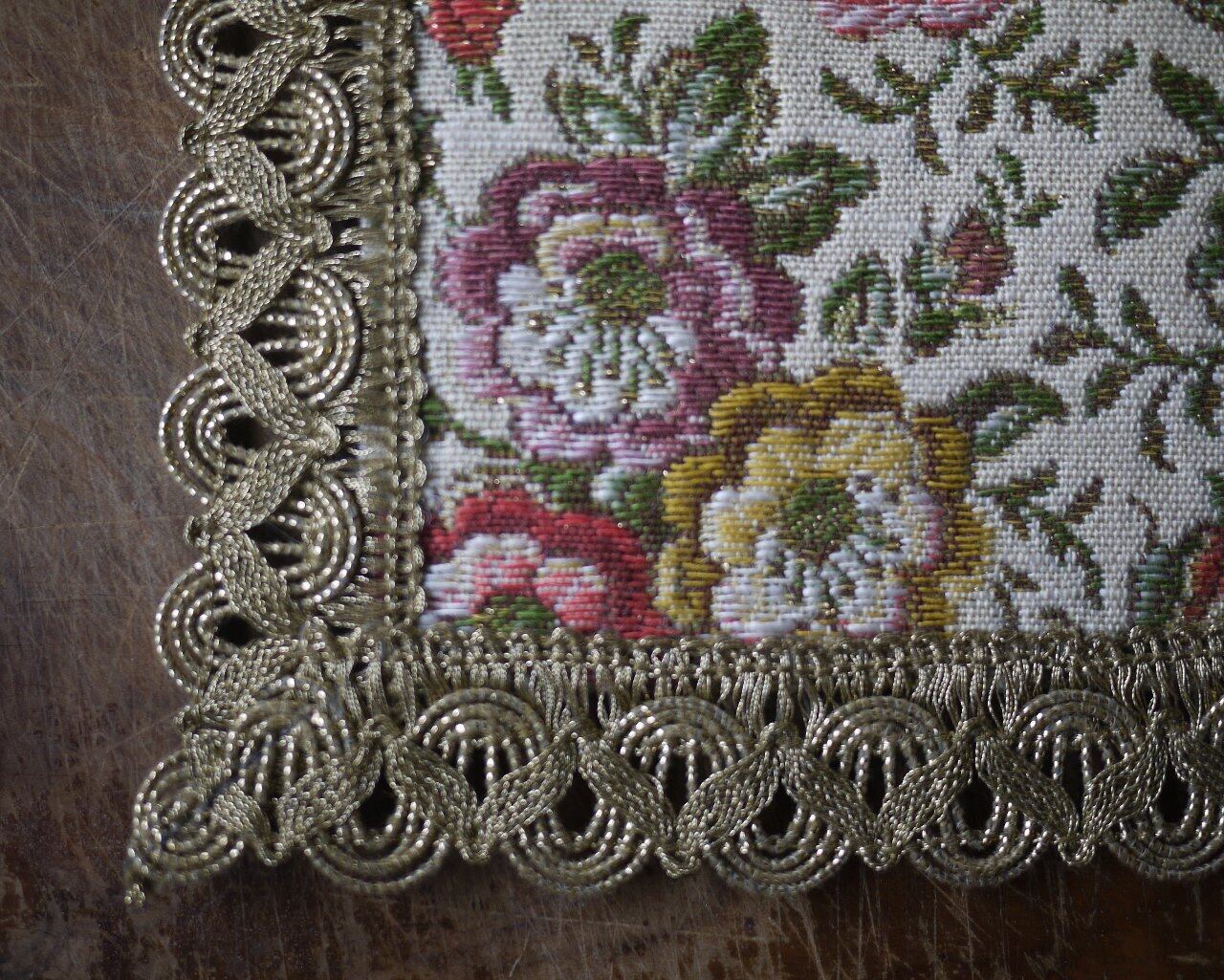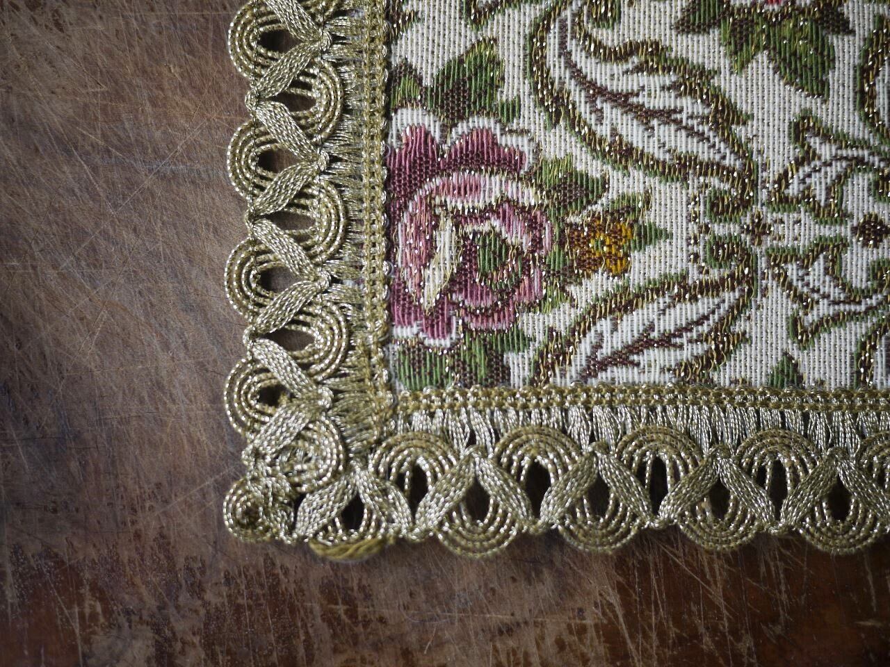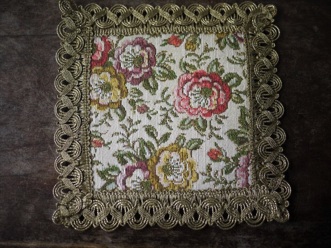 正方形敷物に鮮やかなバラと金糸の葉が描かれたマット。