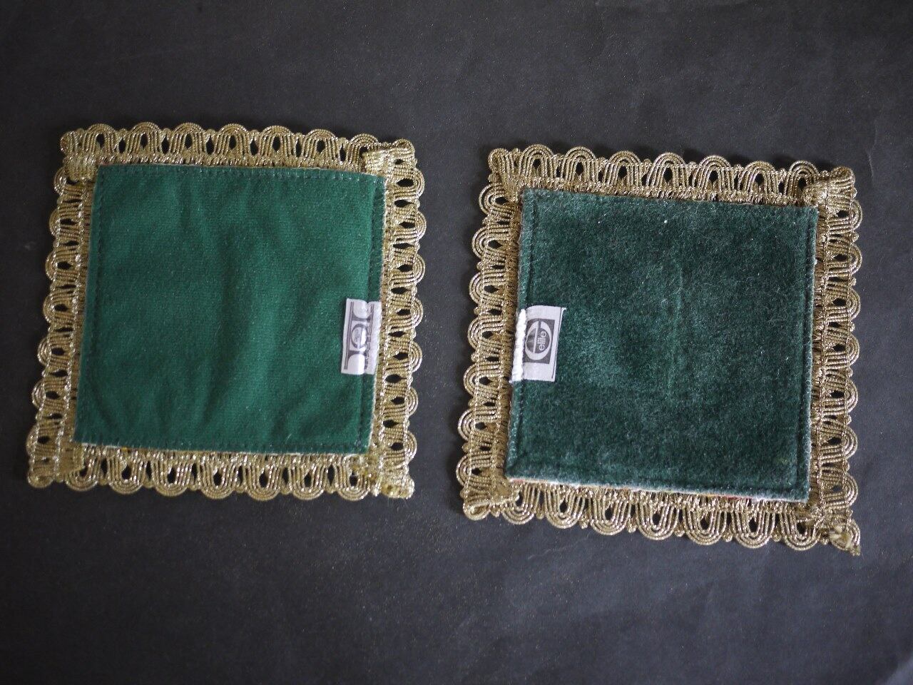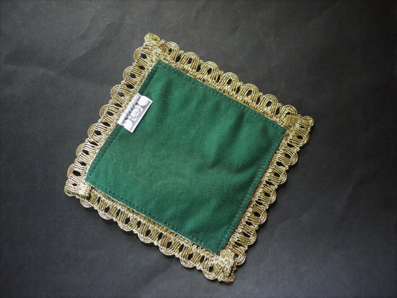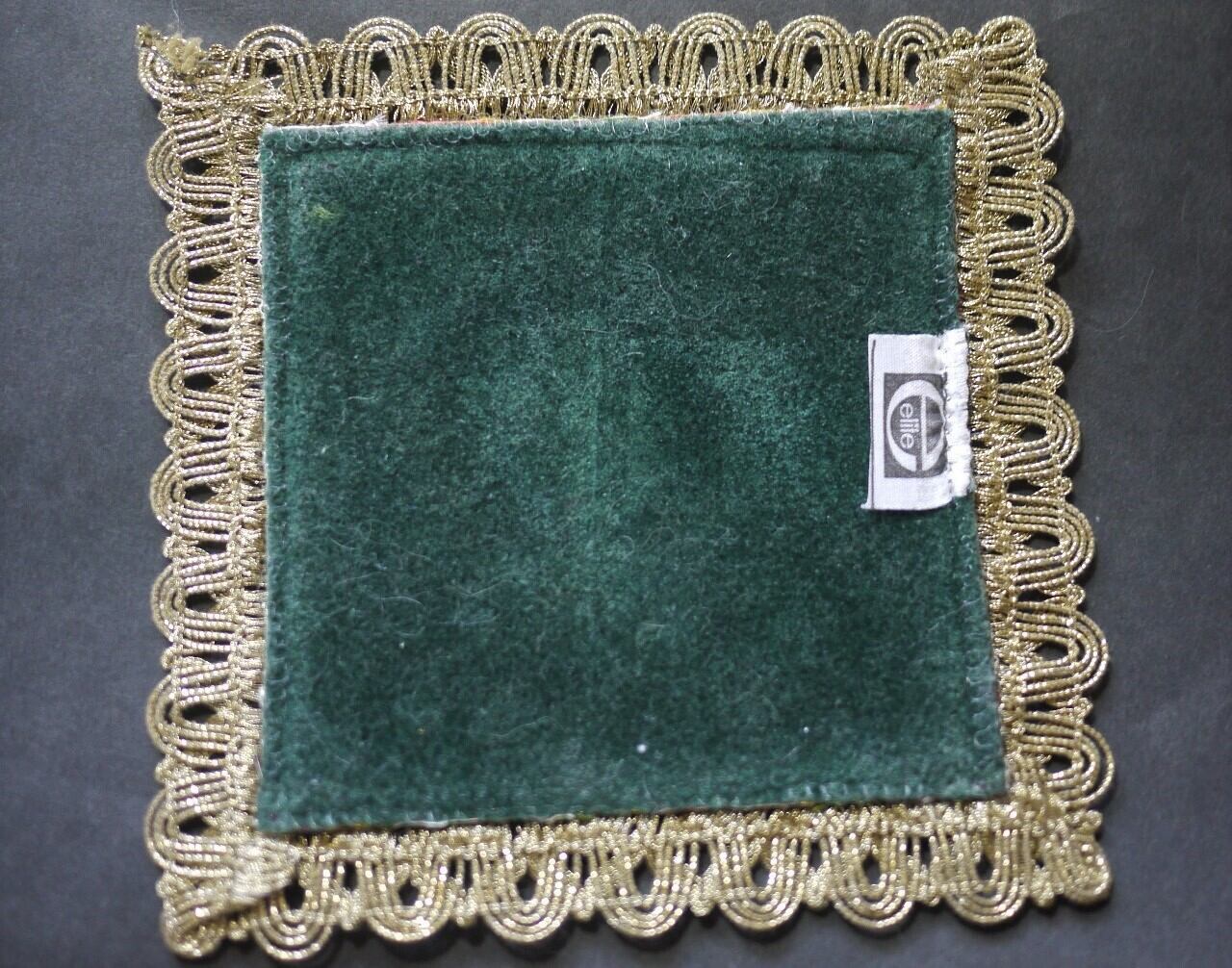 正方形敷物に鮮やかなバラと金糸の葉が描かれたマット。