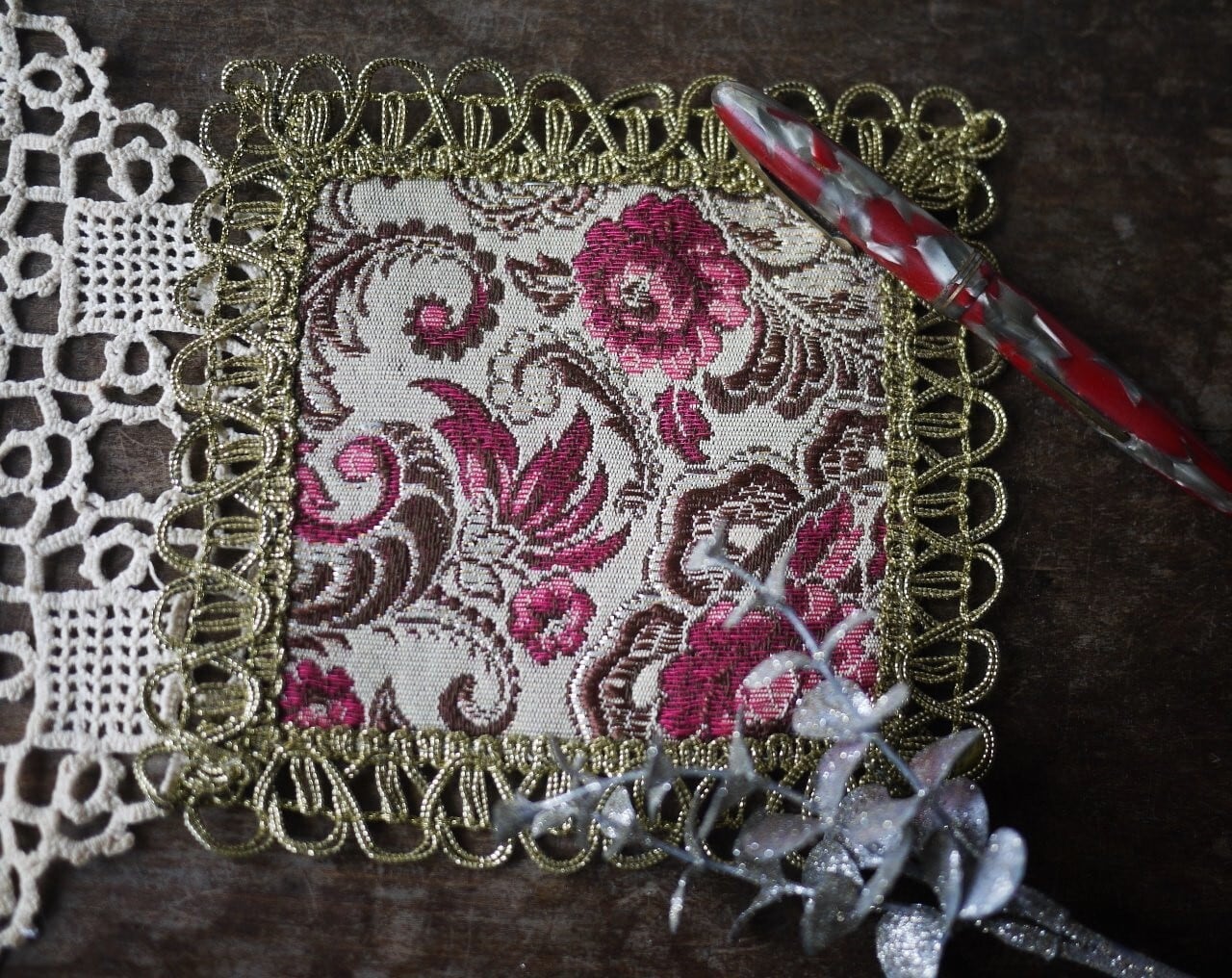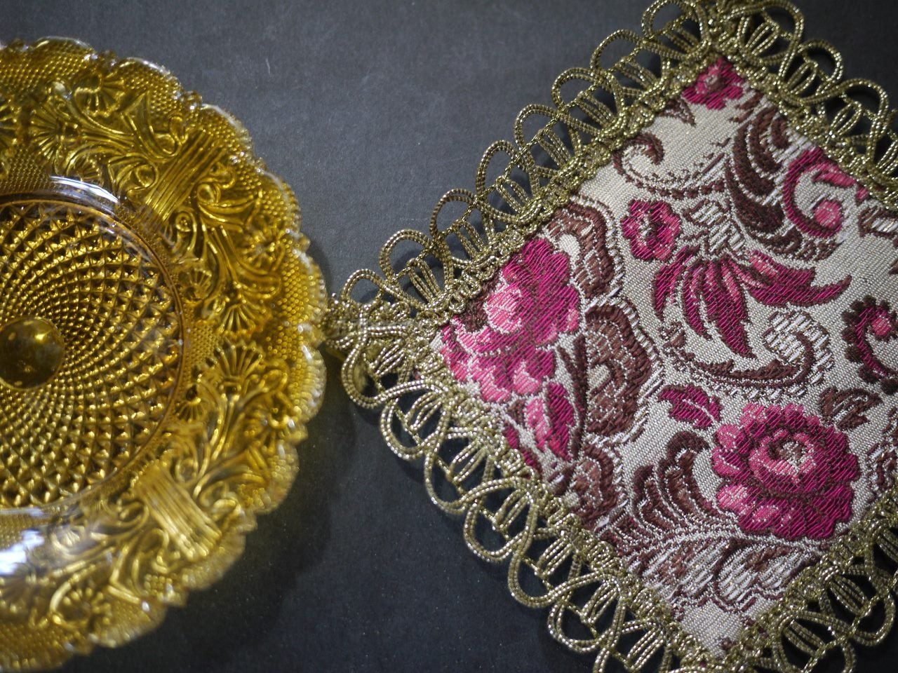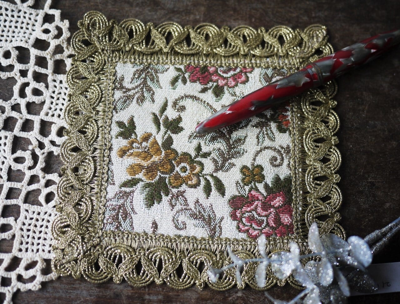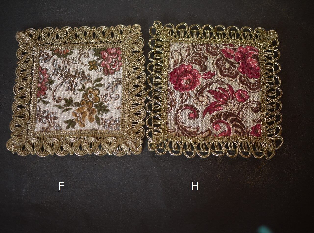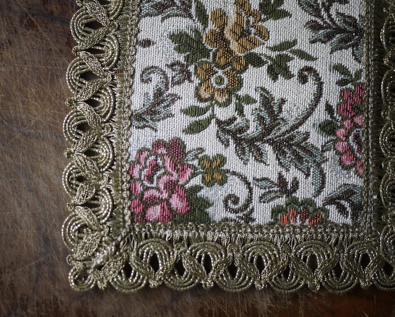 h正方形敷物に深紅のバラと金糸の葉が描かれたマット。