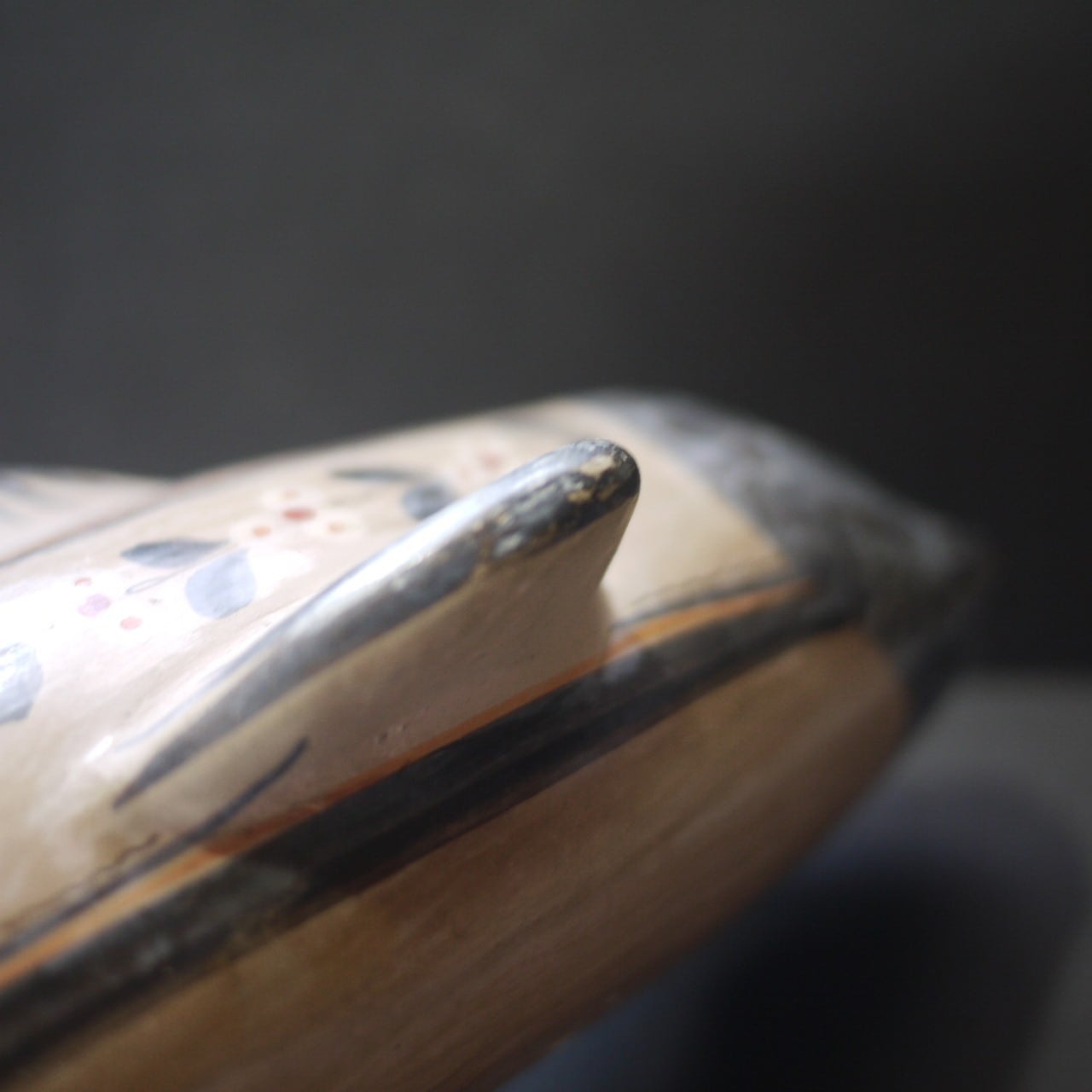 肌理の細かい粘土を成形して花文様の絵付が施され、
