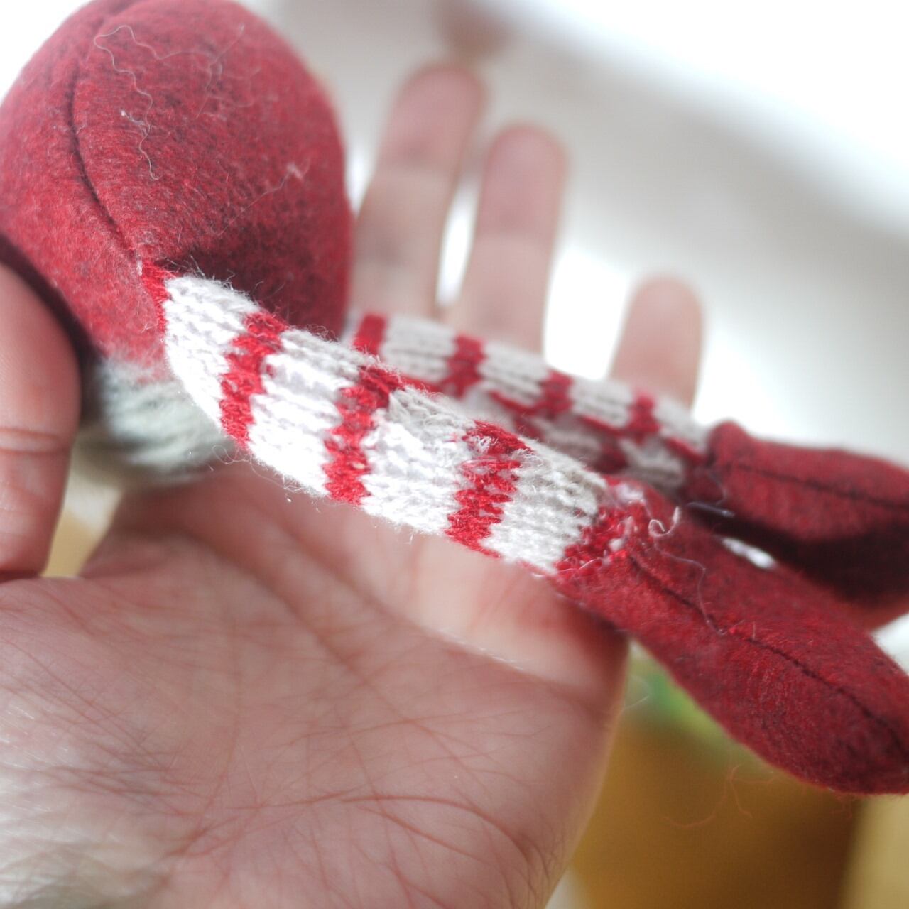 胴体、つま先はフェルト、帽子と脚は毛糸です。