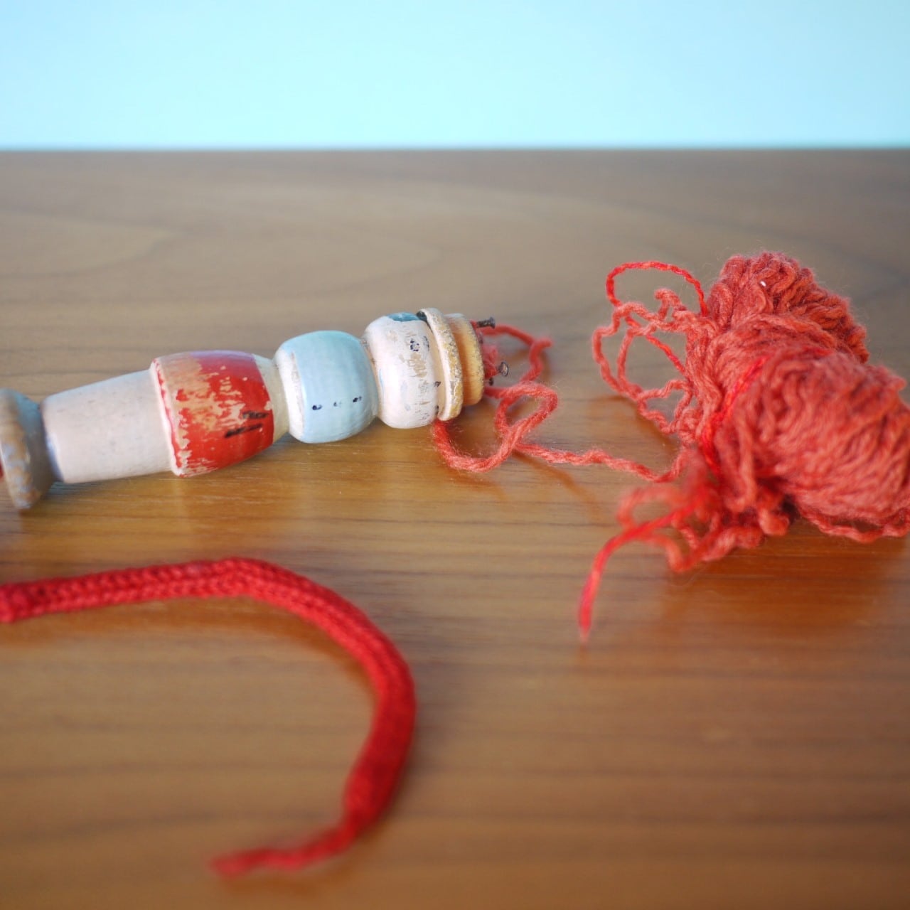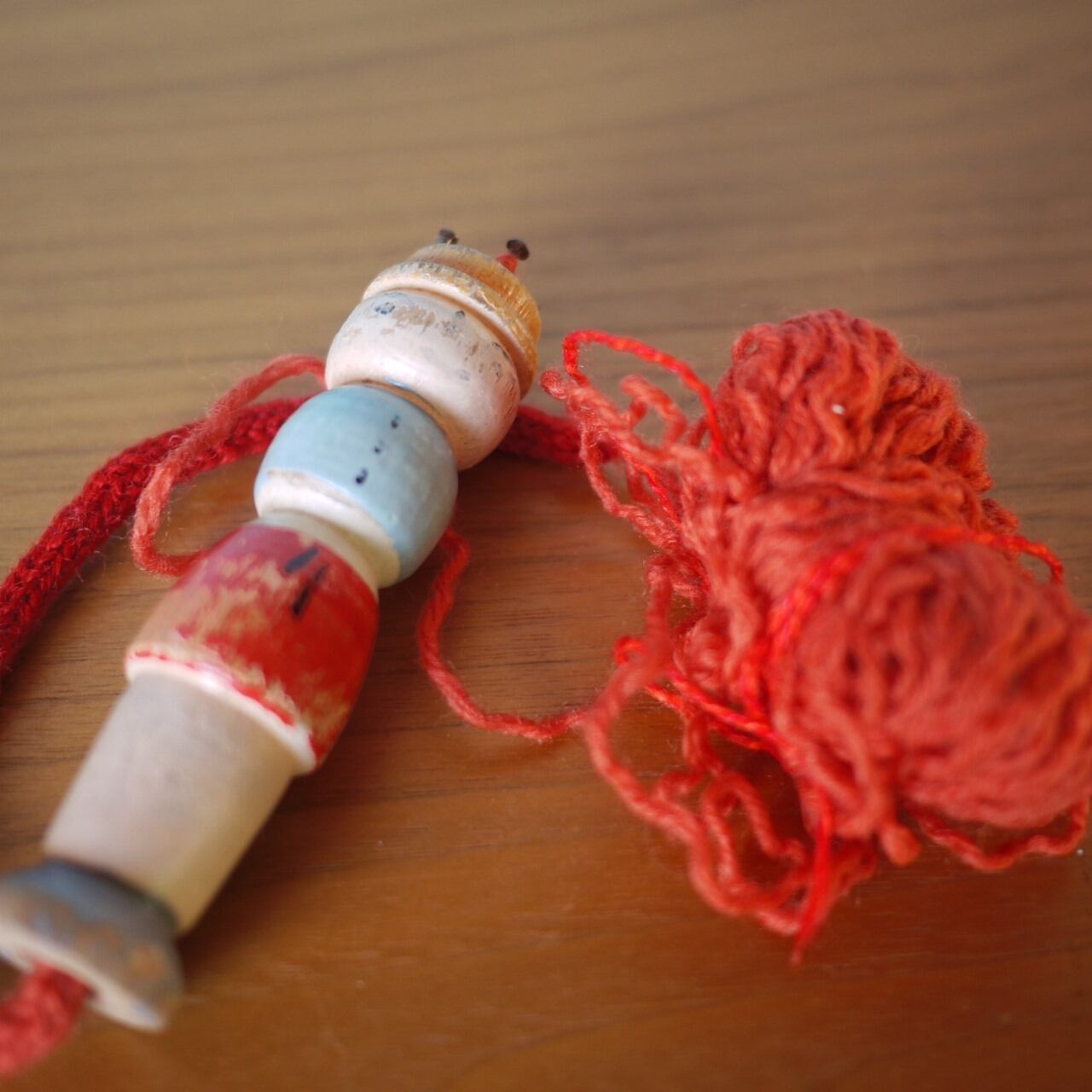 誰かの作った紐が毛糸(古いほどいた毛糸)とともについています。