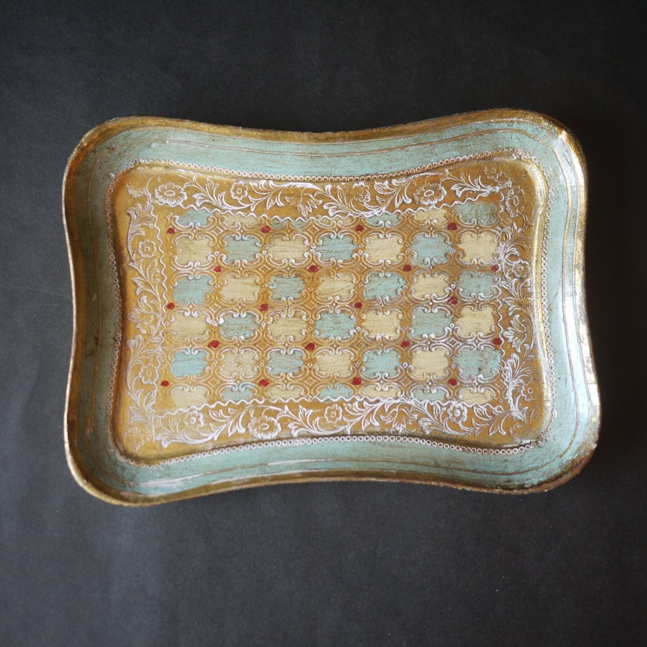 イタリア フィレンツェ ヴィンテージ ラウンドトレイ 赤×金×青 木製金彩伝統工芸