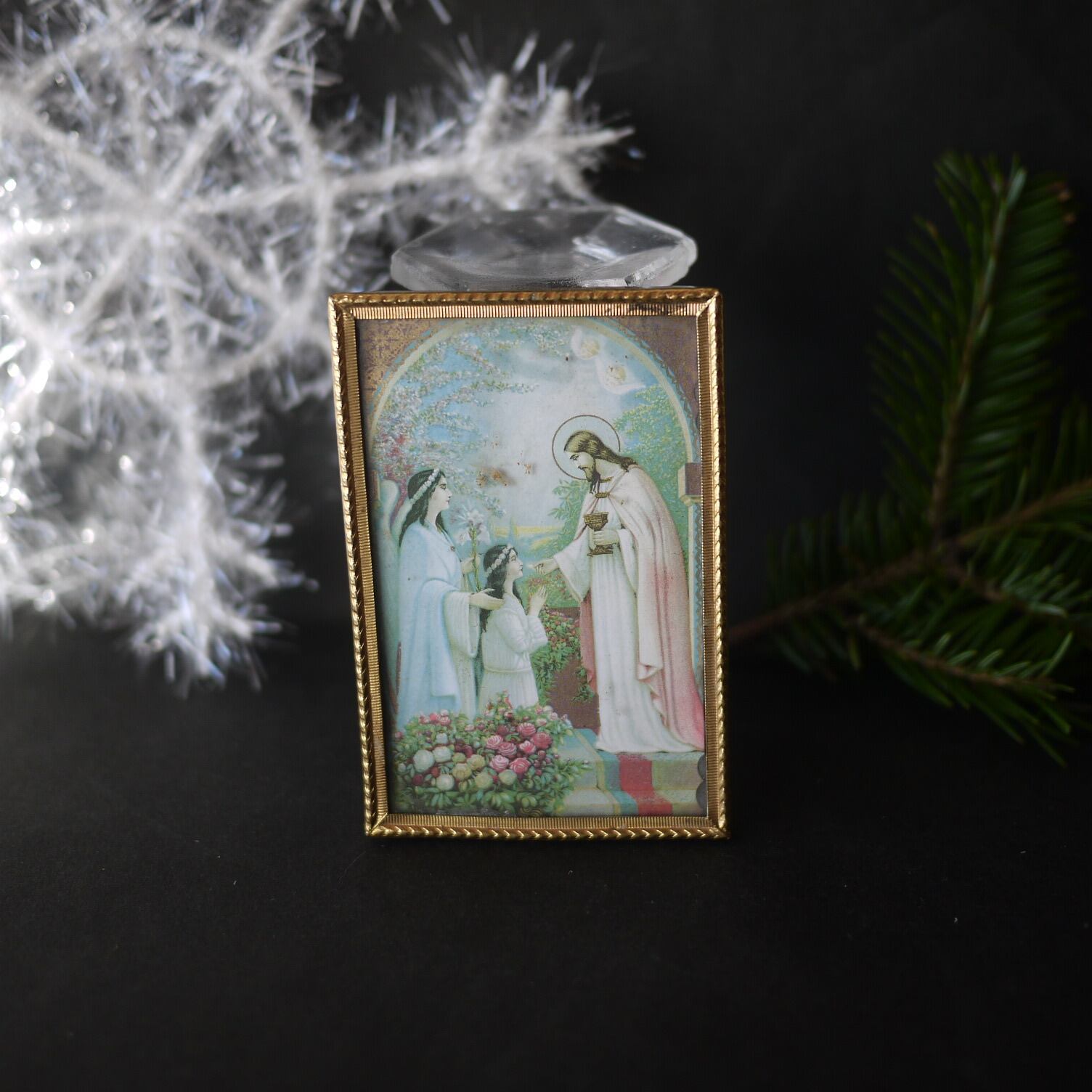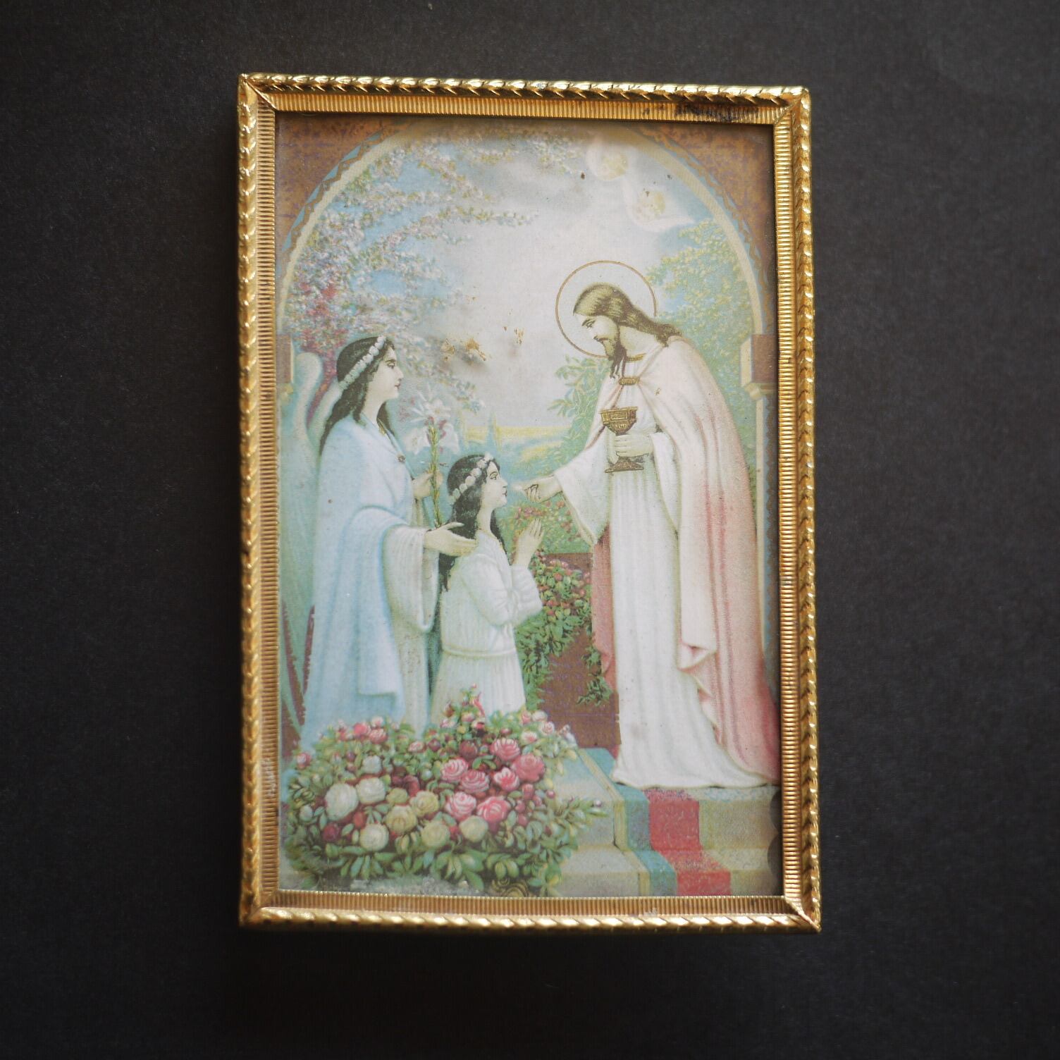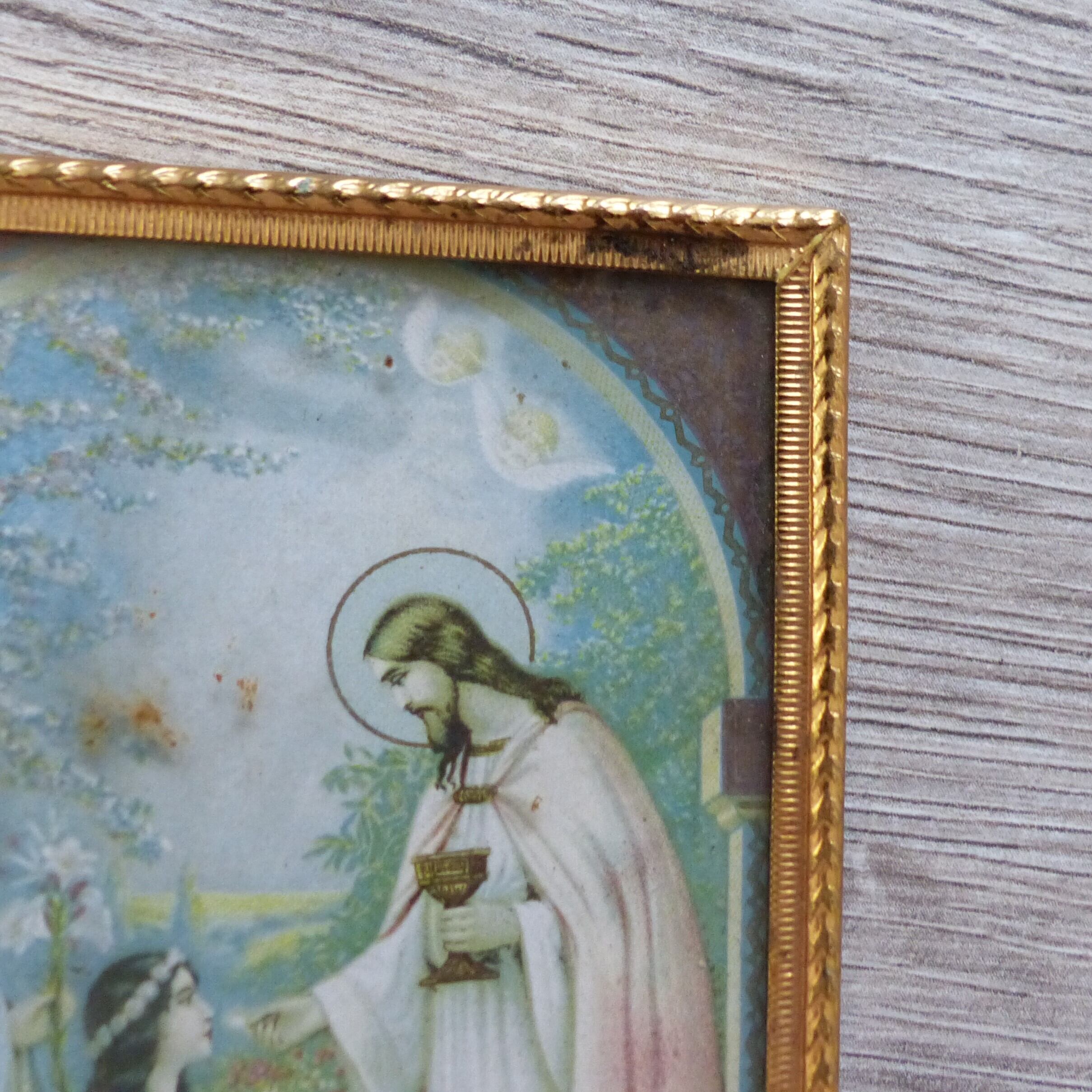 聖杯を持ち、跪く女性の口に手をやるイエス像です。