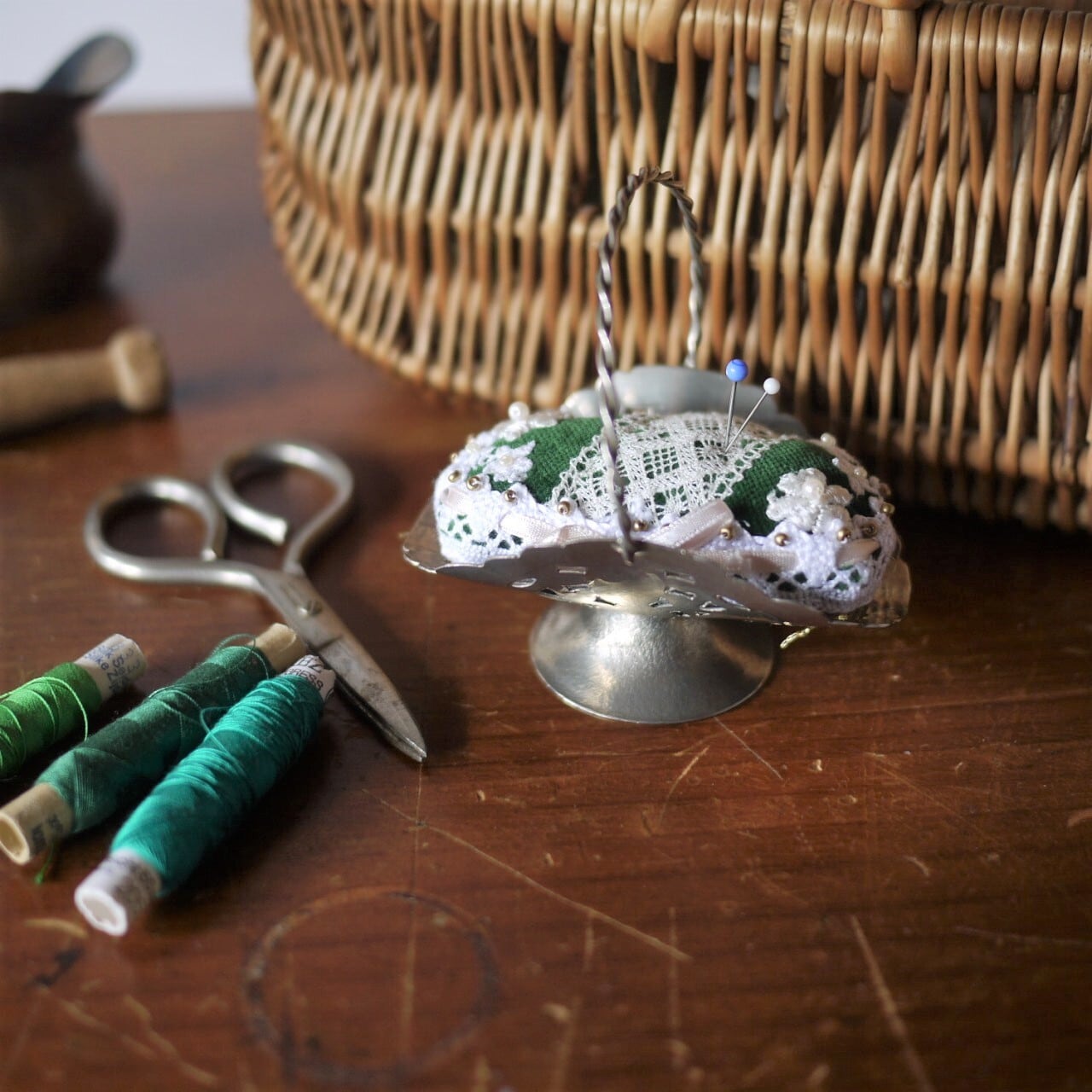 撮影用の小物(ハサミ、糸、マチ針、かご)を配置しております。付属していません。