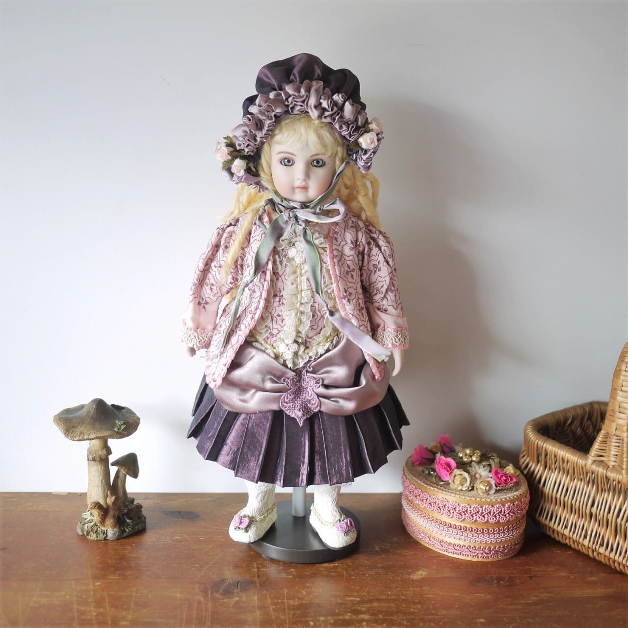 クラシックな淡い紫色の衣装を着けた西洋人形です。