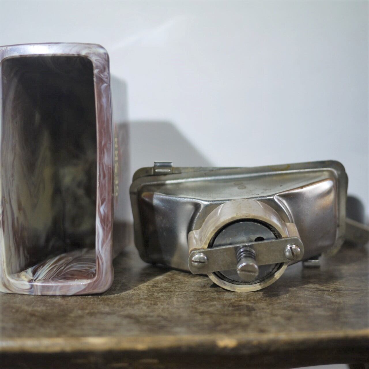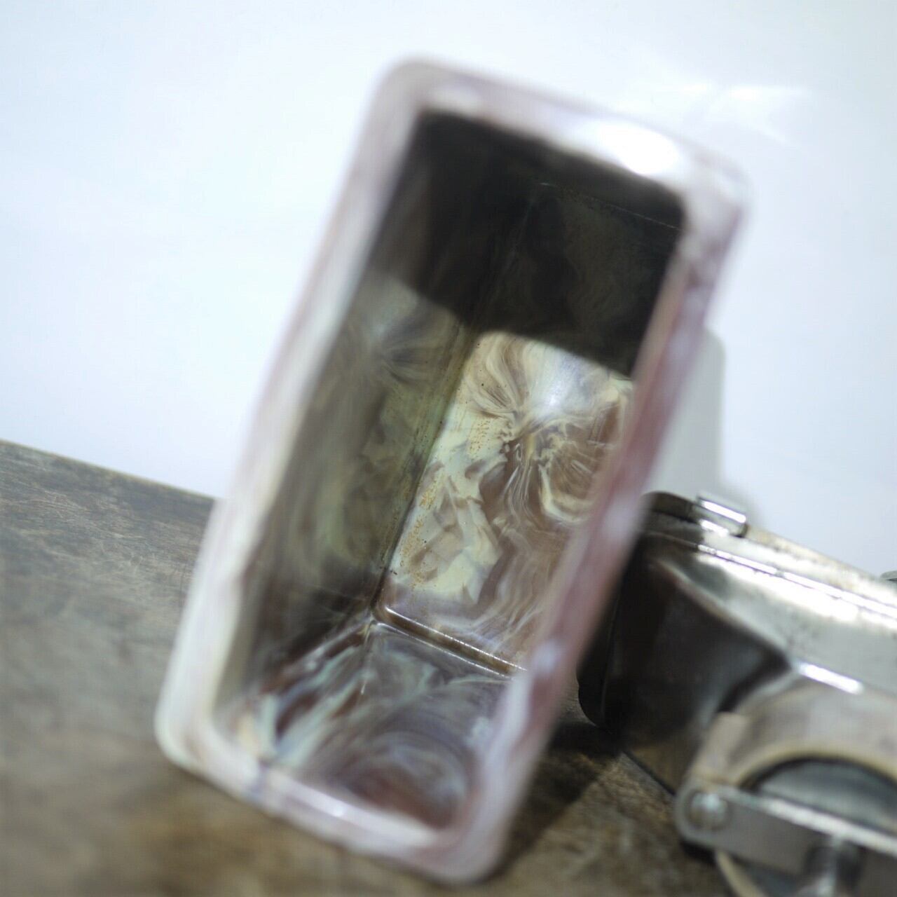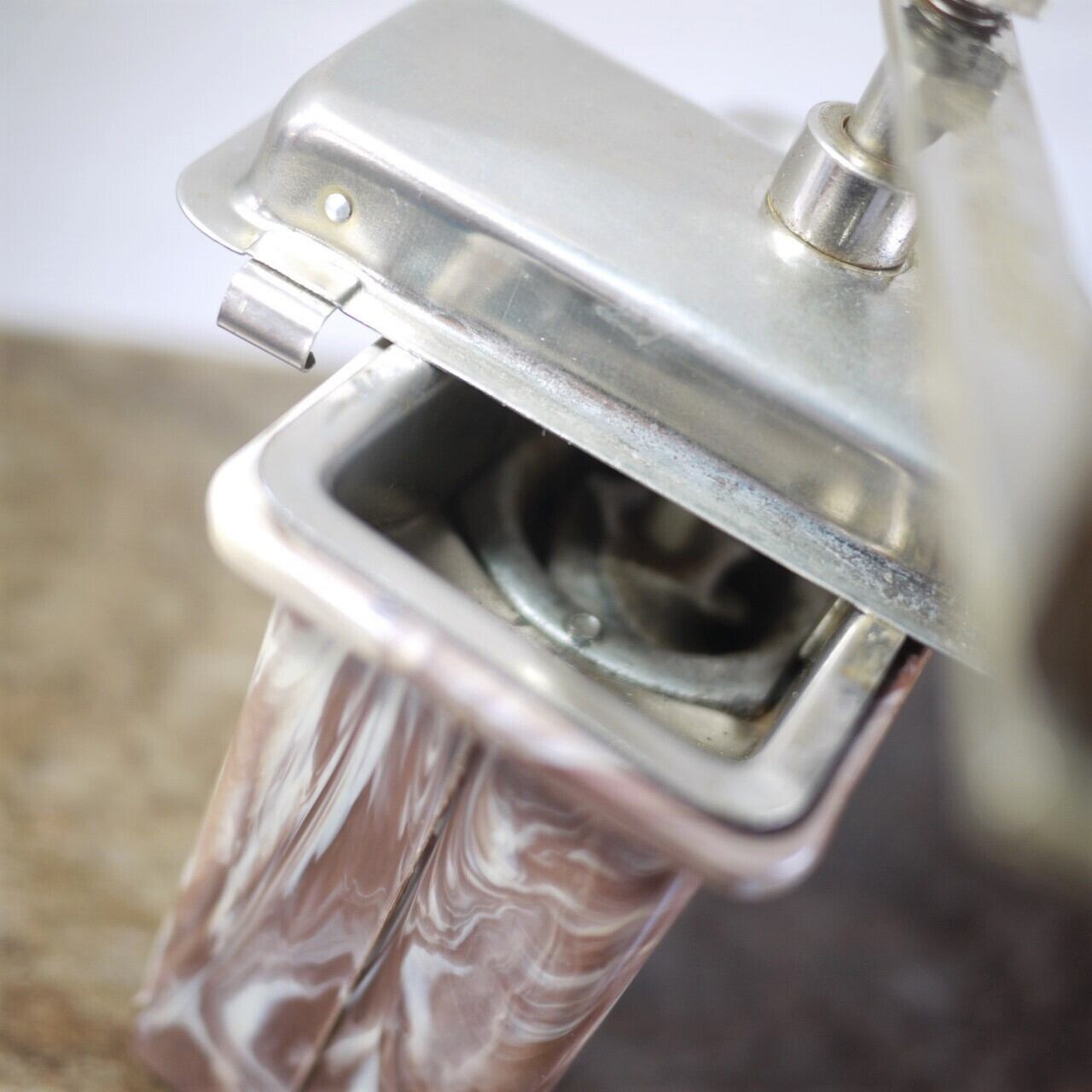 プラスチック製の粉受けはモダンなマーブル文様のデザイン。