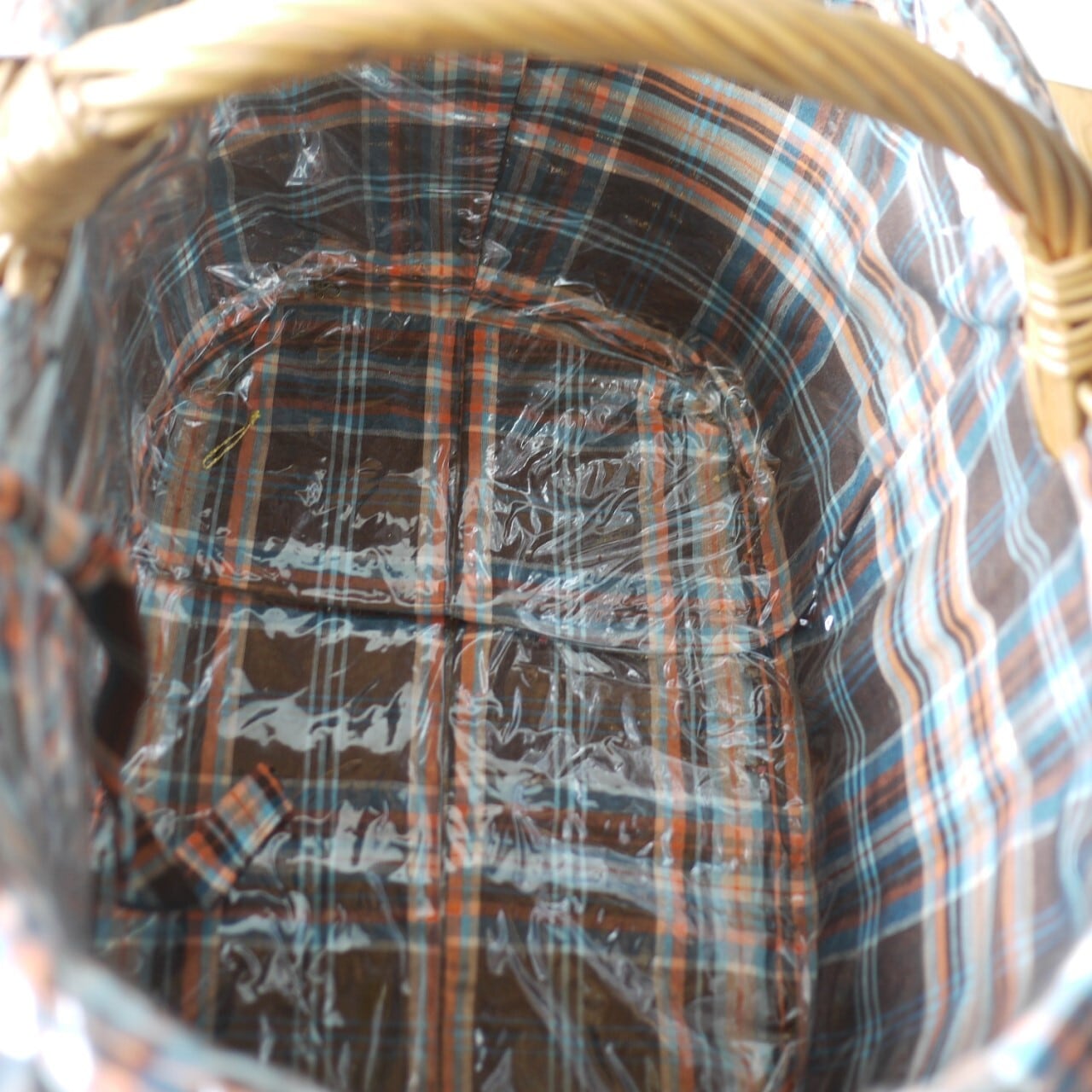 マドラスチェックのさわやかな布と濡れ防止のビニールがついた