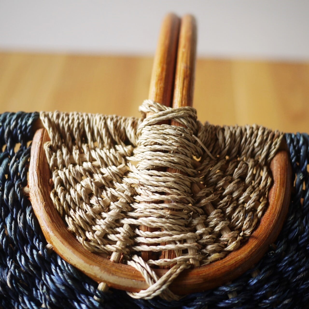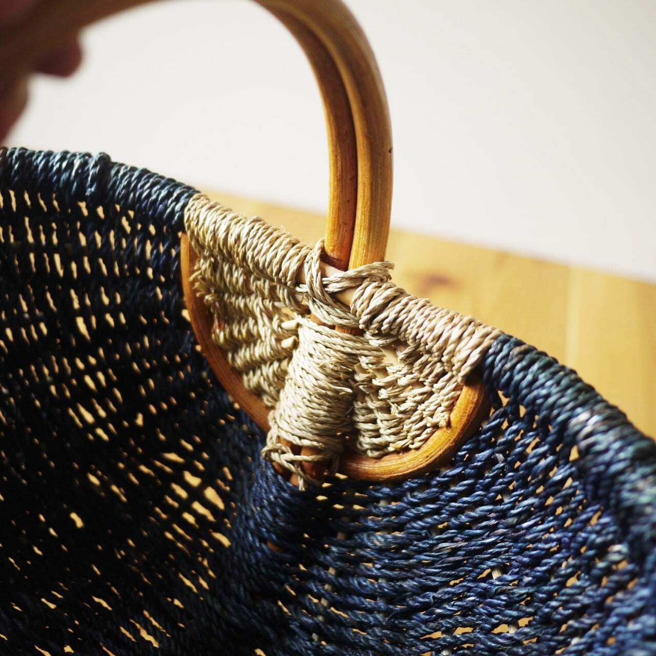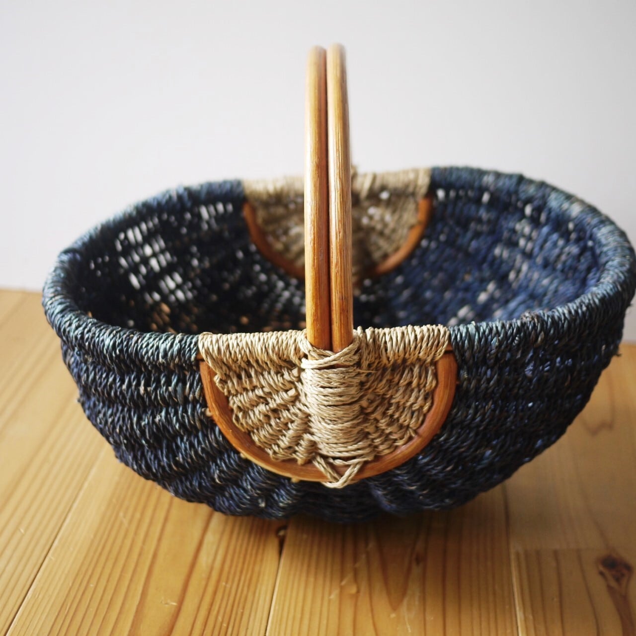 麻のような紐を編み込んだ丈夫なバスケットです。