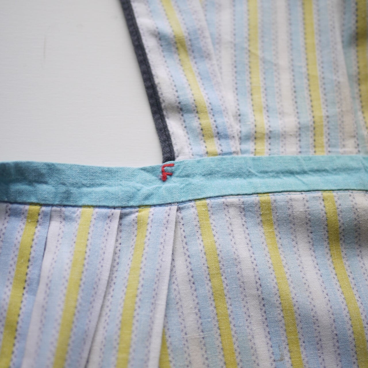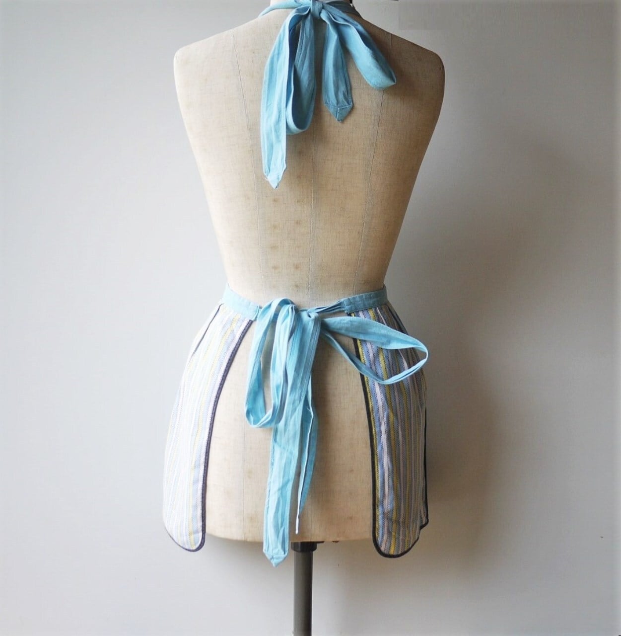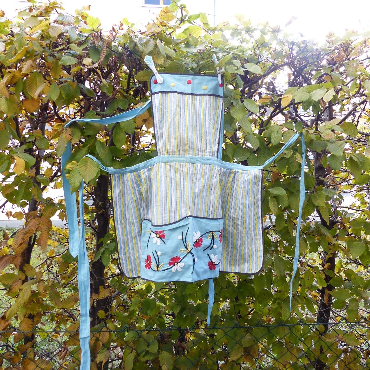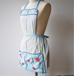 刺繍とストライプの取り合わせがかわいい胸当てエプロン。