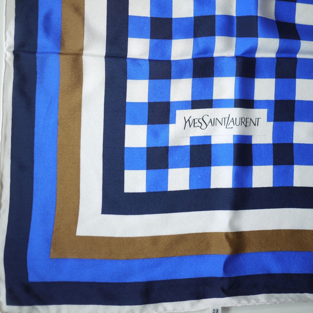 [ヴィンテージ大判スカーフ YSL イヴサンローラン チェック青]