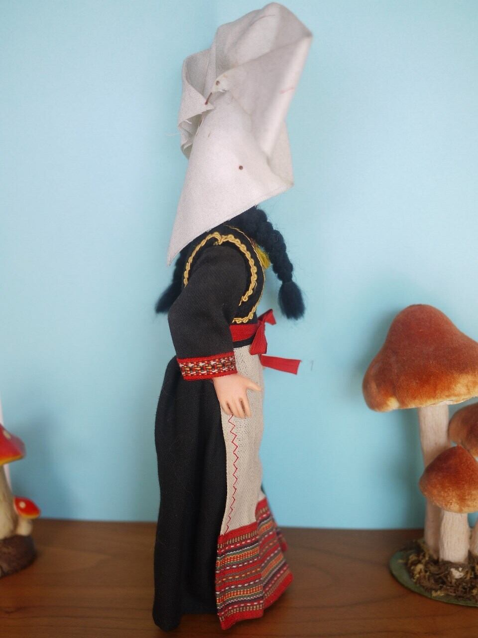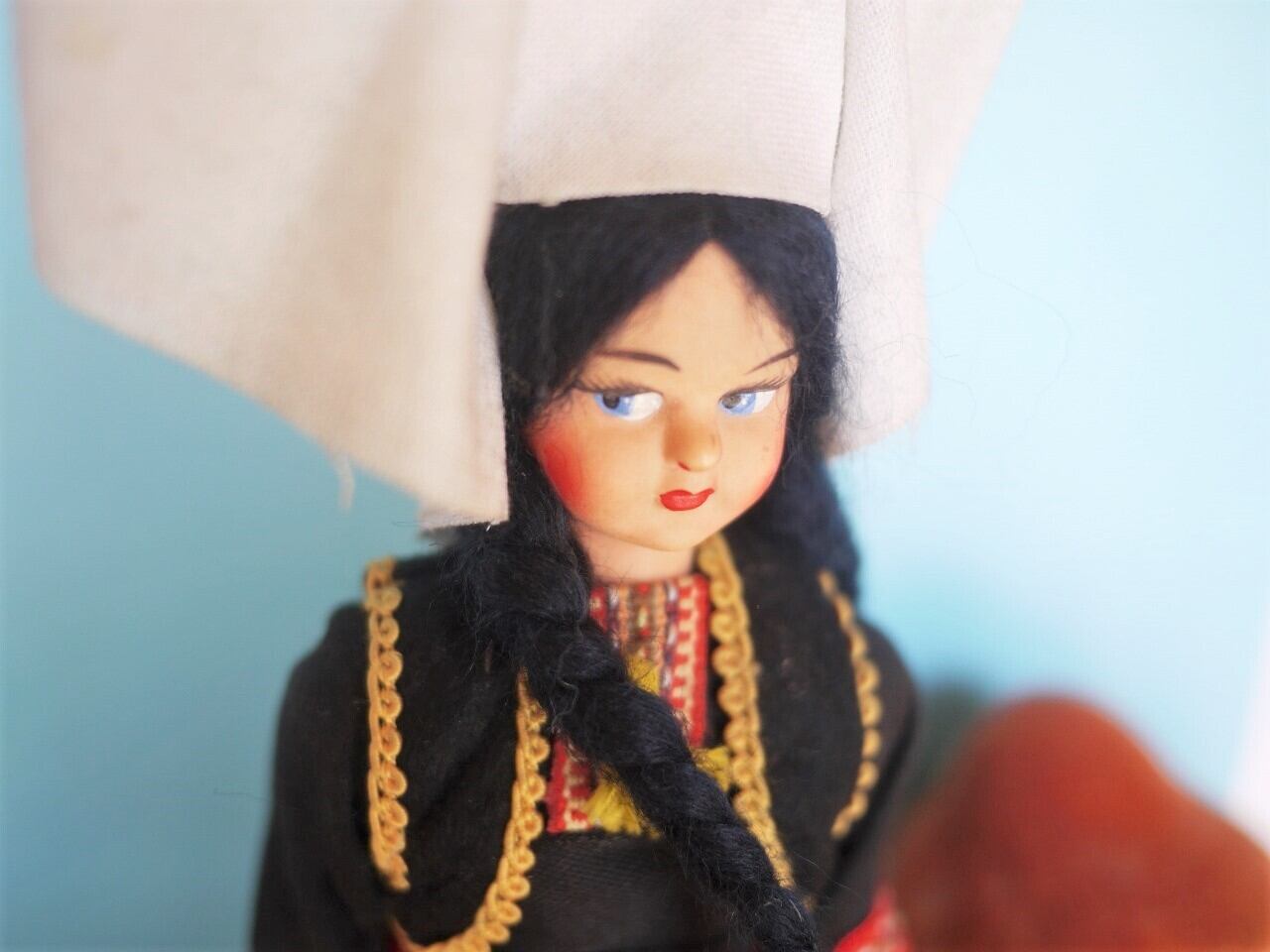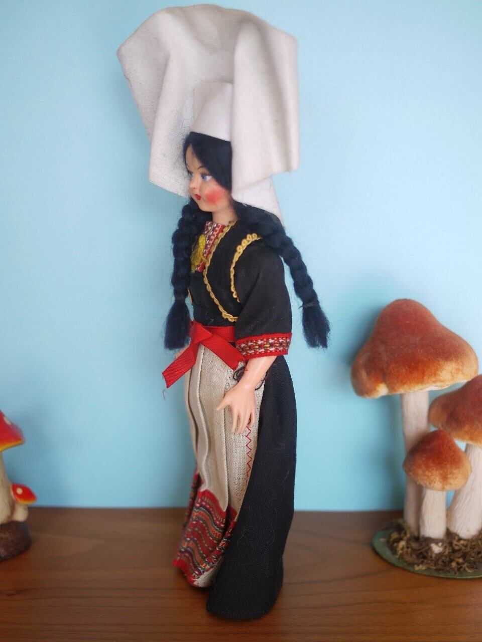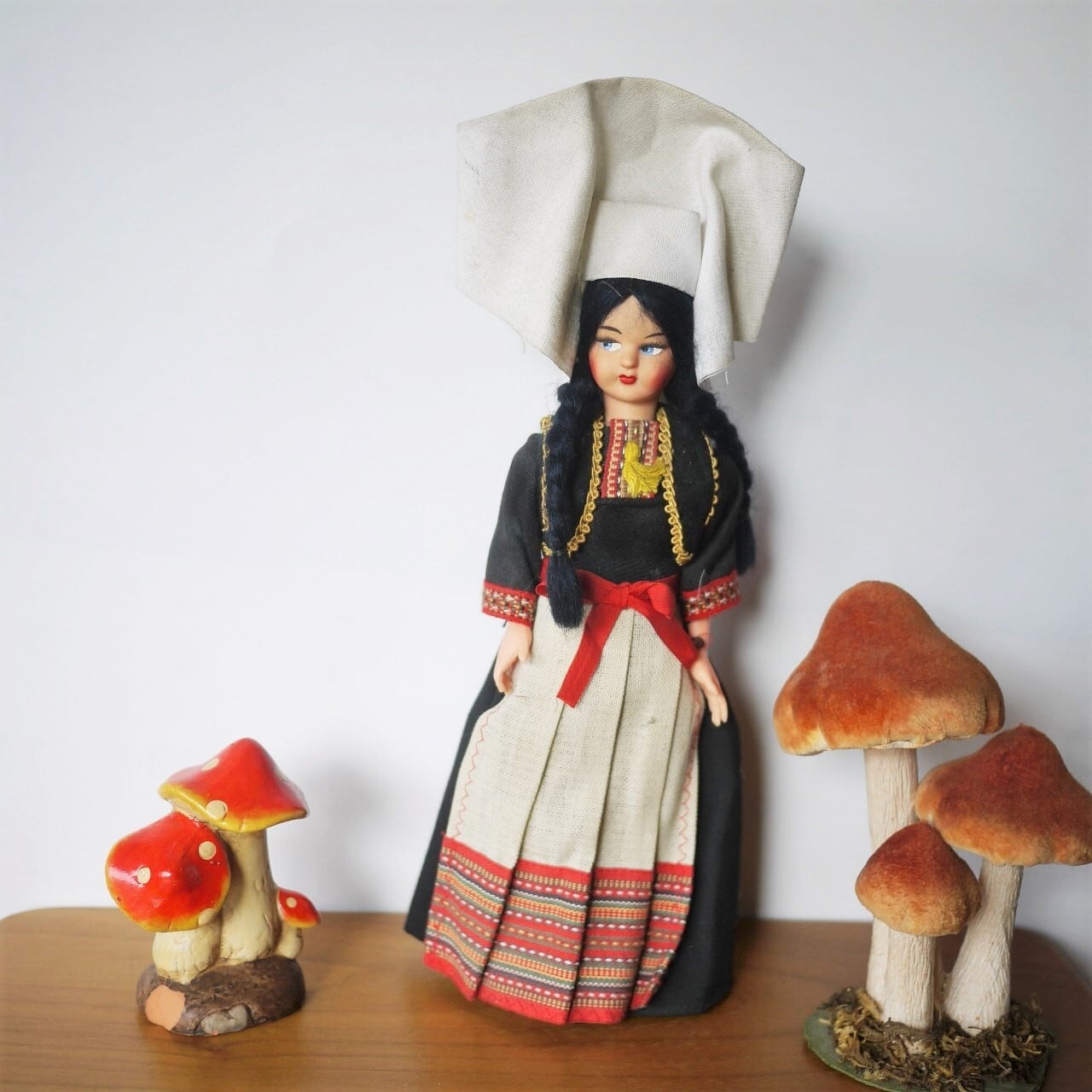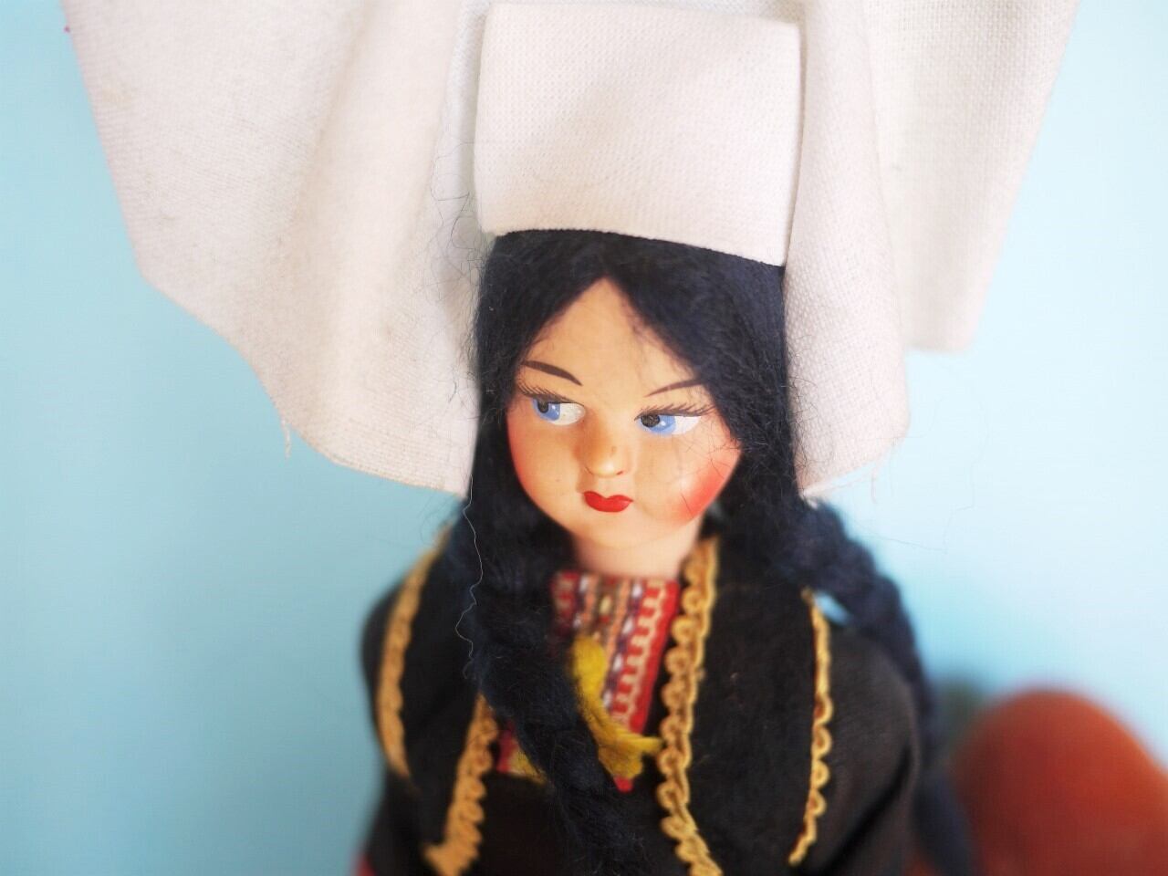 特徴的な帽子、黒い髪の愛らしい民族衣装人形。