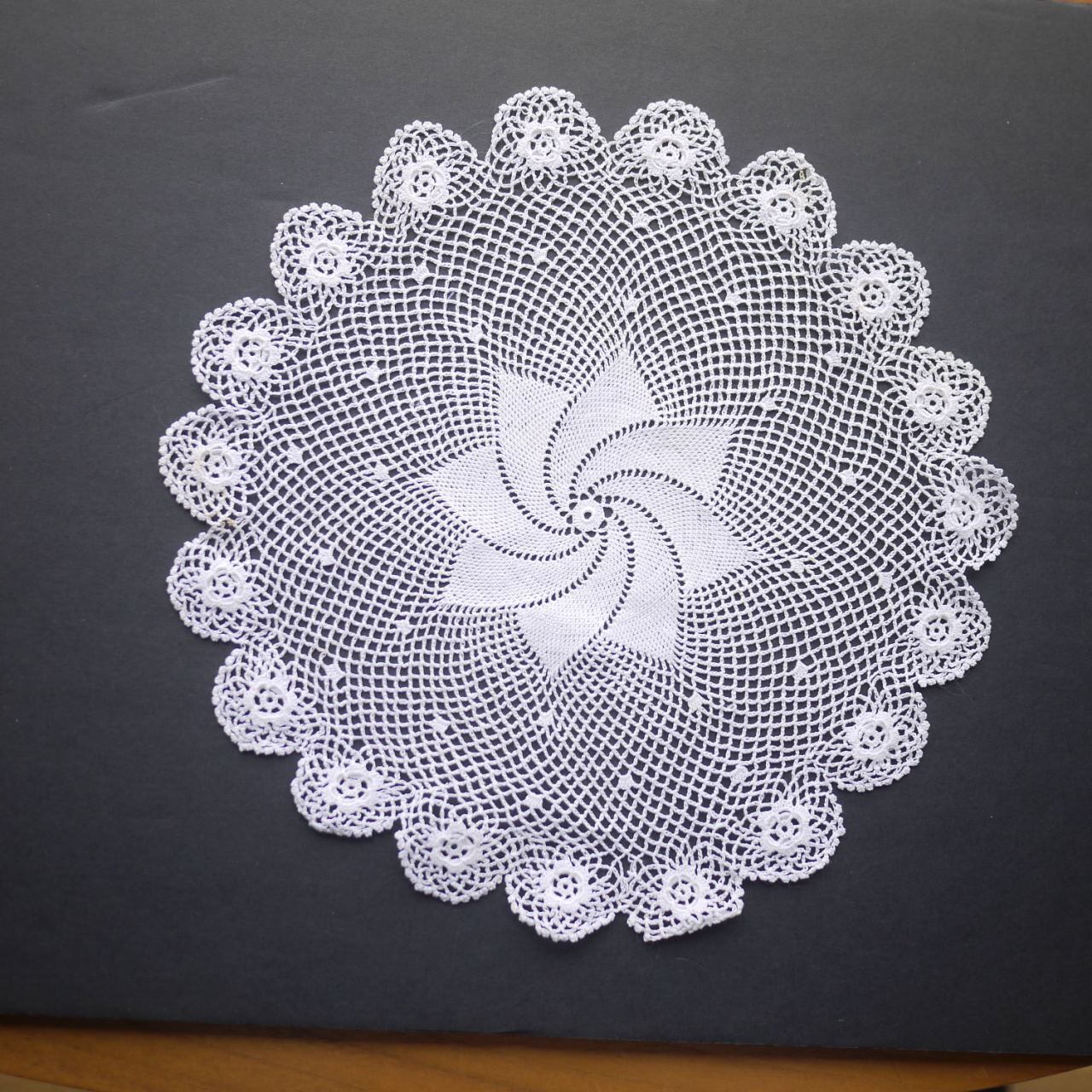 縁の小薔薇が立体になった優雅な白いドイリー。