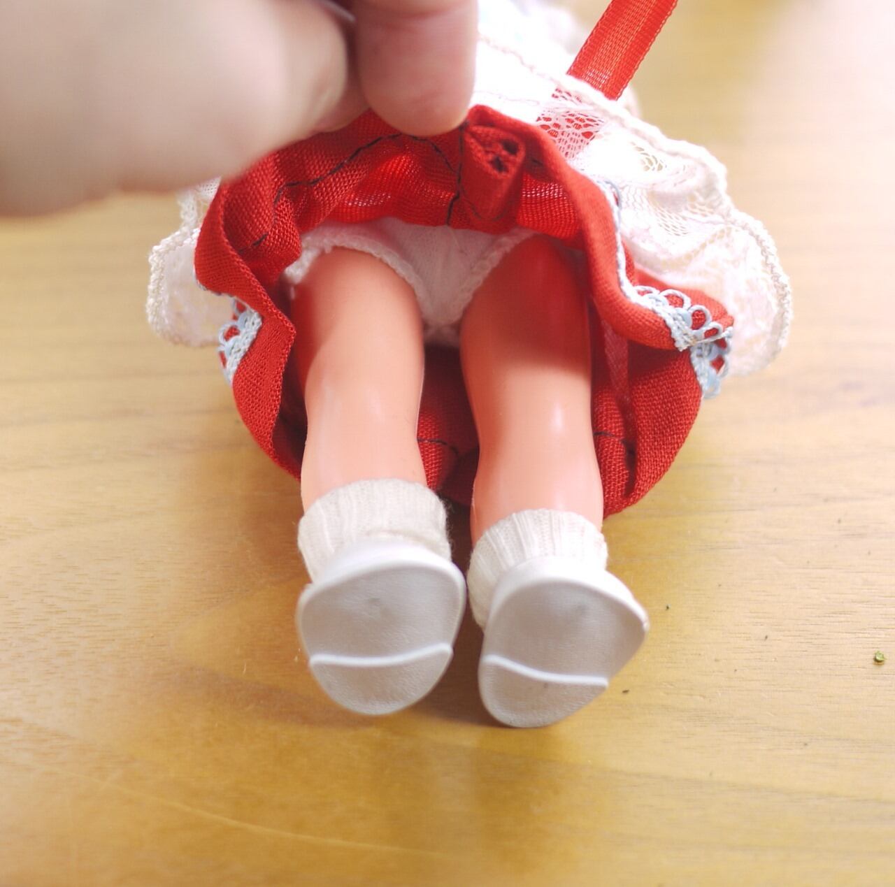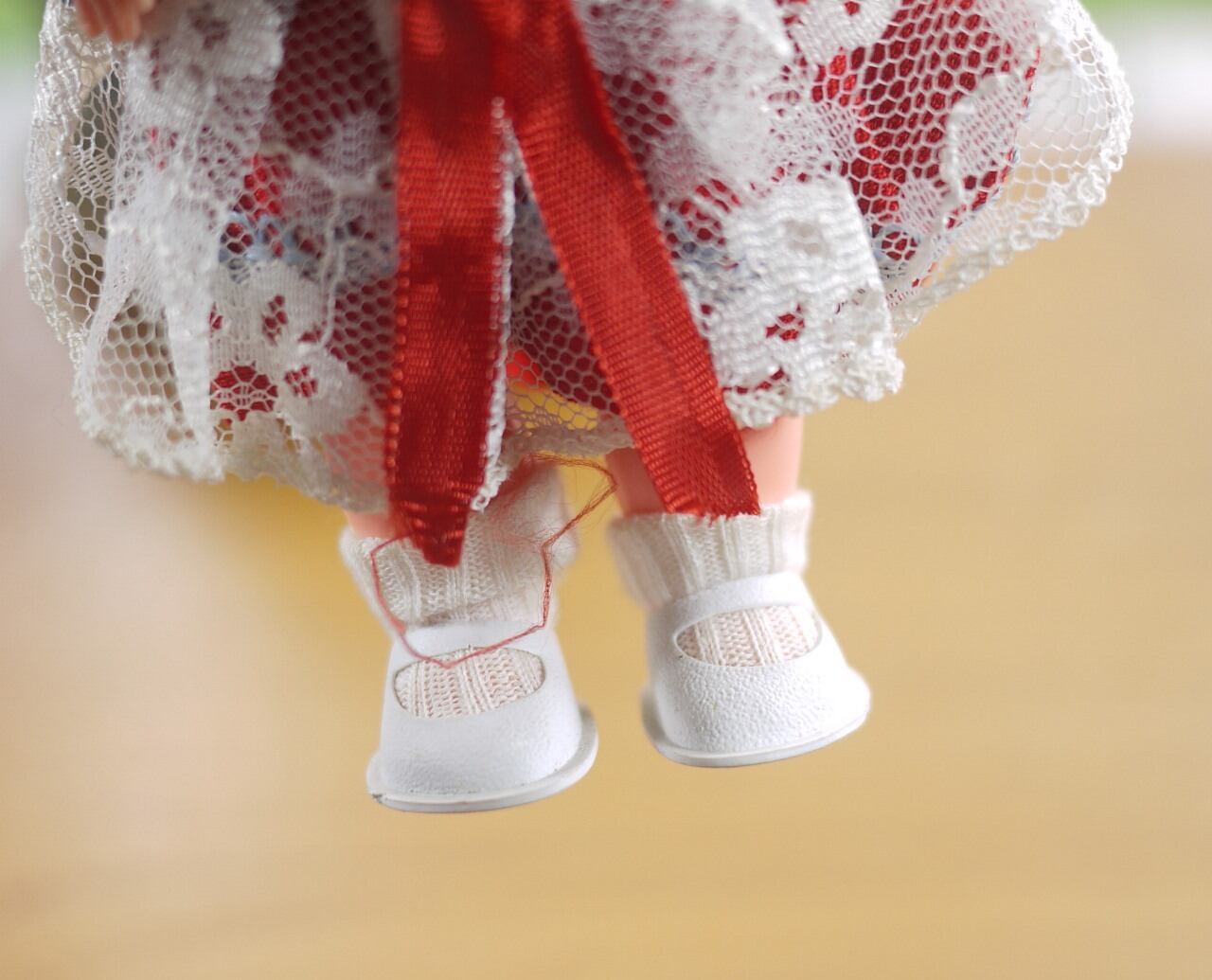 可愛いストラップシューズとソックスの足元はバランスをとると自立します。