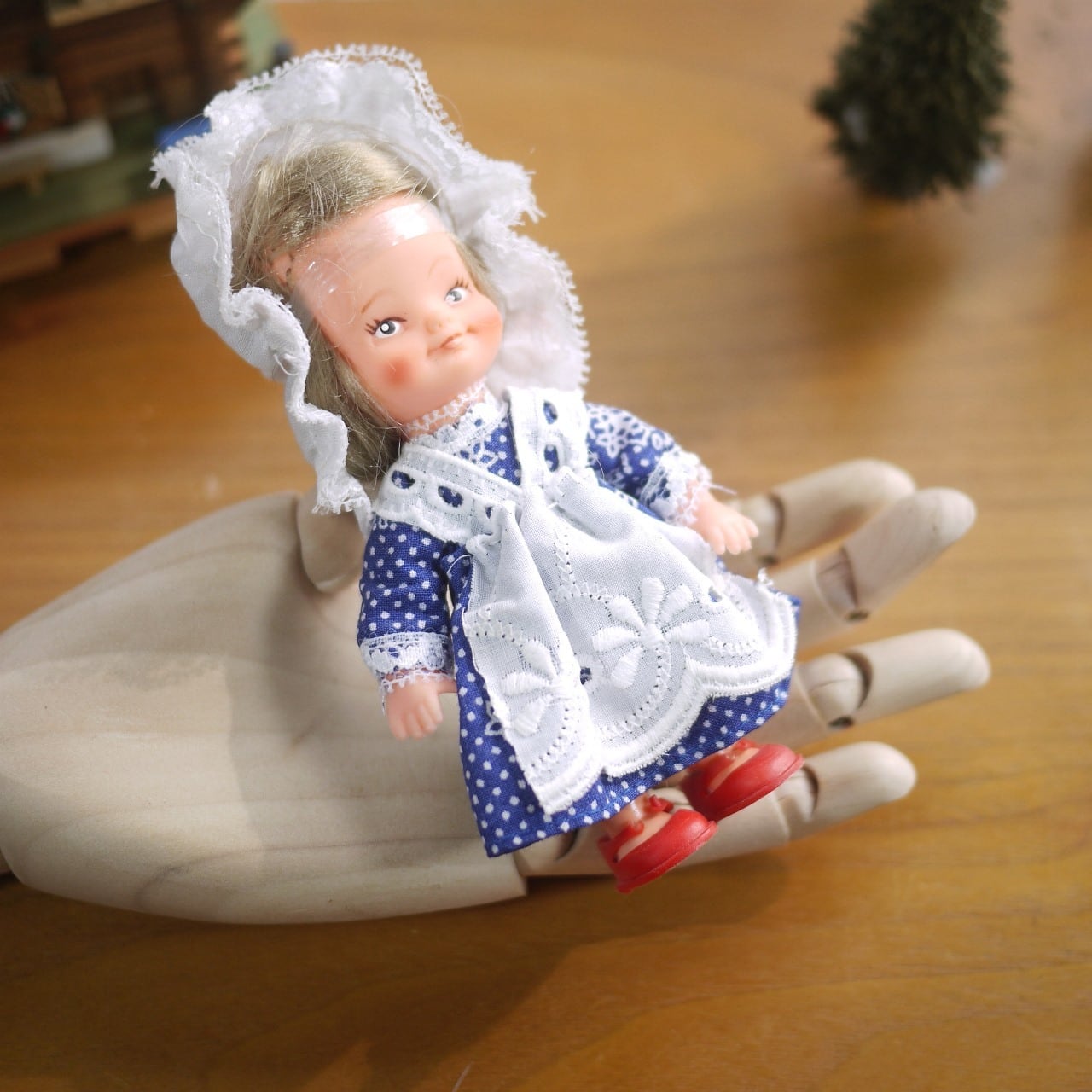 レース襟のドットワンピに白いエプロンがかわいいです。