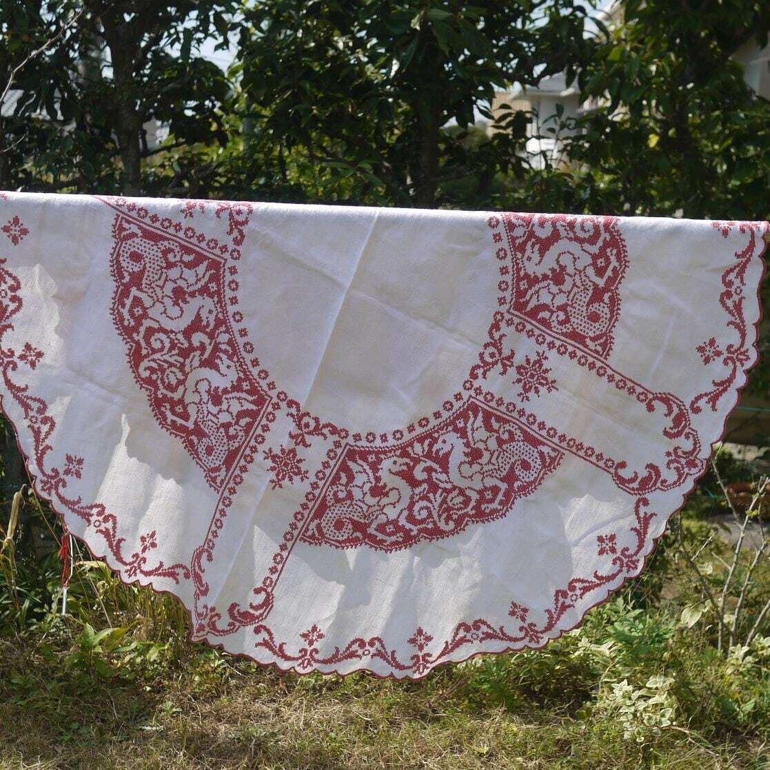 レッドワーク ドラゴン 大判丸いテーブルクロス ドイツ]