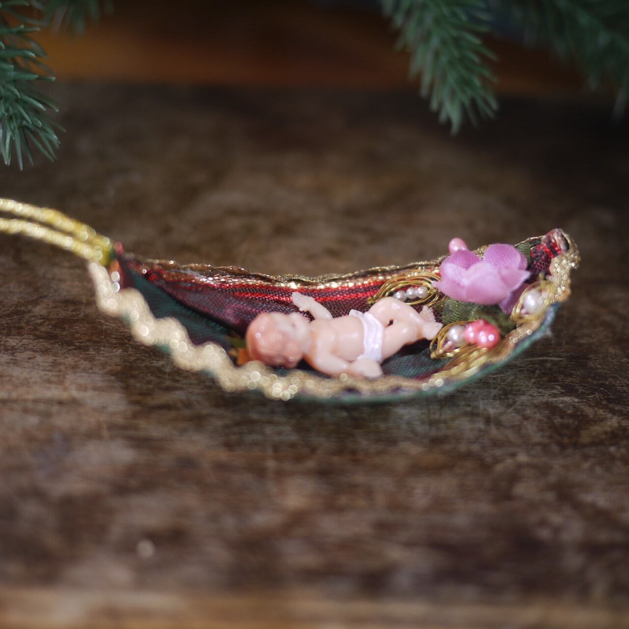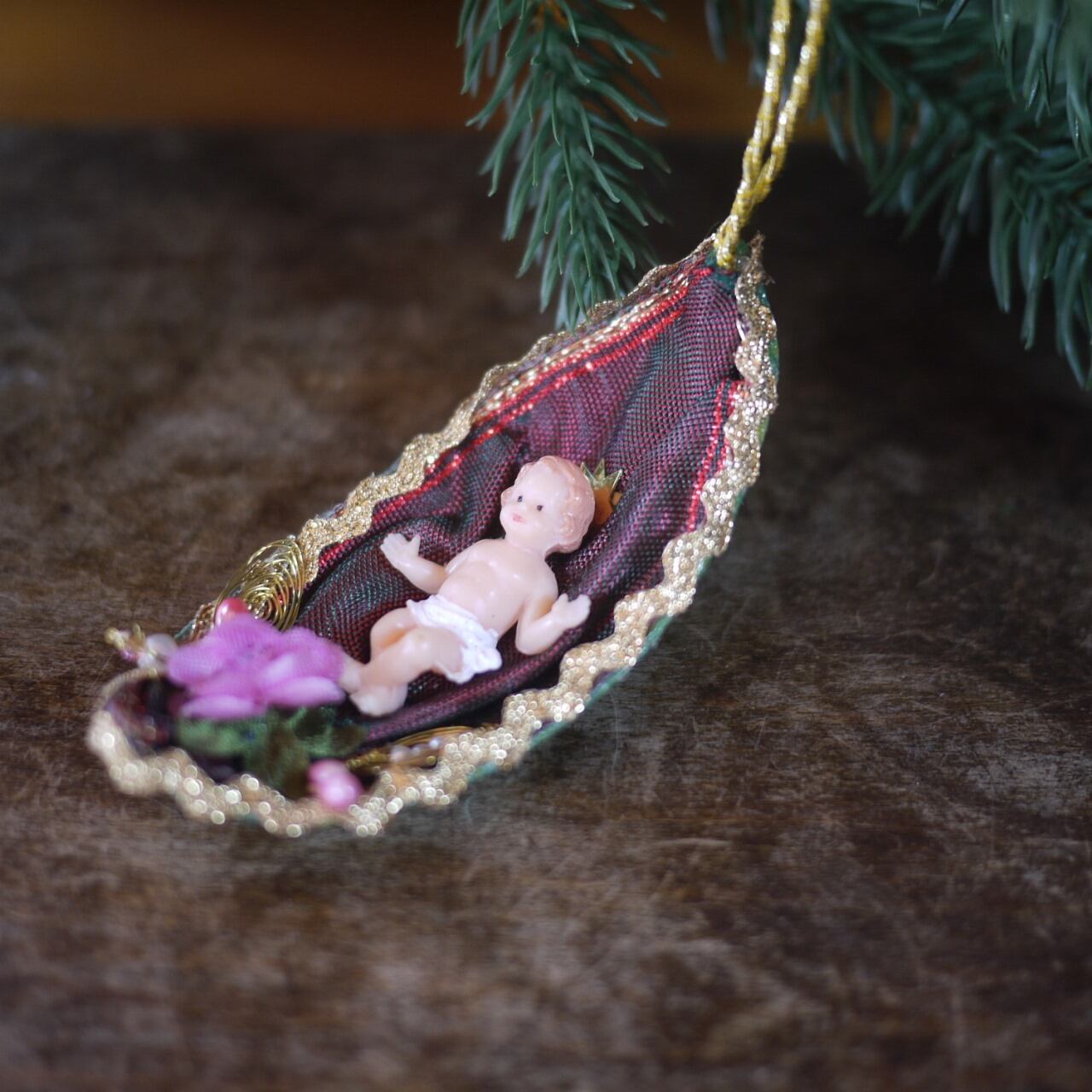 三日月形のシェルの中に後光輝く小さなイエス像です。