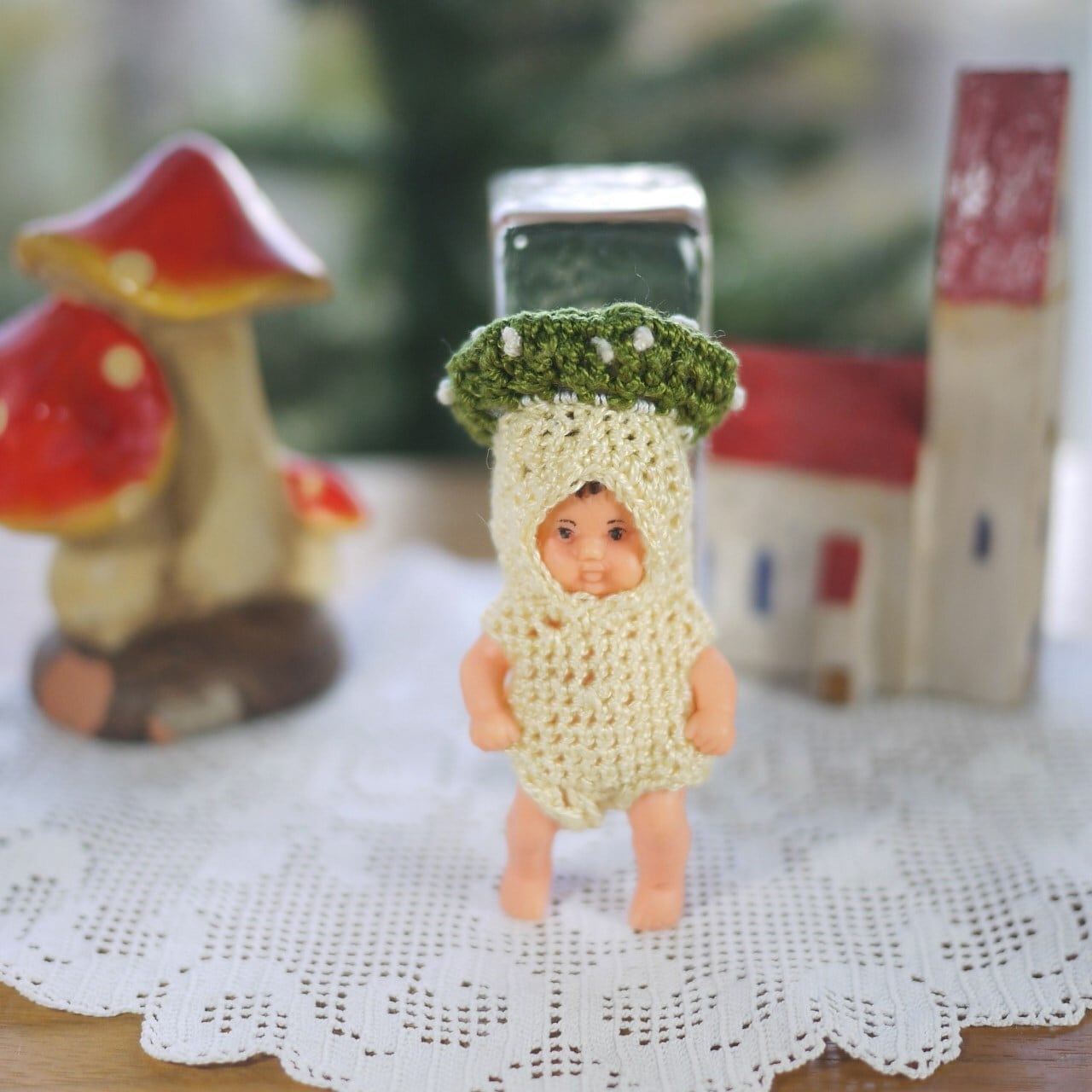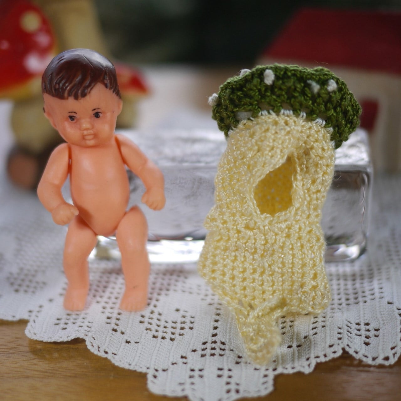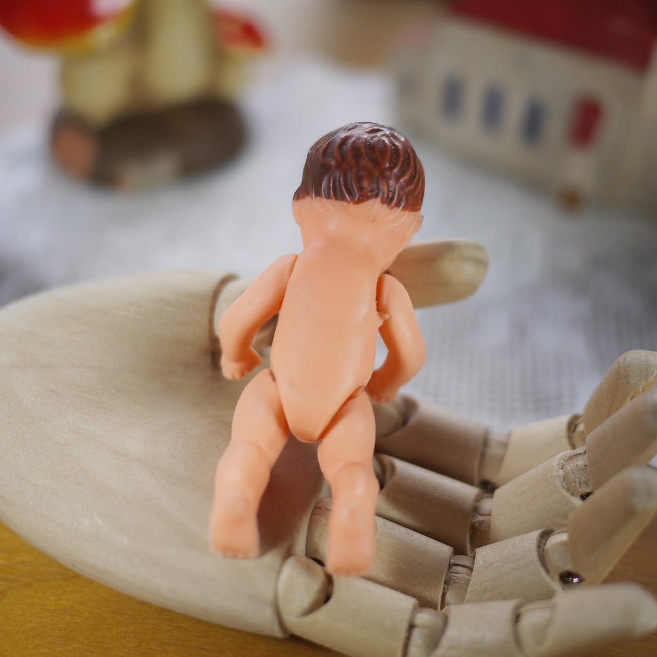 ひざを曲げた赤ちゃん体形です。お座りができます。自立しません。