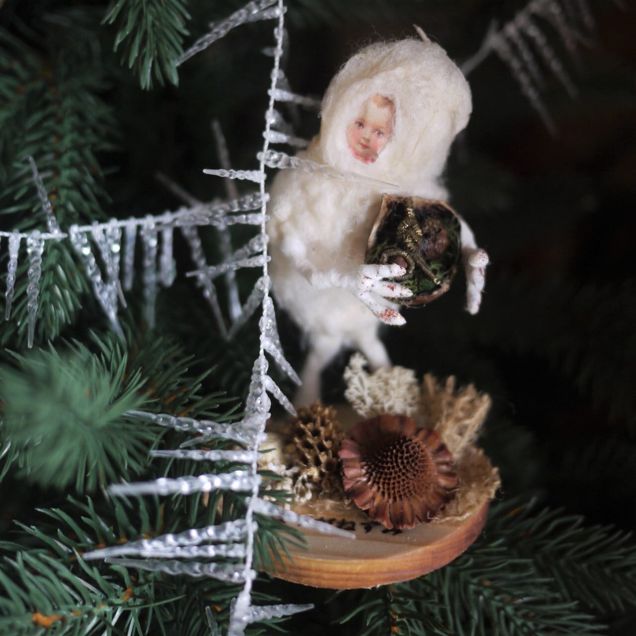 飾りには、古い手芸素材や針金細工Bouillon、乾燥木の実を使っています。
