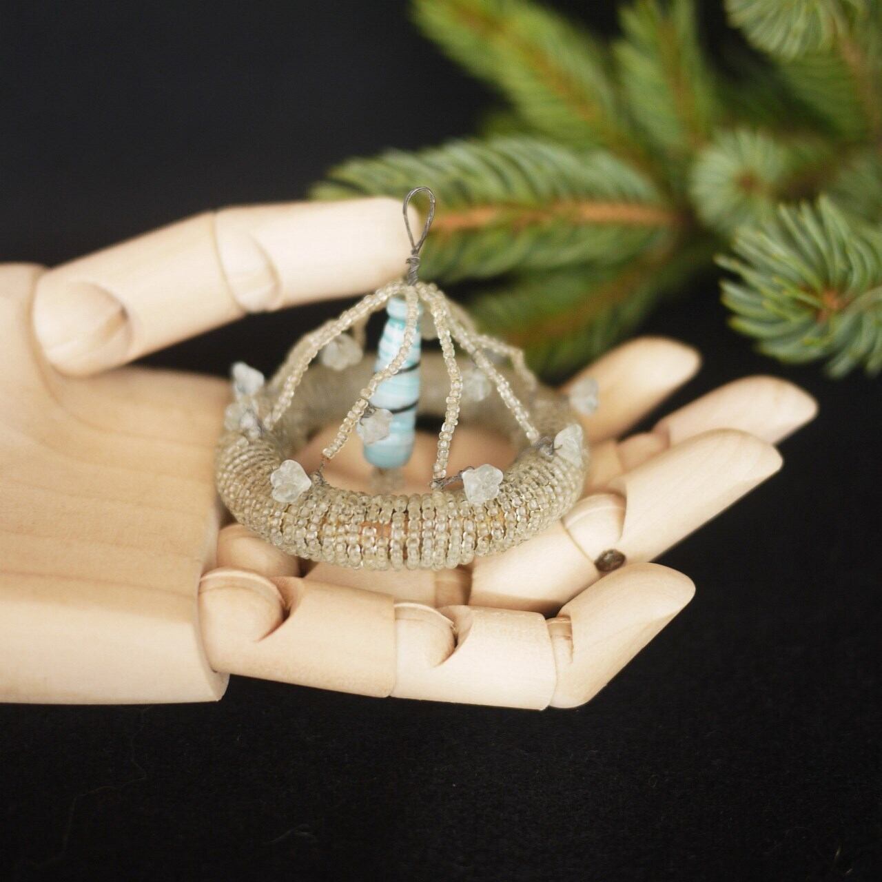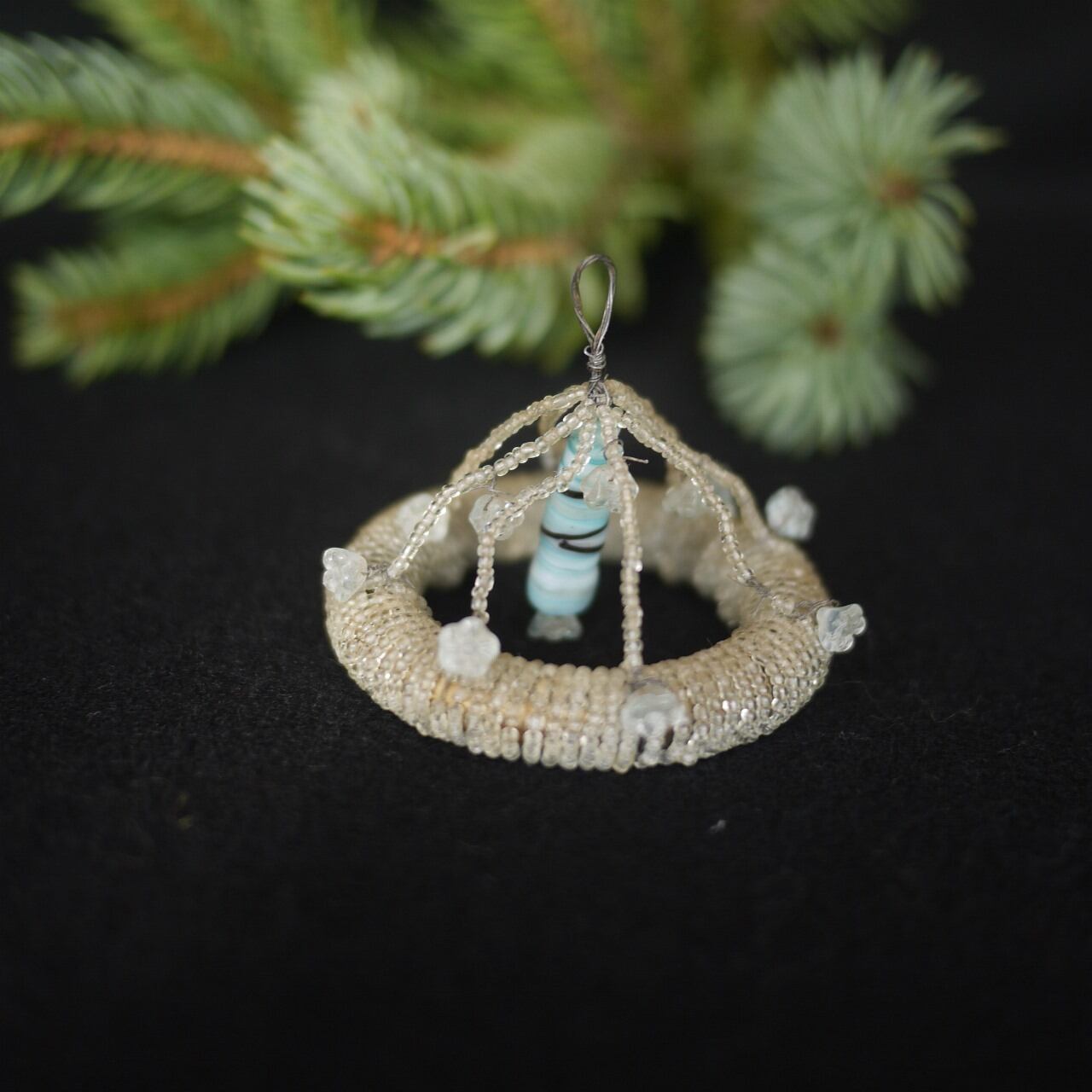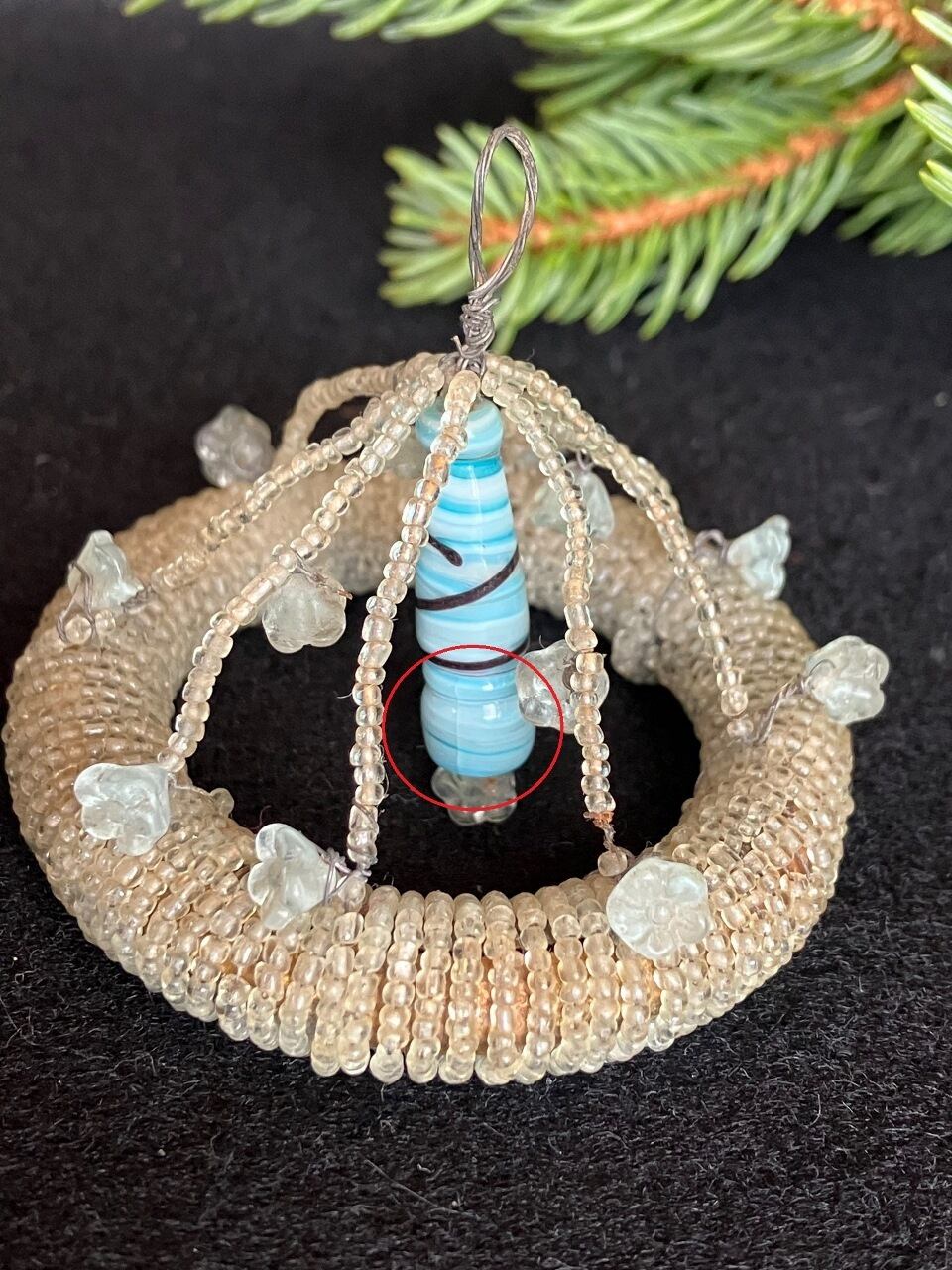 ドーム型に組み上げられ中央にとんぼ玉状の水色縞柄ビーズが