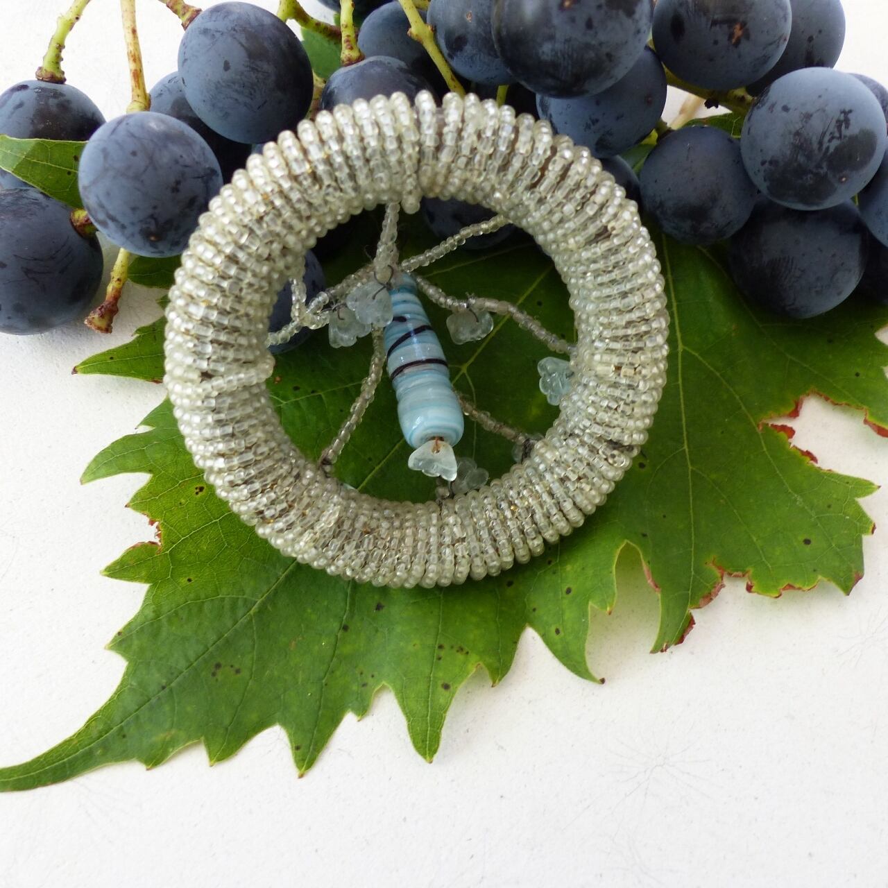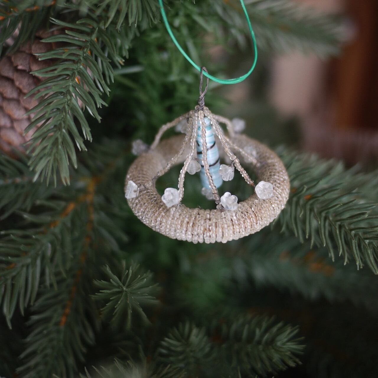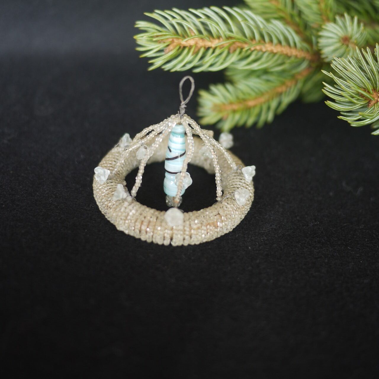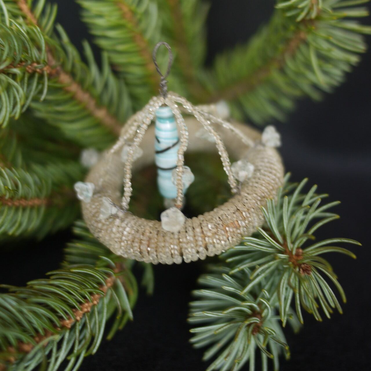 ドーム型に組み上げられ中央にとんぼ玉状の水色縞柄ビーズが