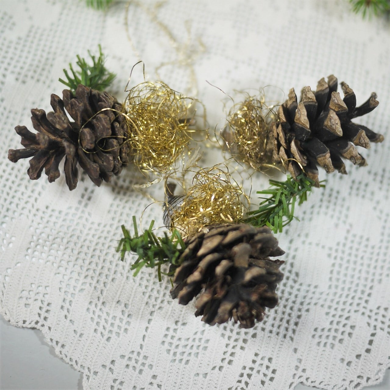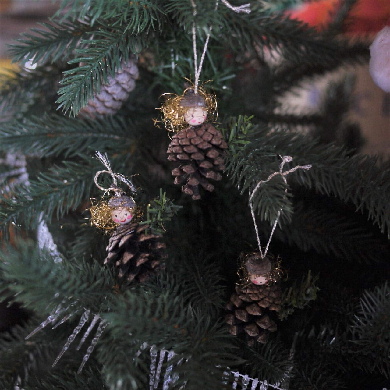 松ぼっくりを使ったクリスマスツリーオーナメントを作りました。