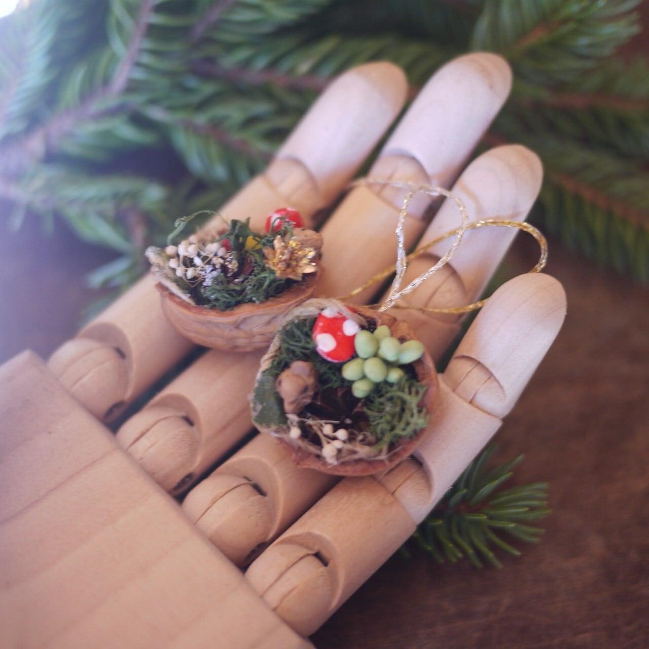 中にはキノコやドライ木の実、ハリネズミなどをとじこめ、