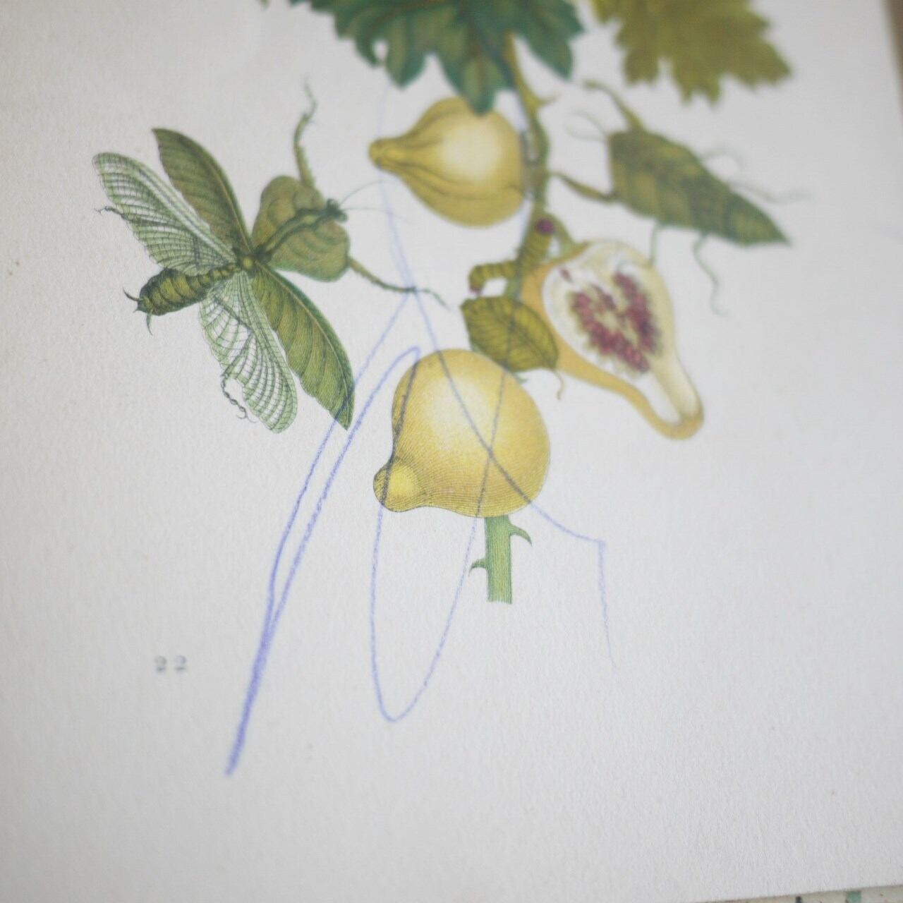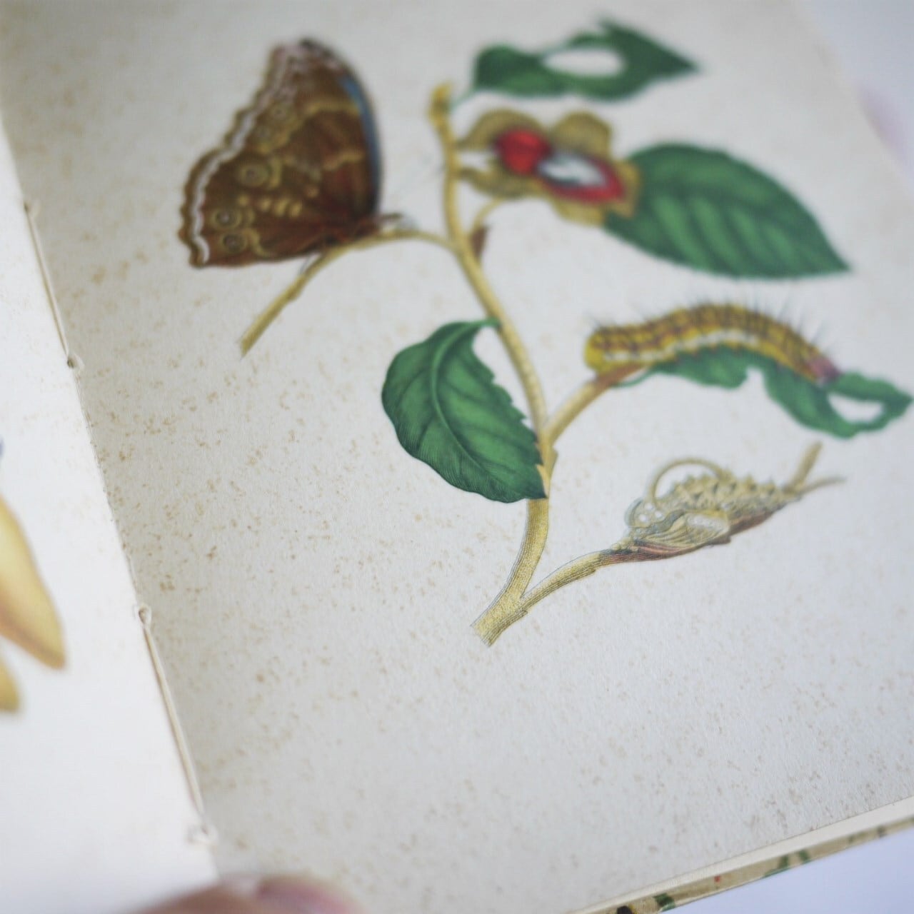 熱帯の色鮮やかな昆虫や植物が克明にスケッチされています。
