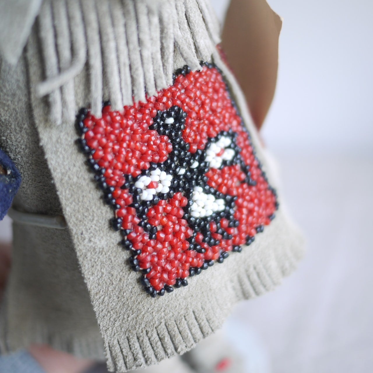 フリンジの効いたスエードの衣装はビーズで装飾されれいます。