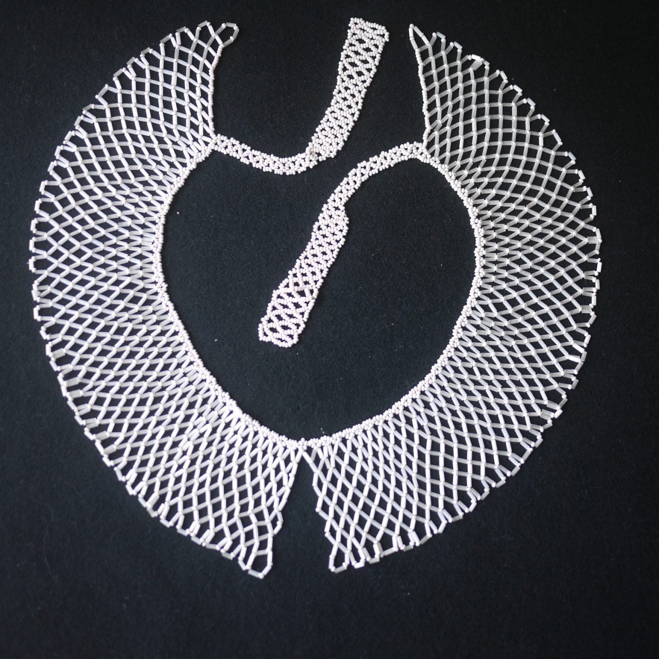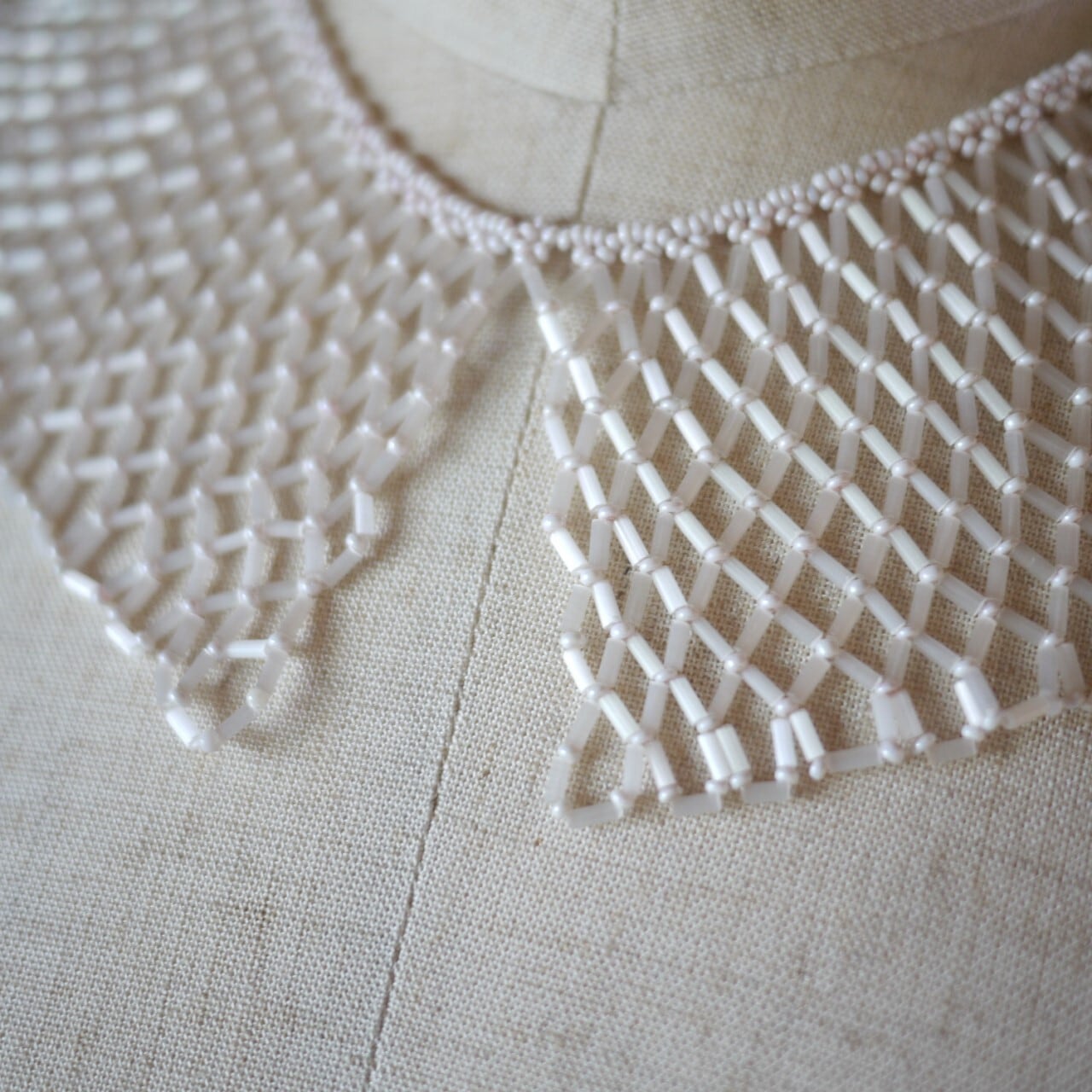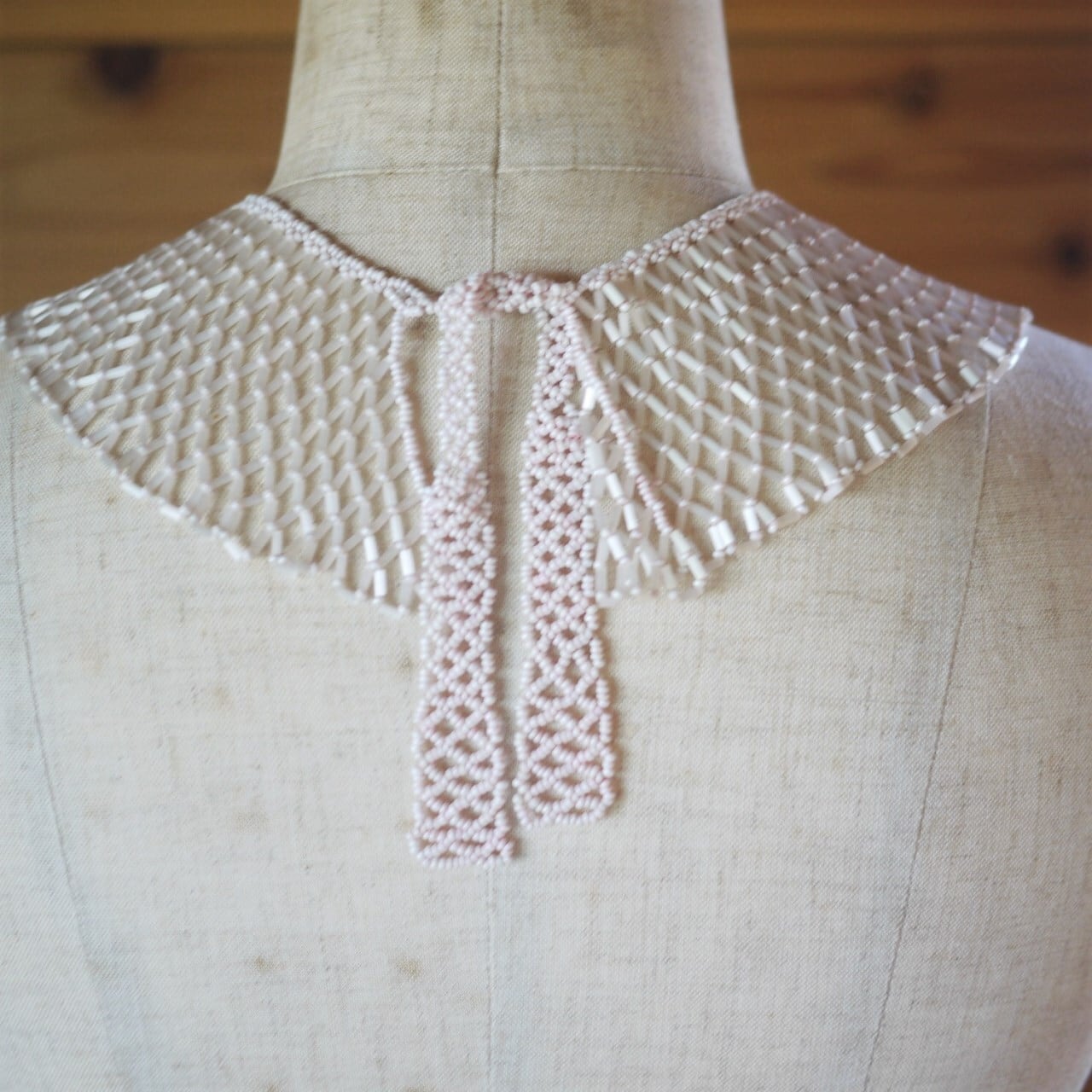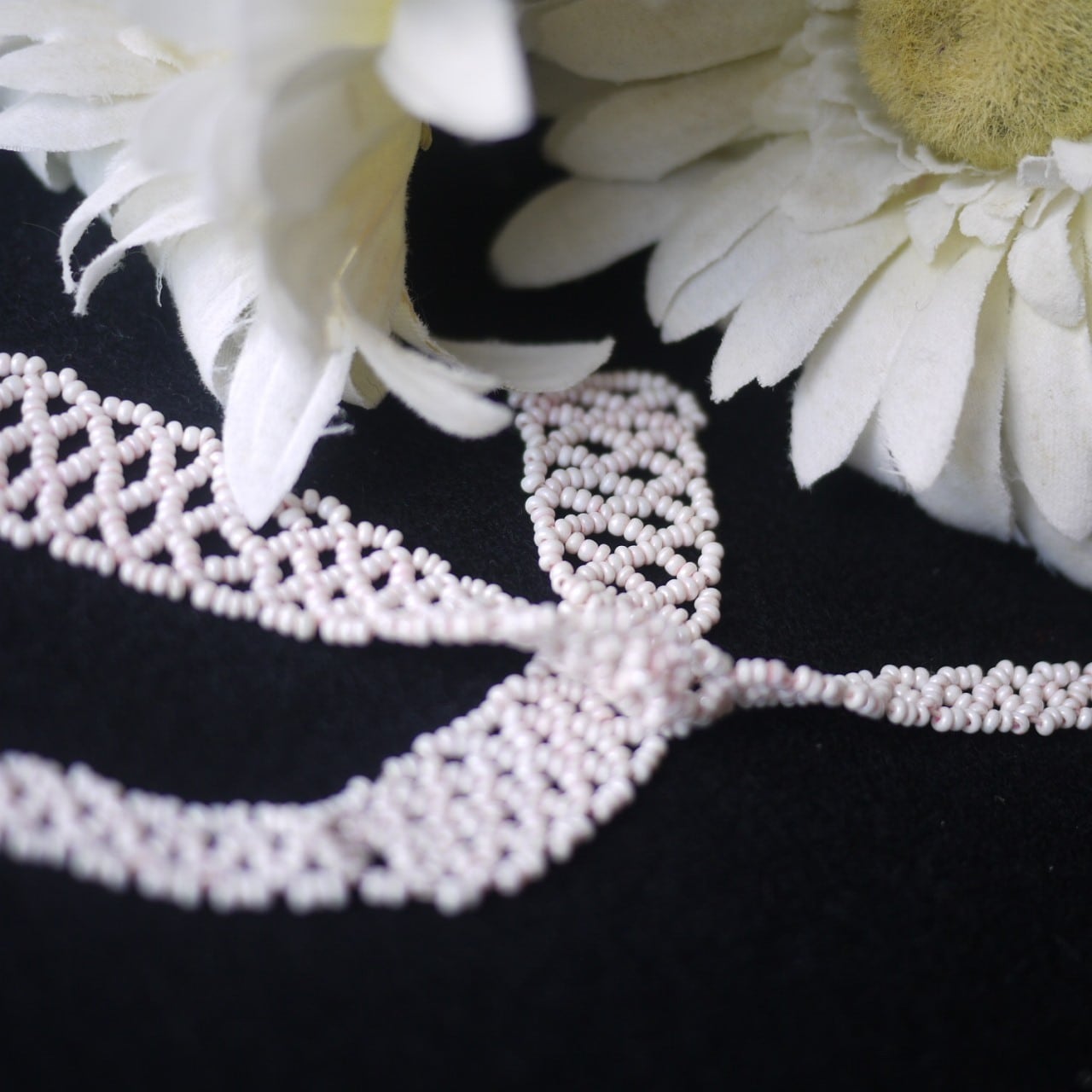 淡いピンクの竹ビーズと小さなビーズが織りなすレース模様です。