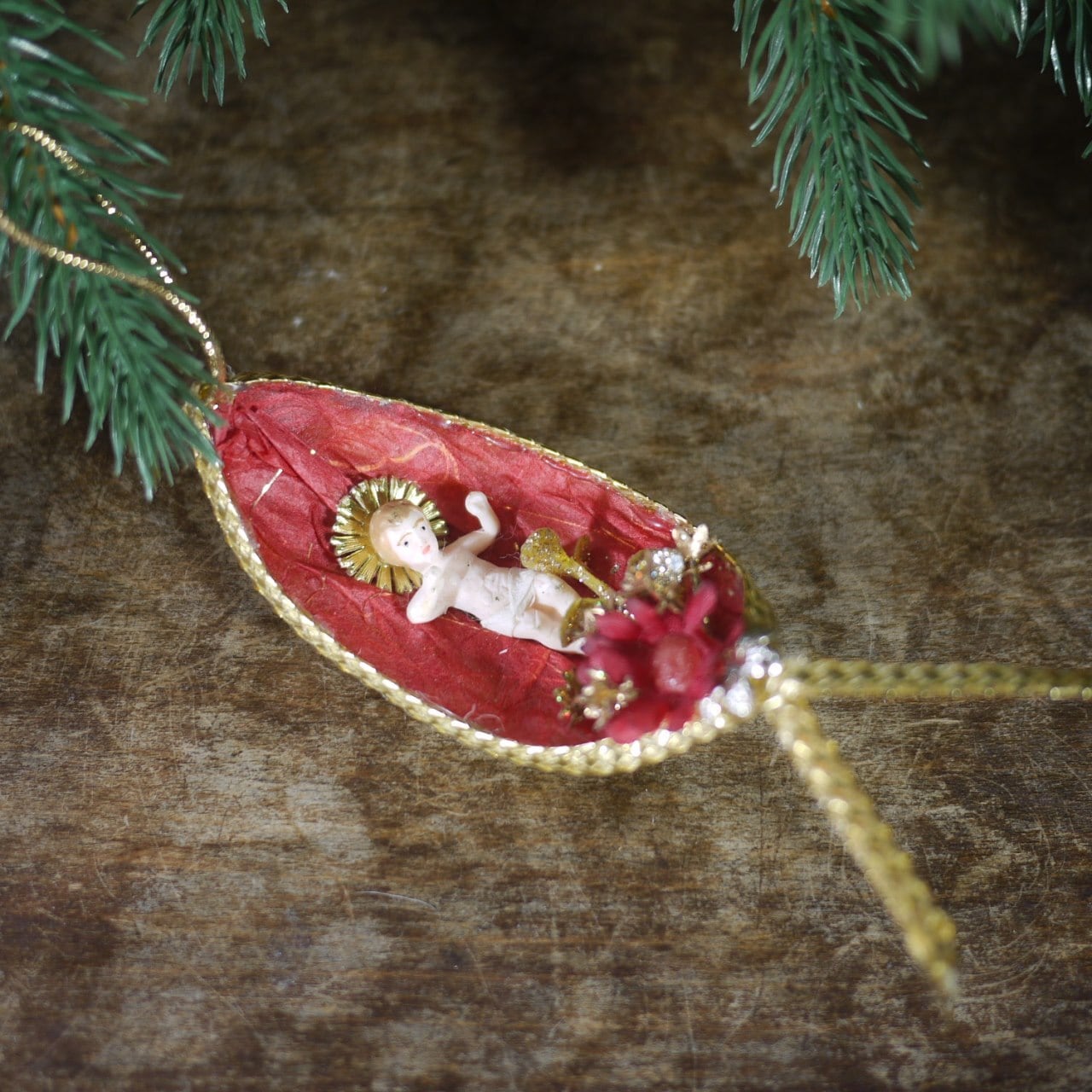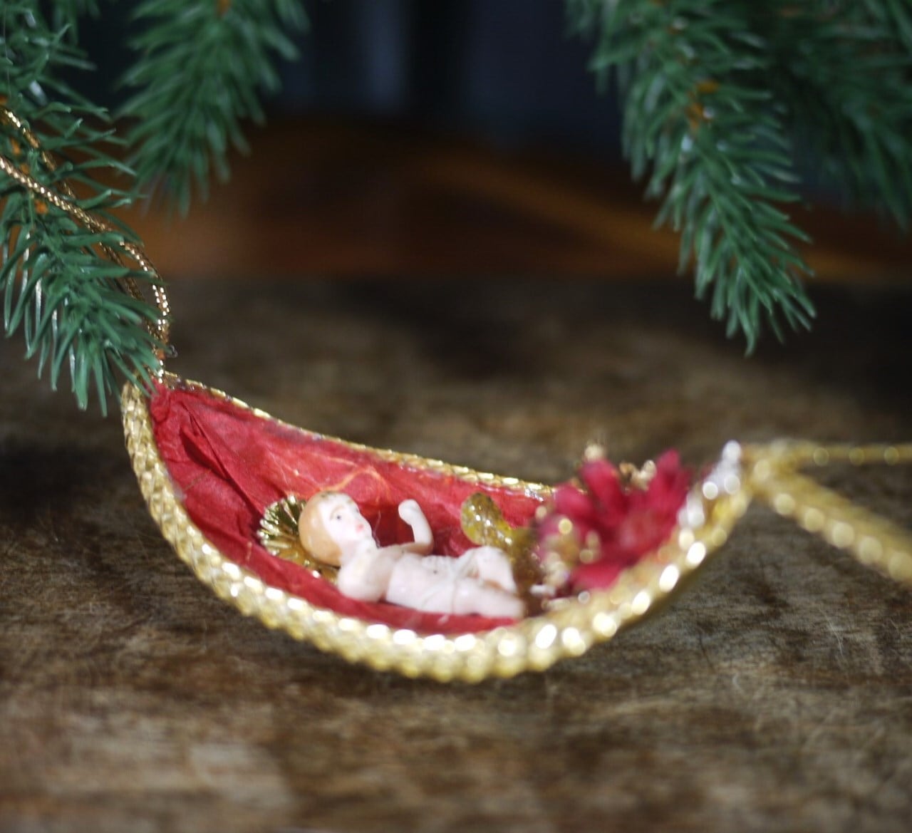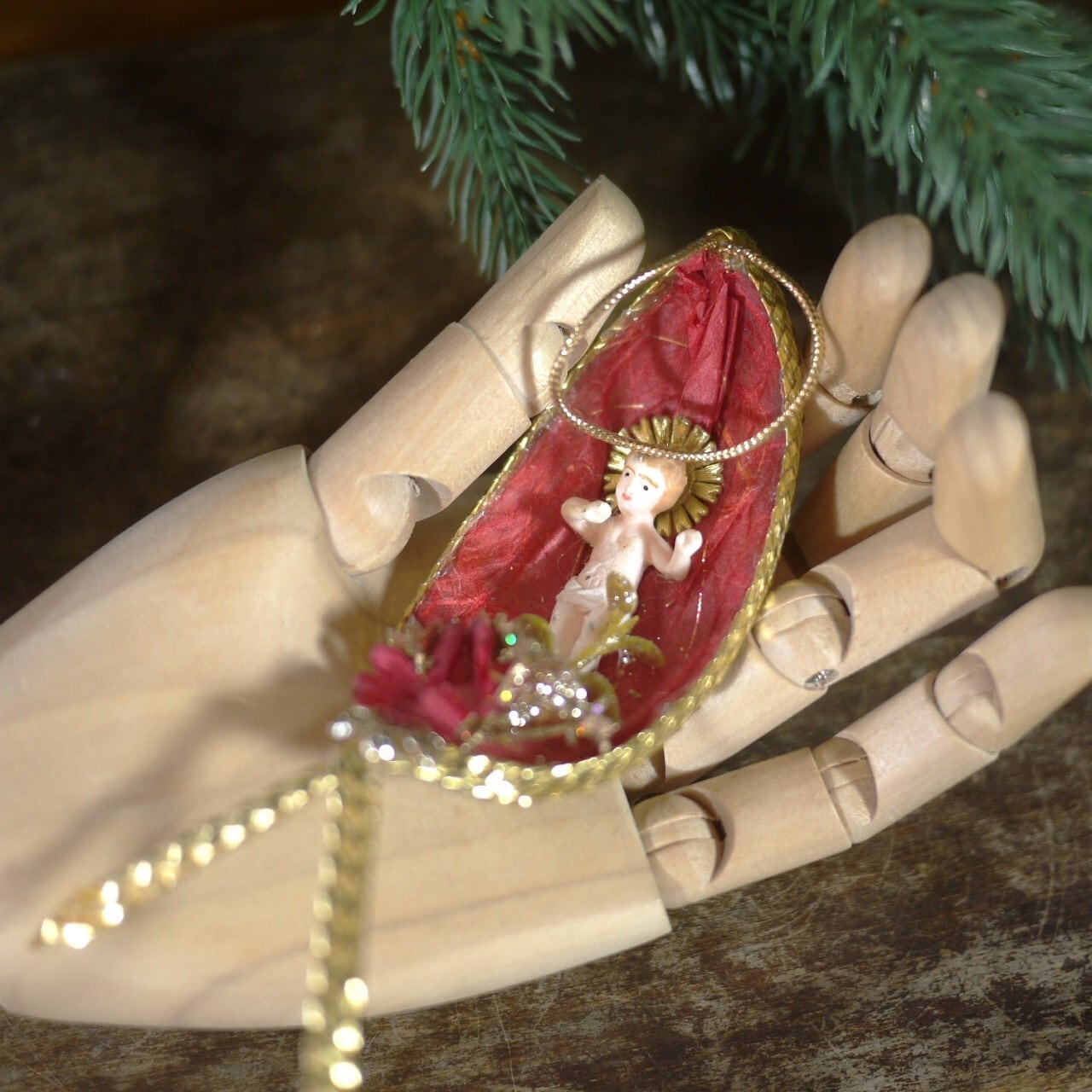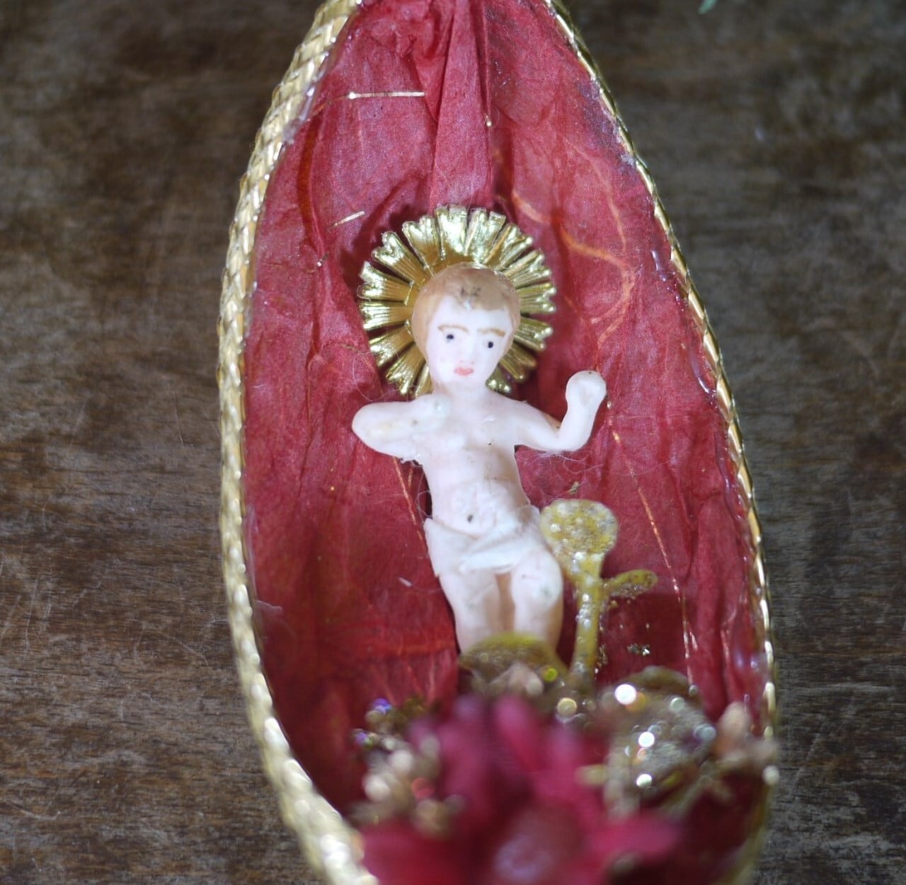 三日月形のシェルの中に後光輝く小さなイエス像です。
