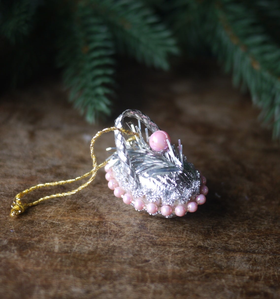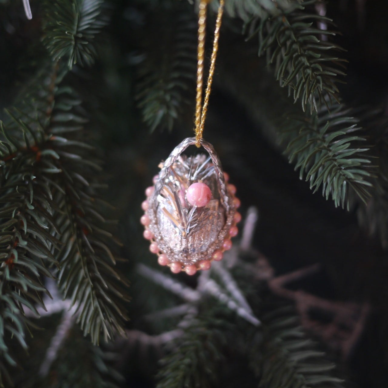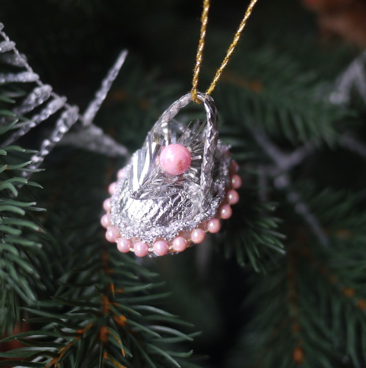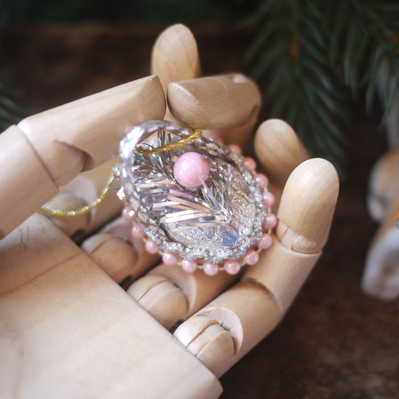 ピンクの粒と銀のブレードに包まれて、ちょっと近未来的な不思議な装飾です。
