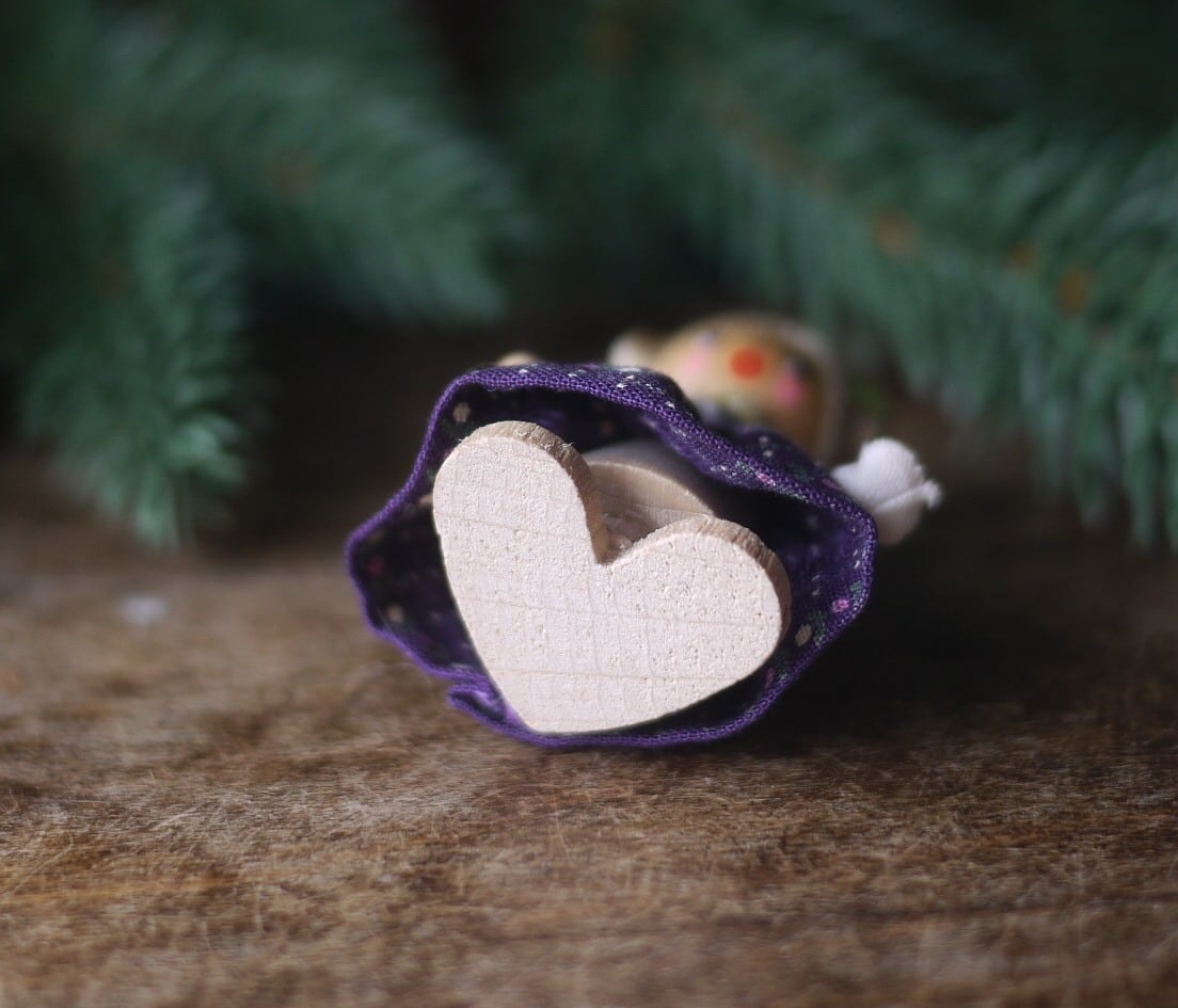 紫ベースのコットンワンピースと白い袖、木製の頭部、
