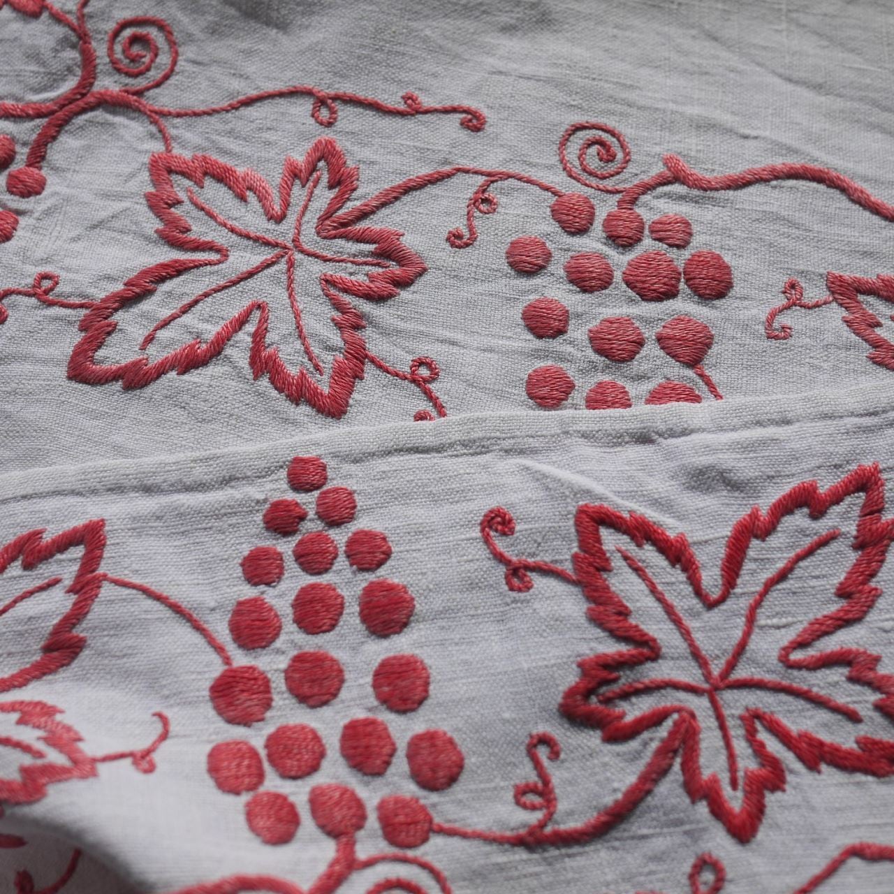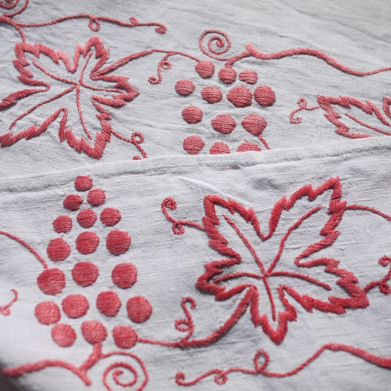 リネン素材に赤の刺繍糸で厚みのある刺繍が施されています。