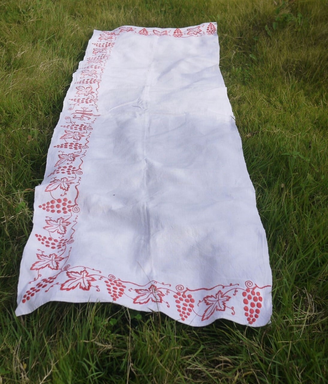 テーブルの前に垂らして使うため、刺繍は前面縁と両側サイド縁。