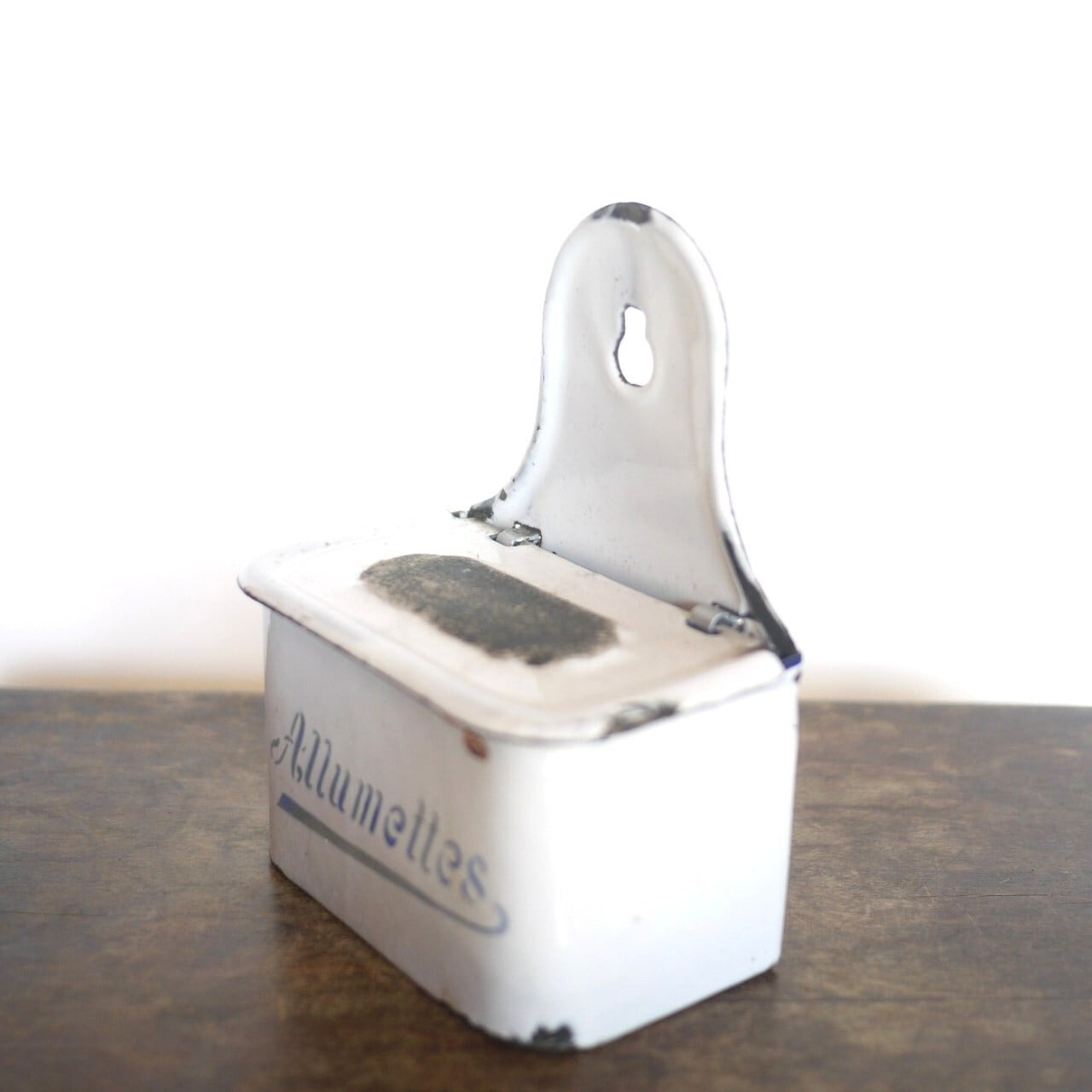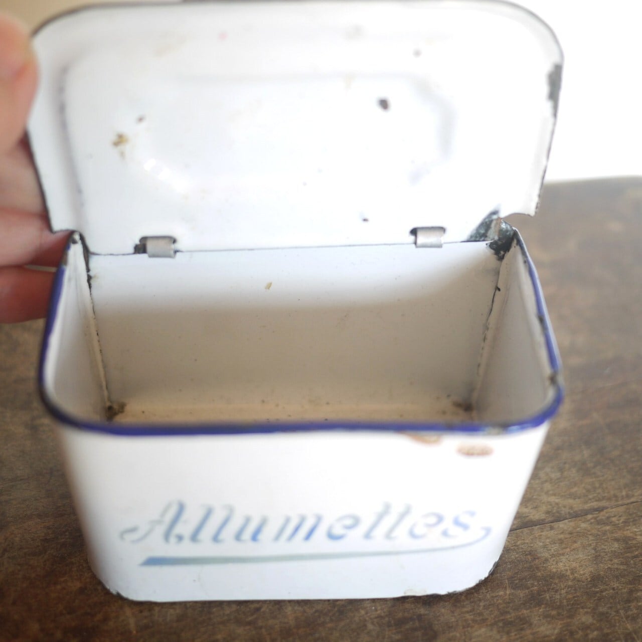 フランスの古いホーロー製のアリュメット缶、マッチ入れ。