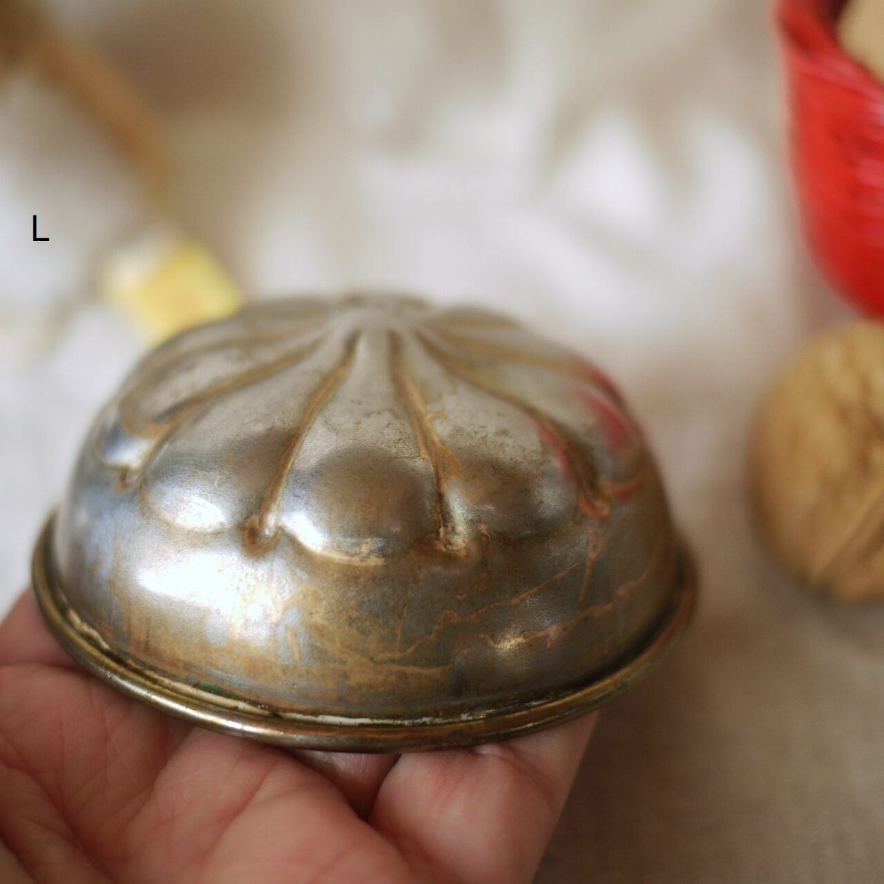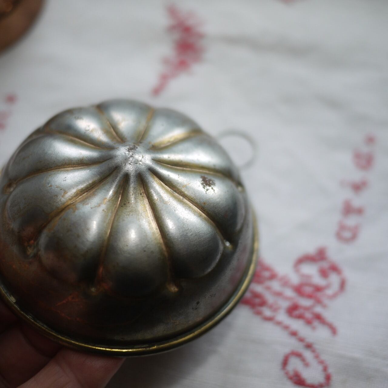 錫色の花びら模様のモールドに表側に胴の退色が見られ錫色と